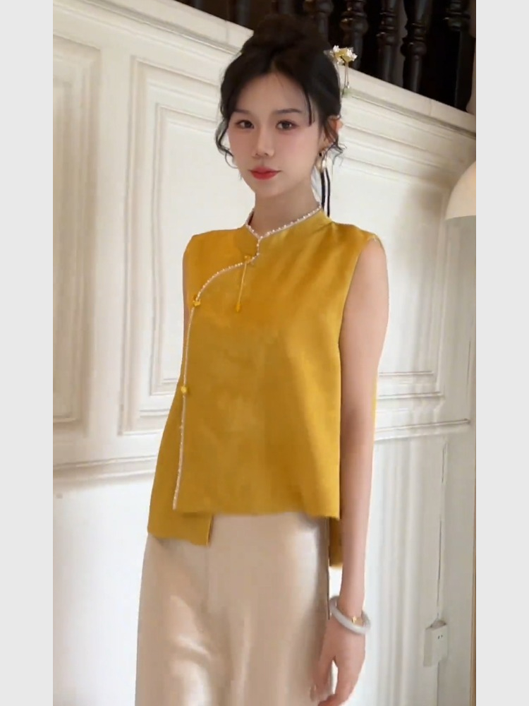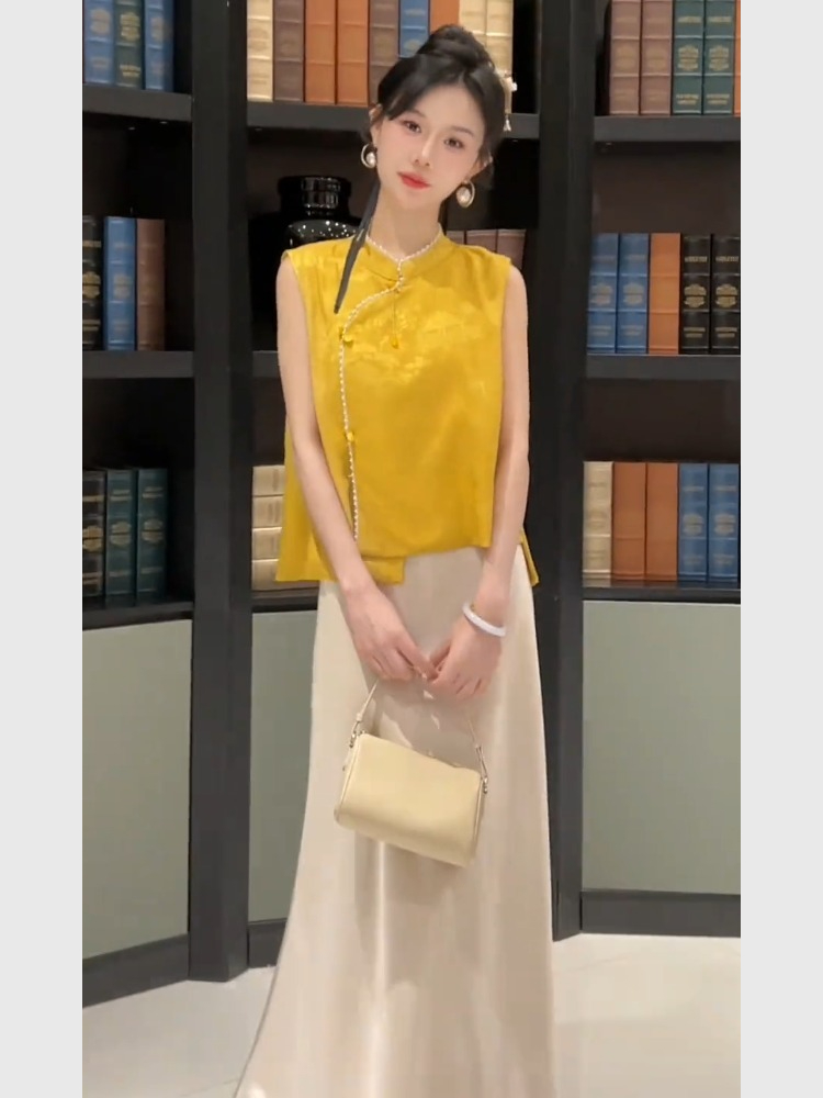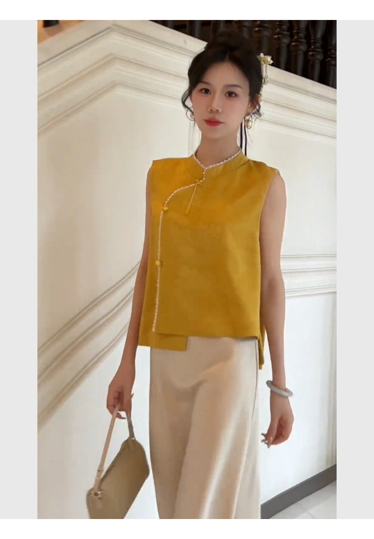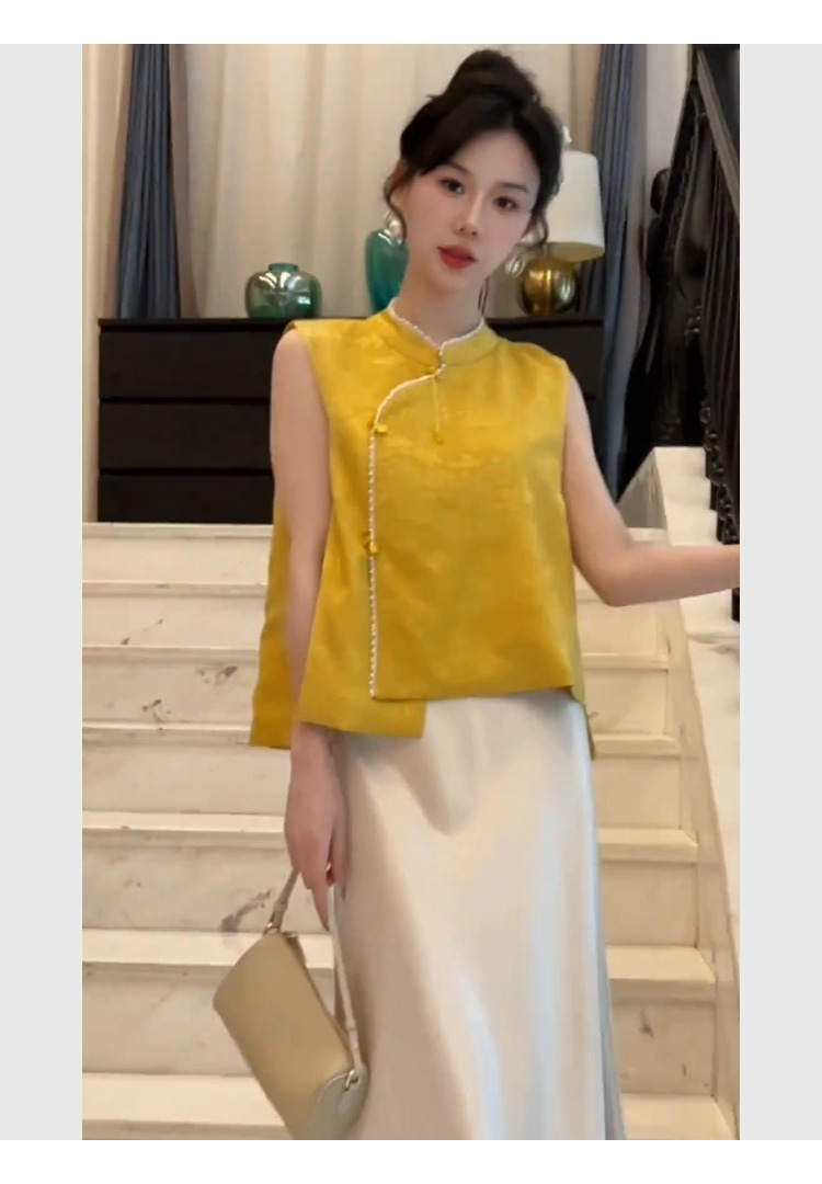 | color classification | New Chinese style yellow stand up collar sleeveless shirt top set New Chinese style yellow stand up collar sleeveless shirt top+beige skirt |
