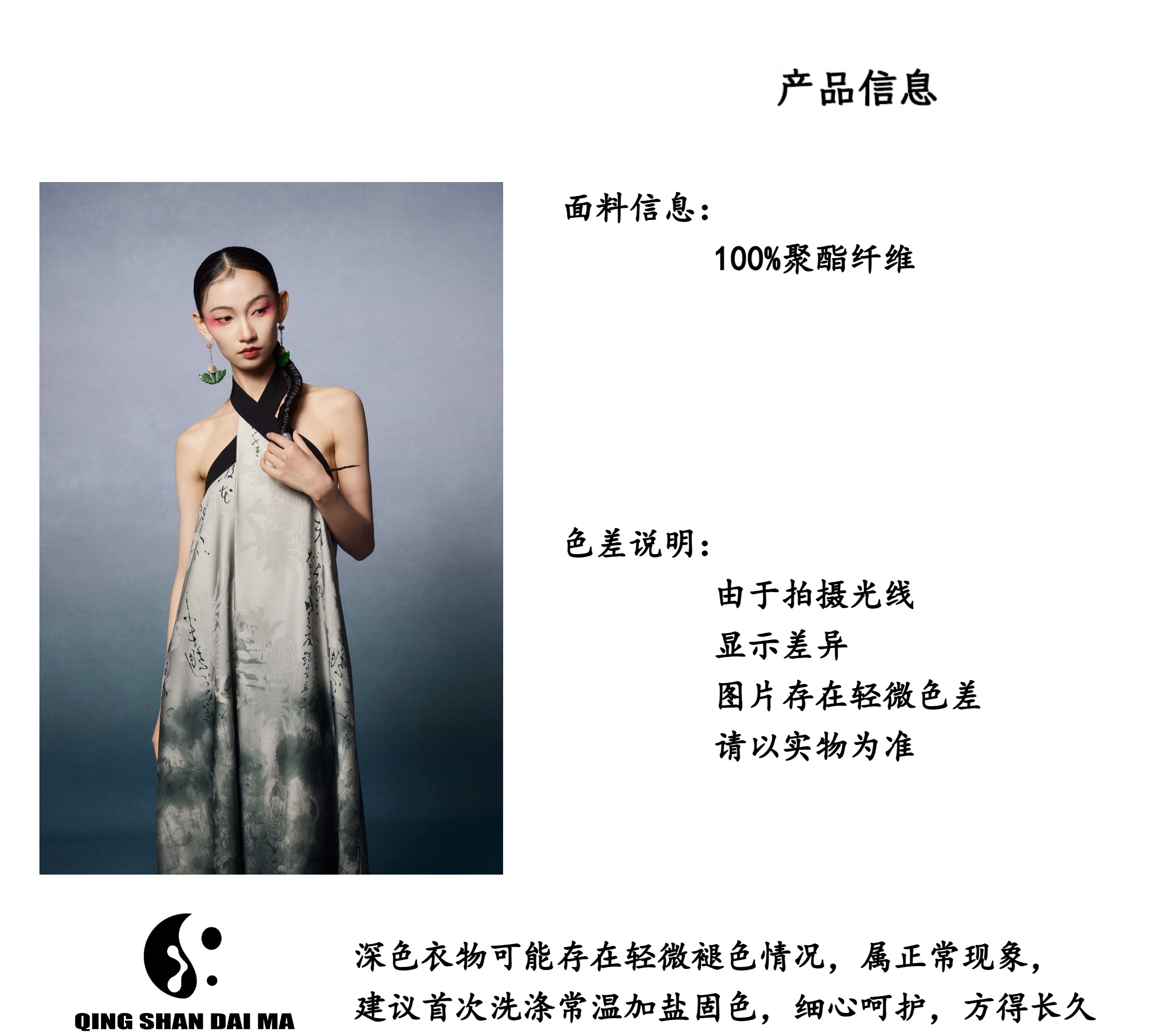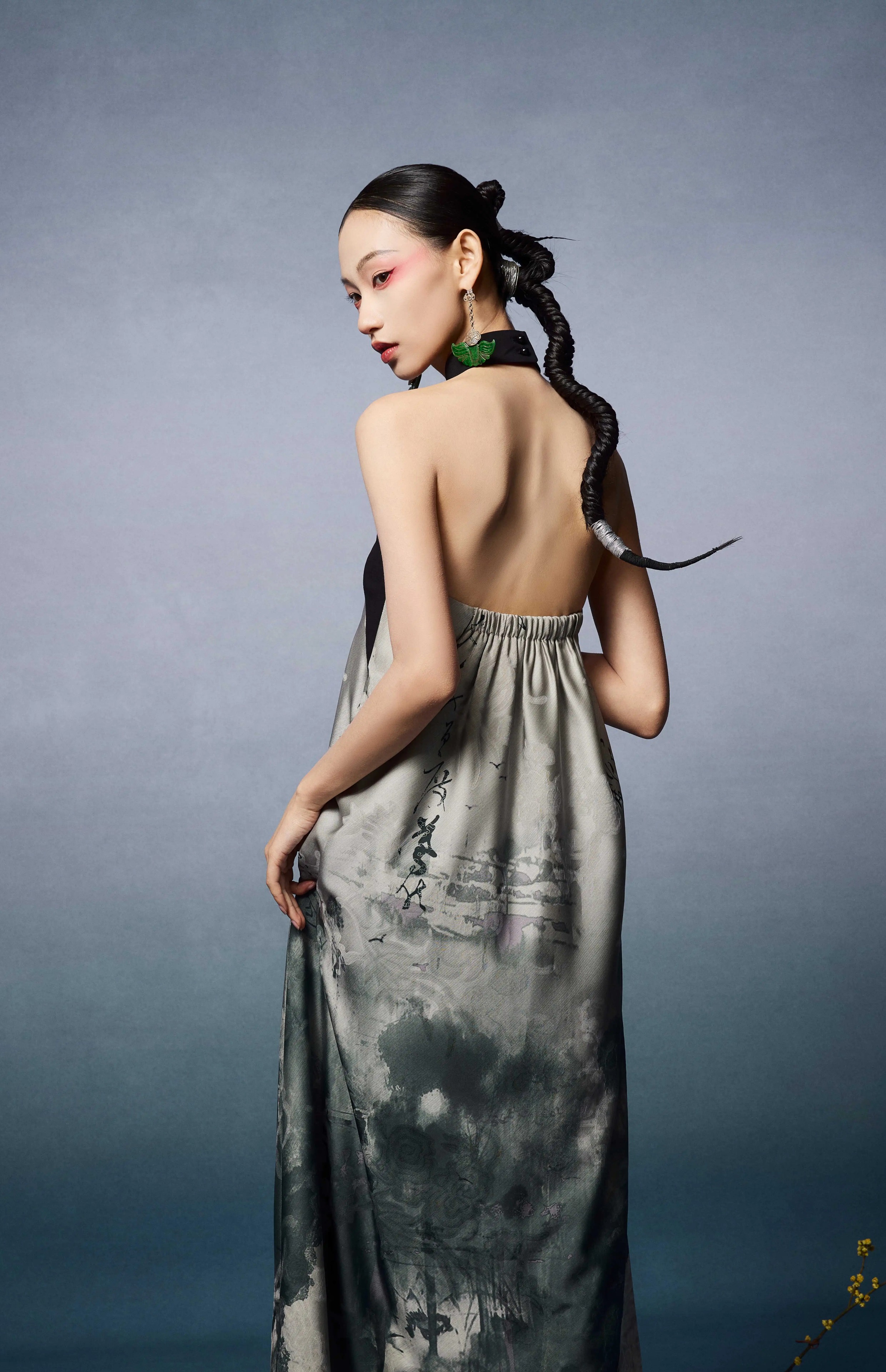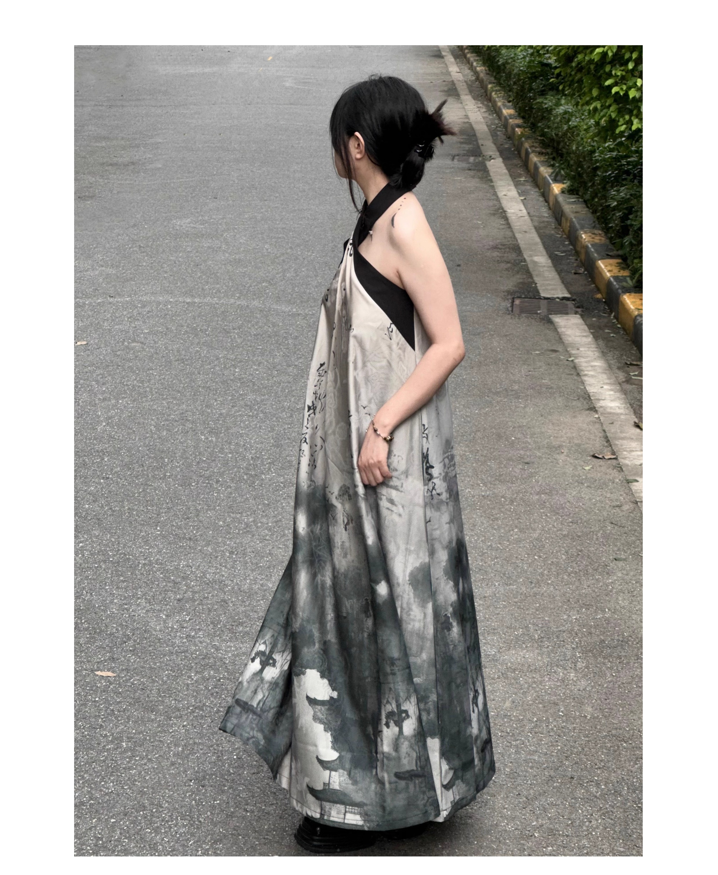 ASAYA3456 Backless Halter Dress with Chinese Zen Print
