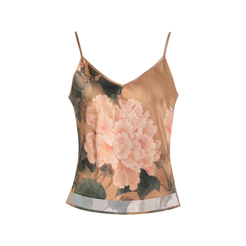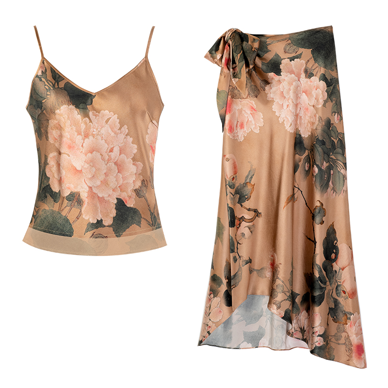 Color classification | Yellow brown peony print suspender top, yellow brown peony print half skirt |