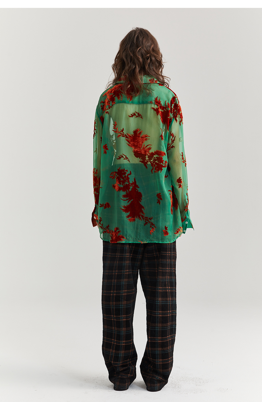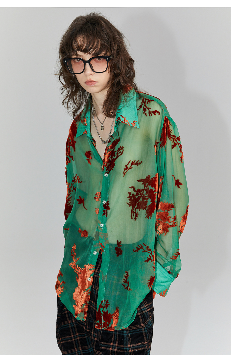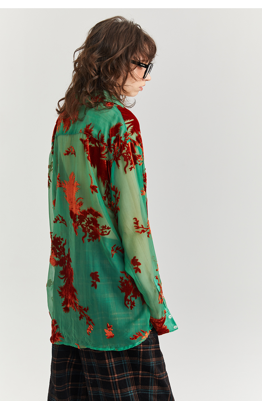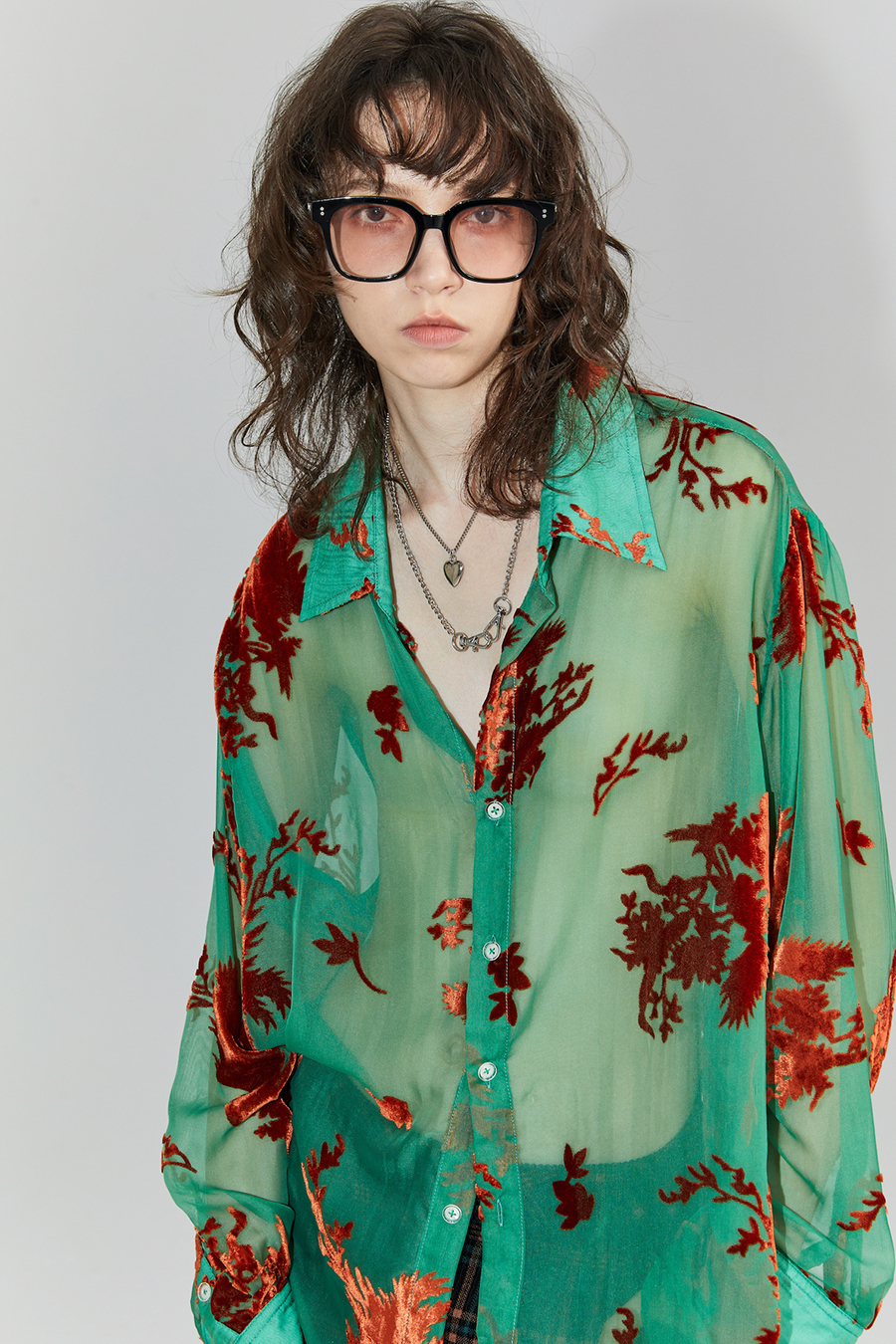 Asaya2098 : Vintage Phoenix Flocked Silk Georgette Green Sheer Loose Shirt (Unisex)