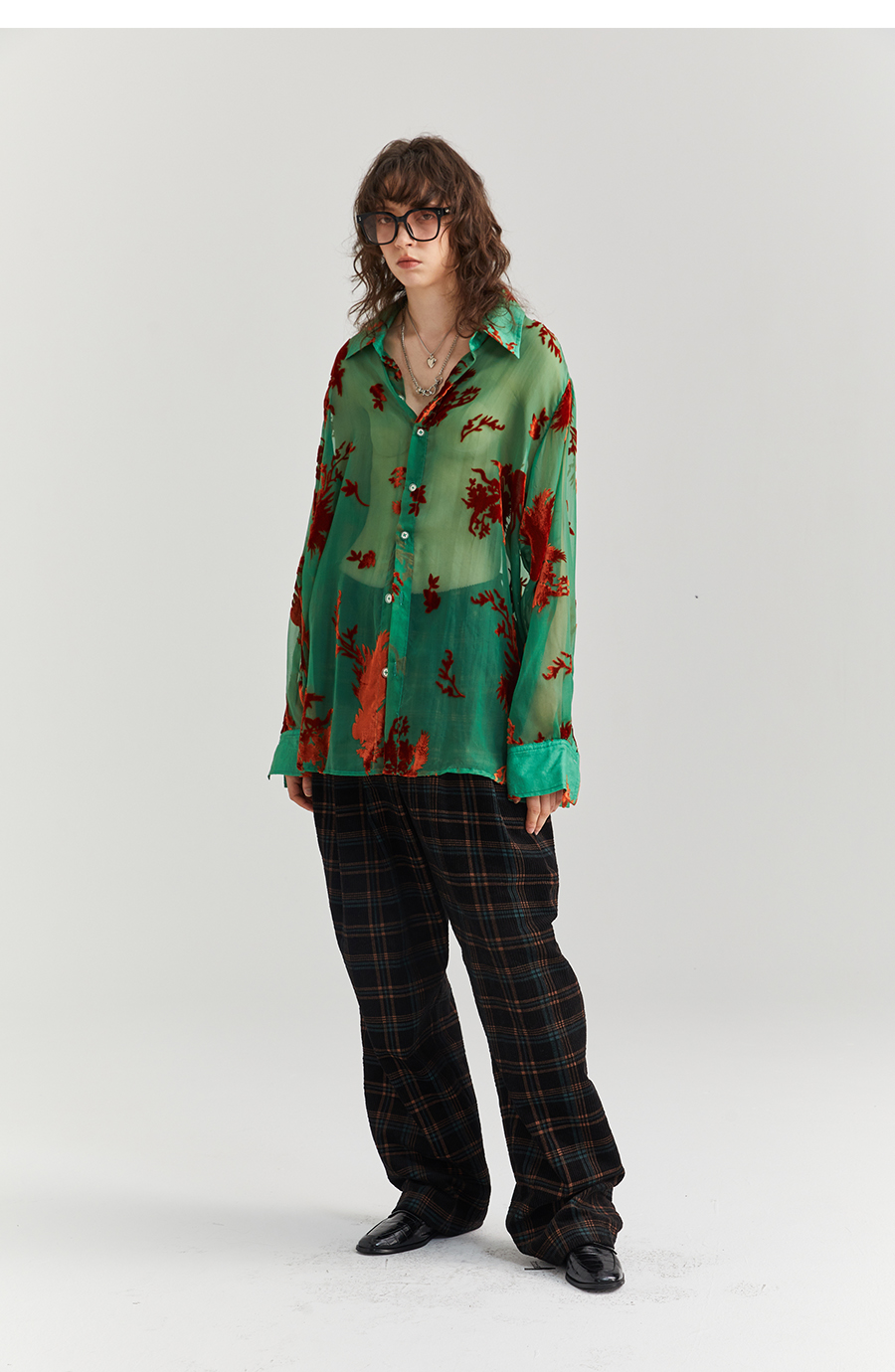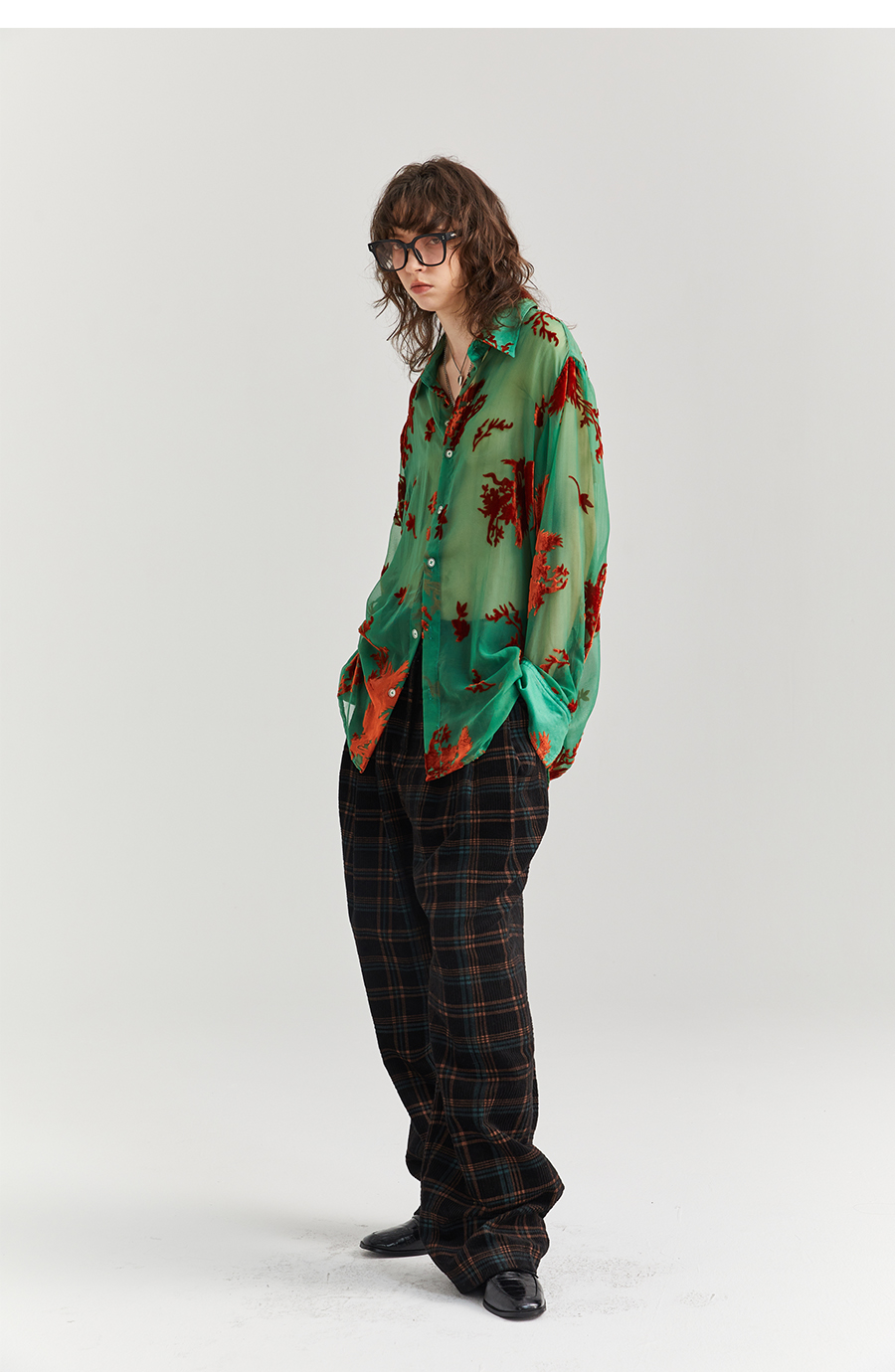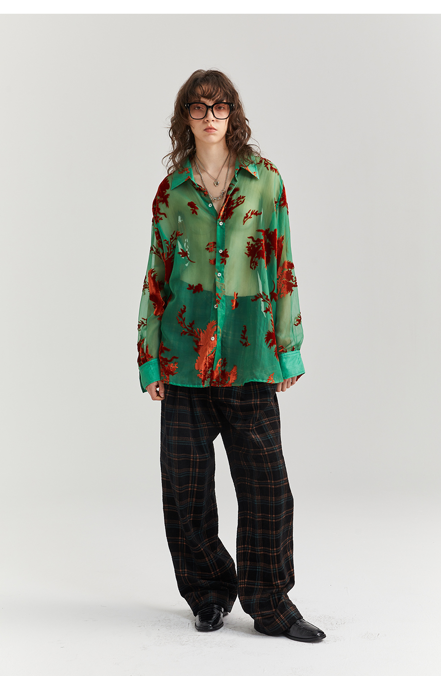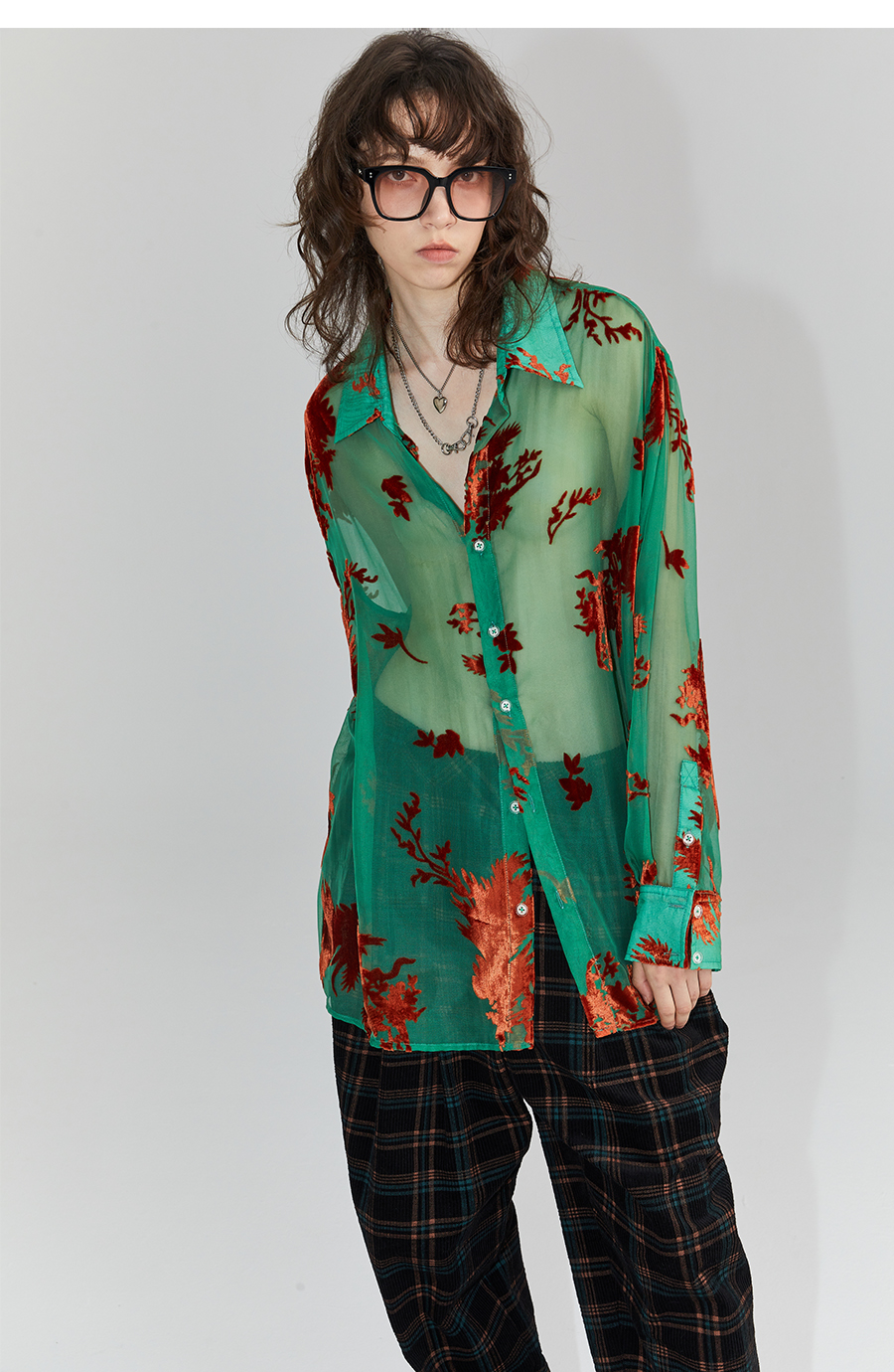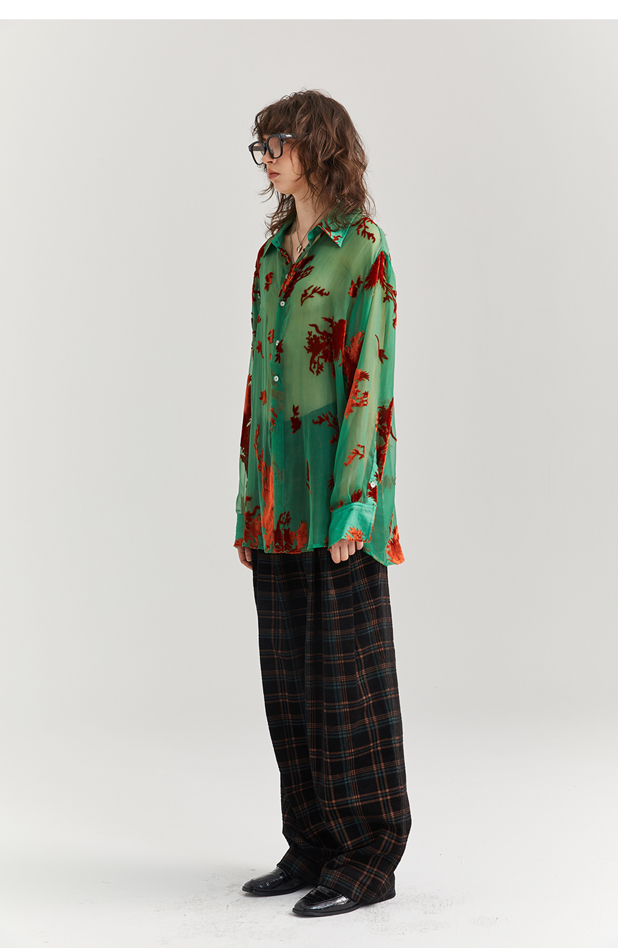 Asaya2098 : Vintage Phoenix Flocked Silk Georgette Green Sheer Loose Shirt (Unisex)