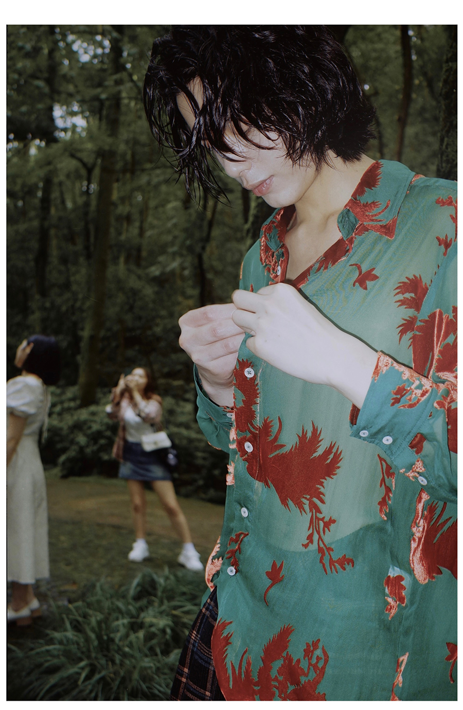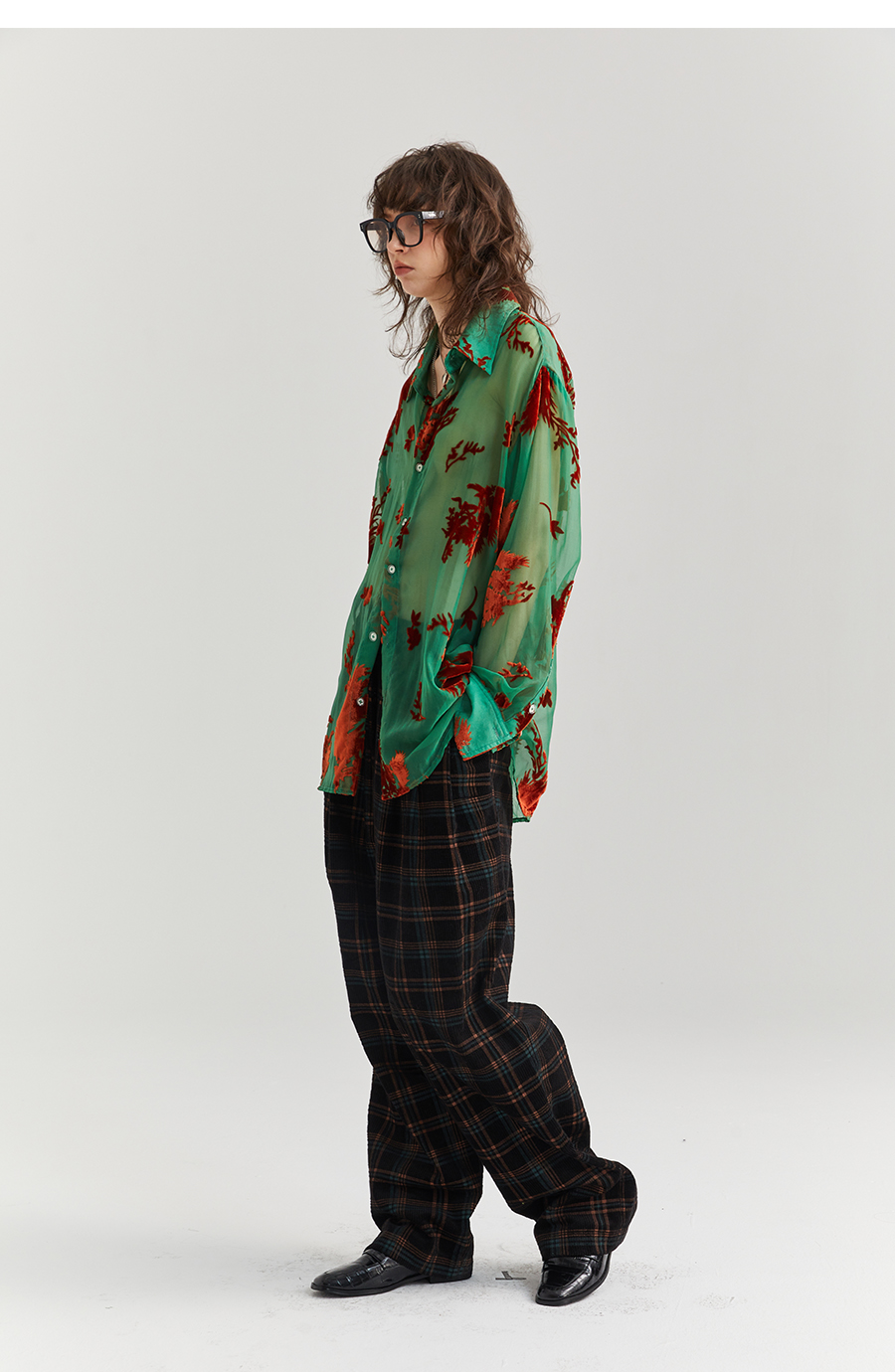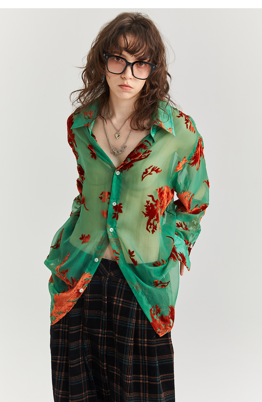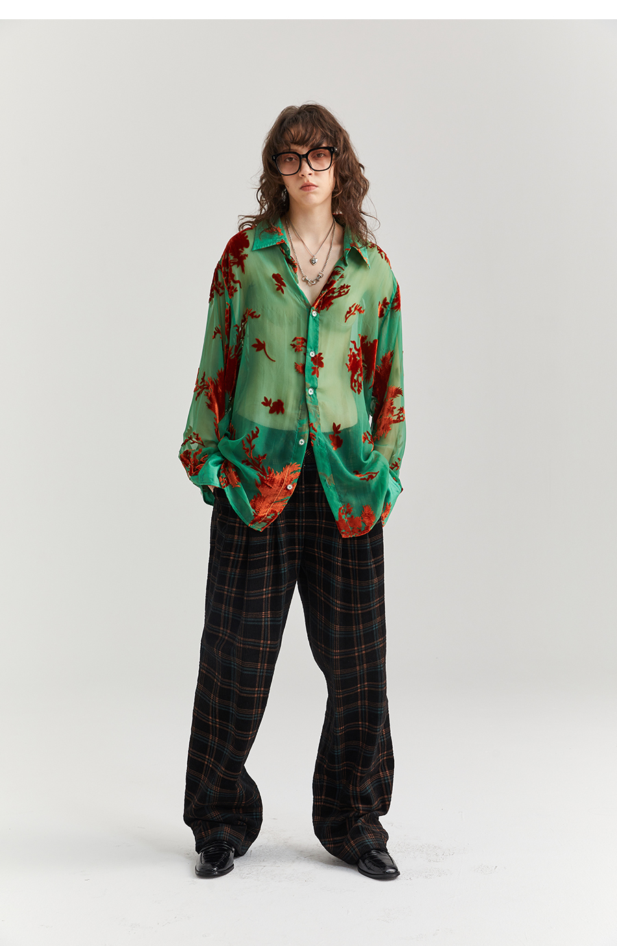 Asaya2098 : Vintage Phoenix Flocked Silk Georgette Green Sheer Loose Shirt (Unisex)