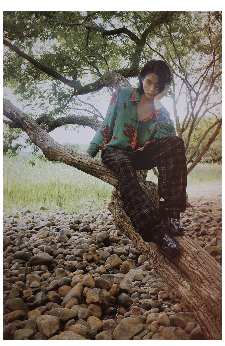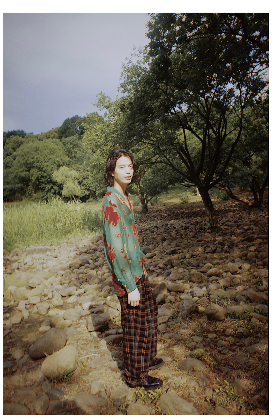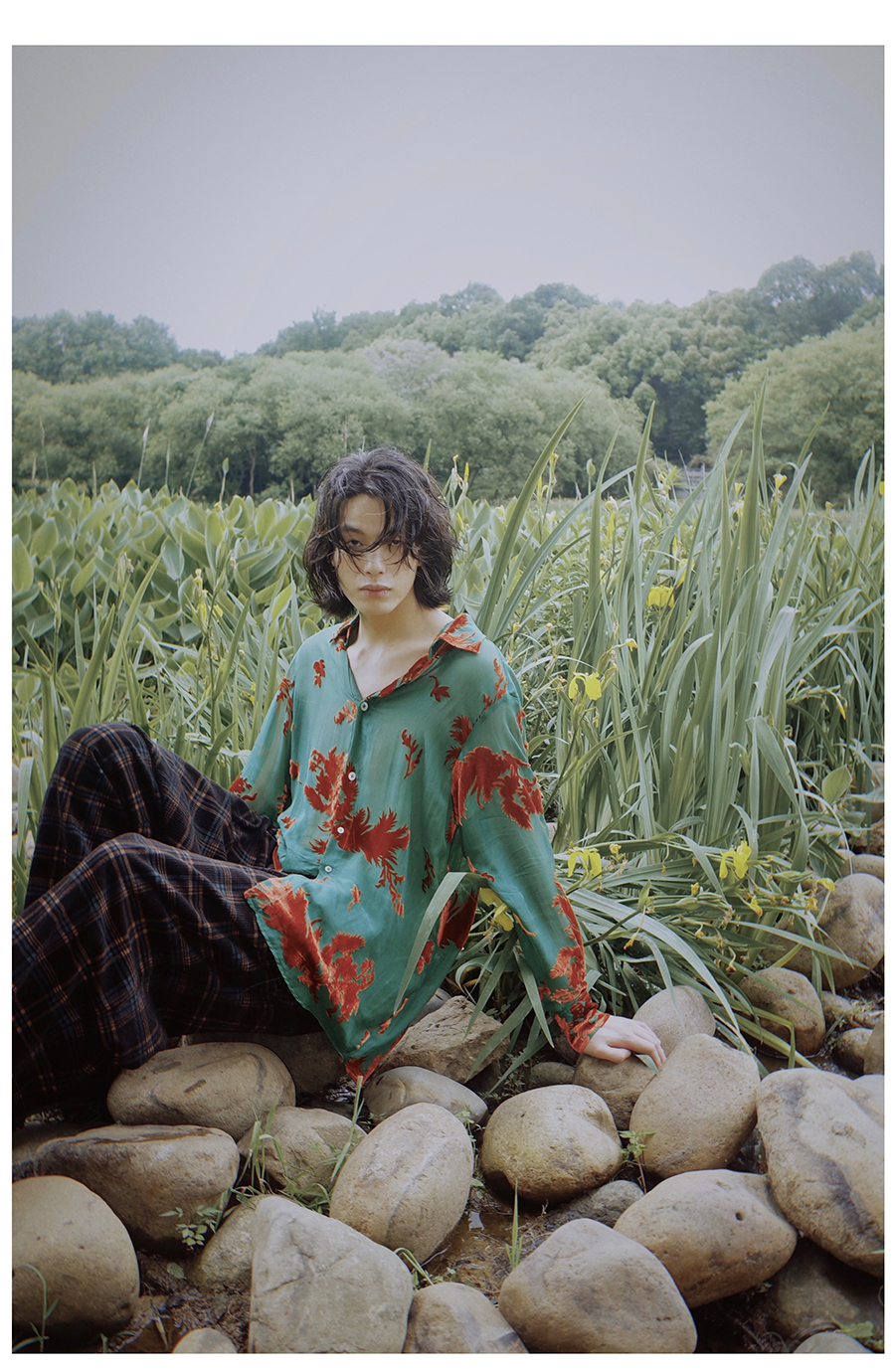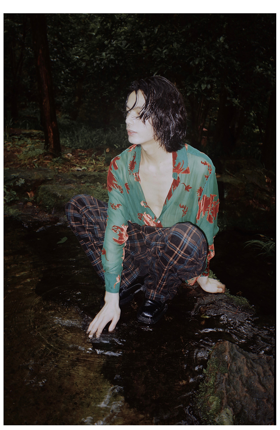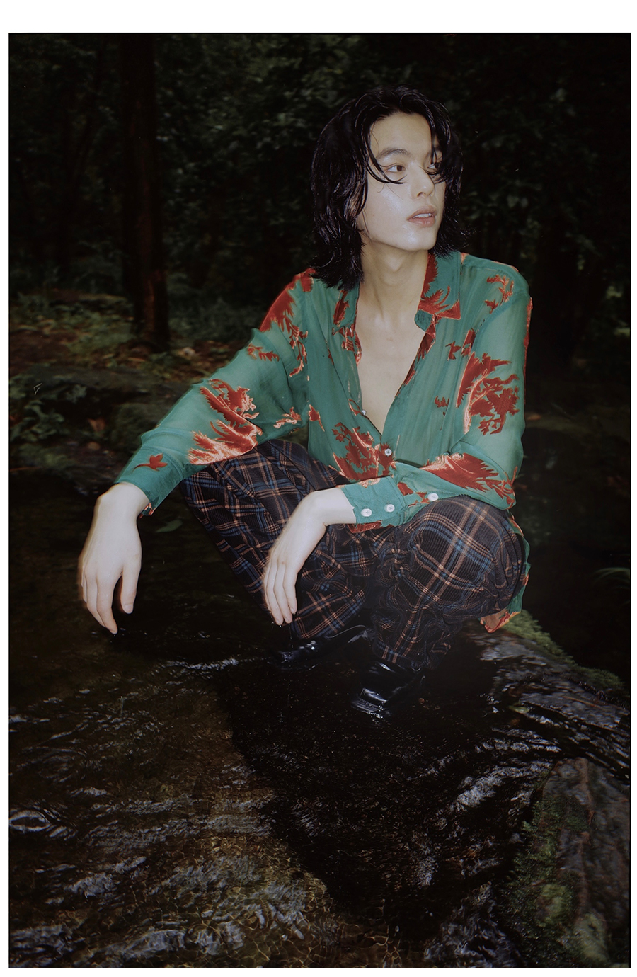 Asaya2098 : Vintage Phoenix Flocked Silk Georgette Green Sheer Loose Shirt (Unisex)