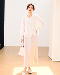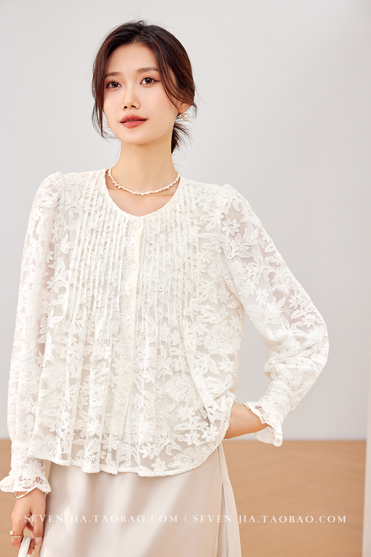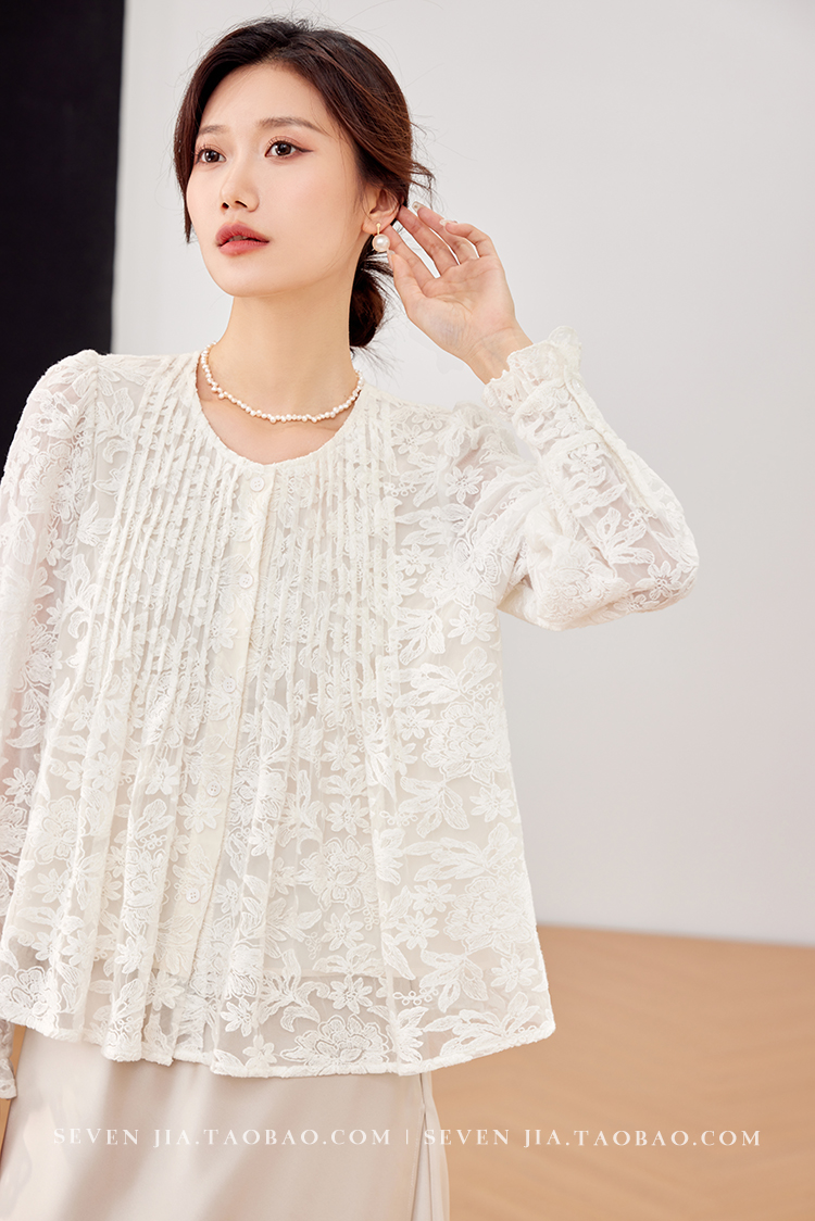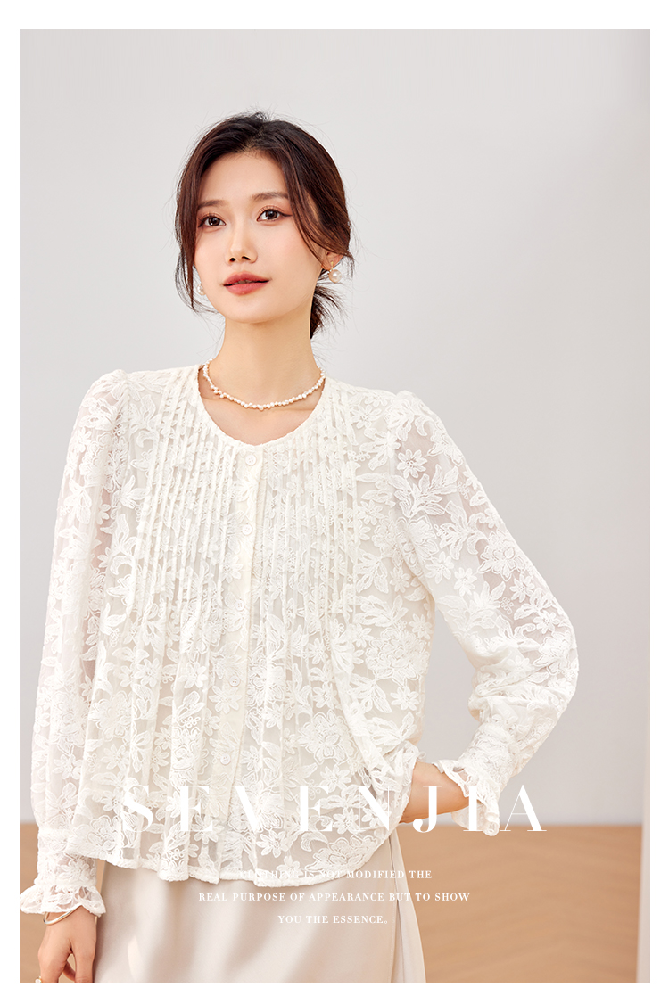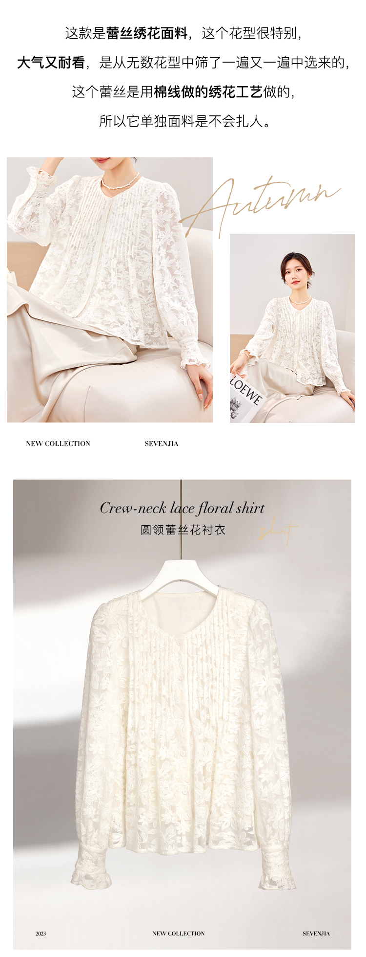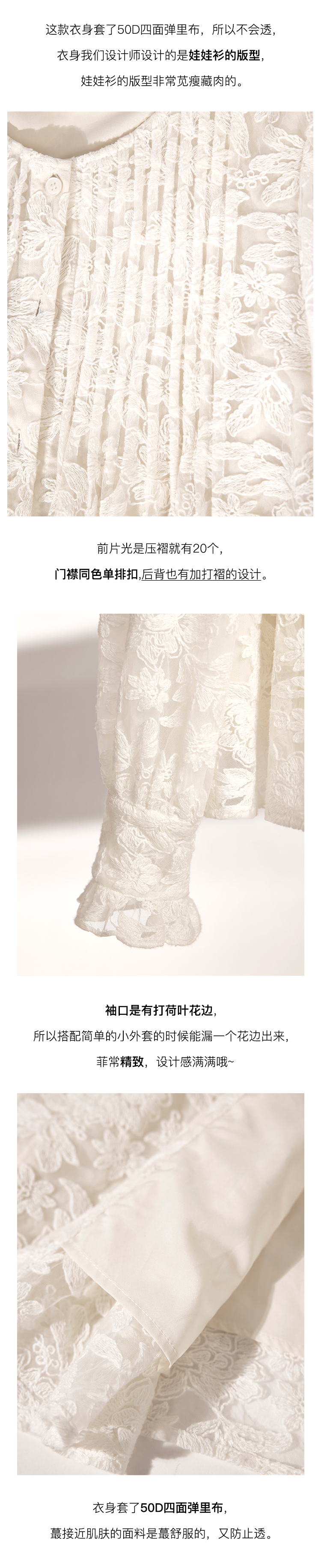 细节/DETAIL | 圆领,单排扣,前片压褶设计,袖口拼接花边 | ||