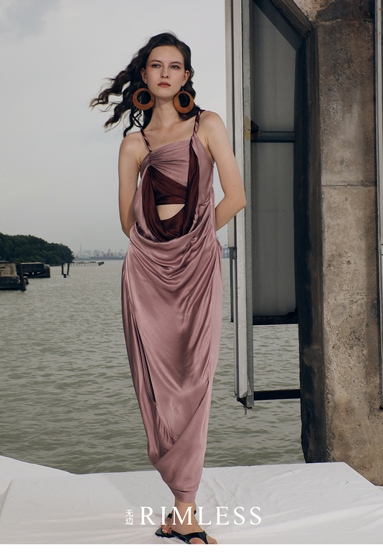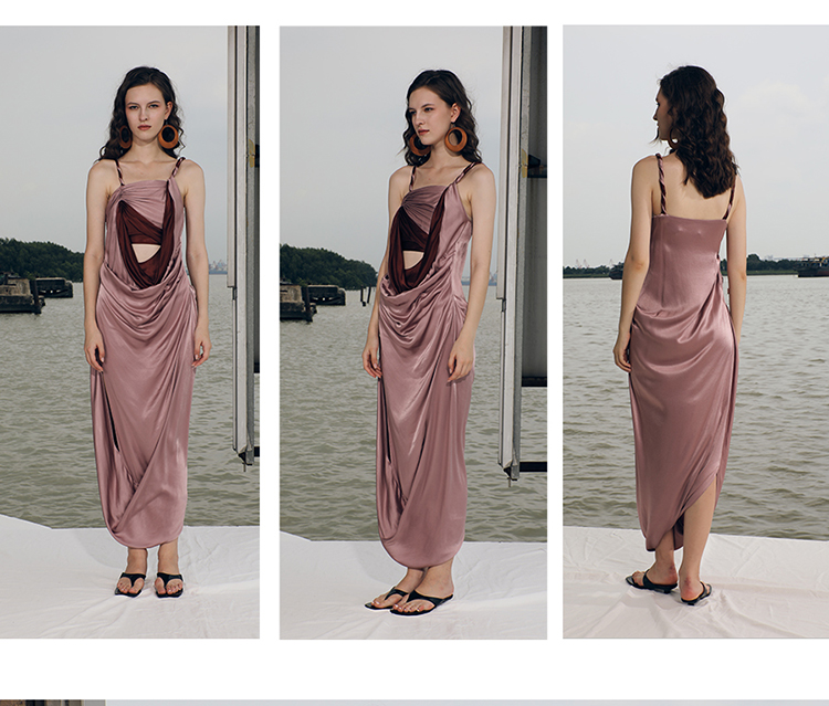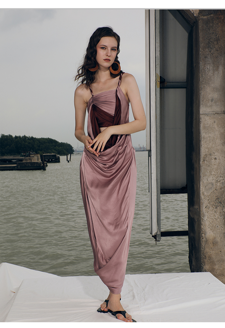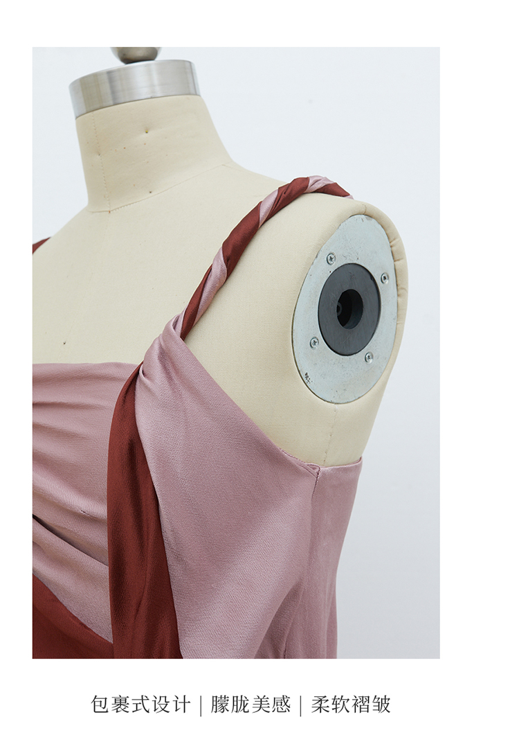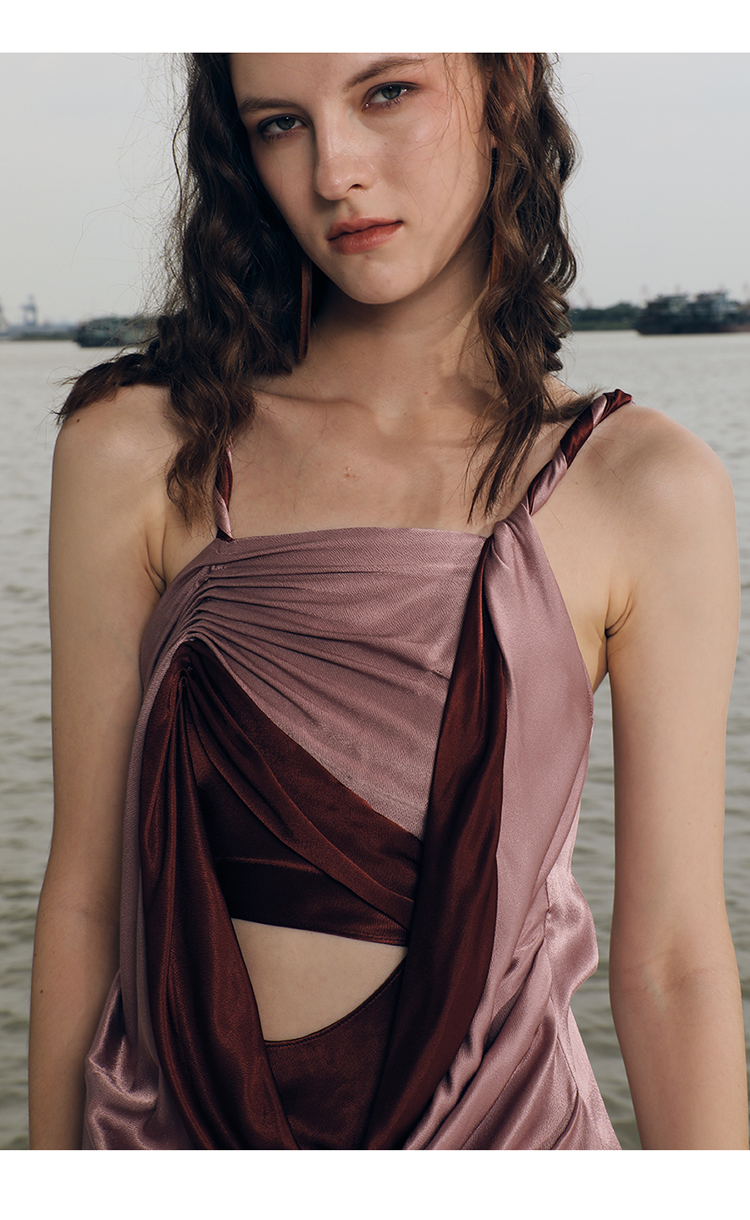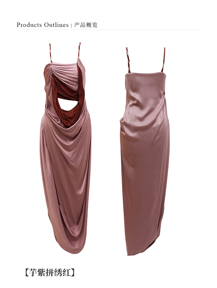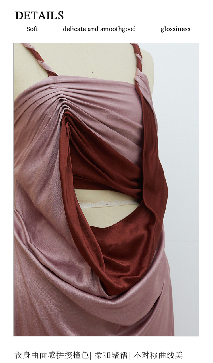 Asaya823 - RIMLESS borderless gentle satin hollow out color blocked irregular pleated suspender dress niche original design