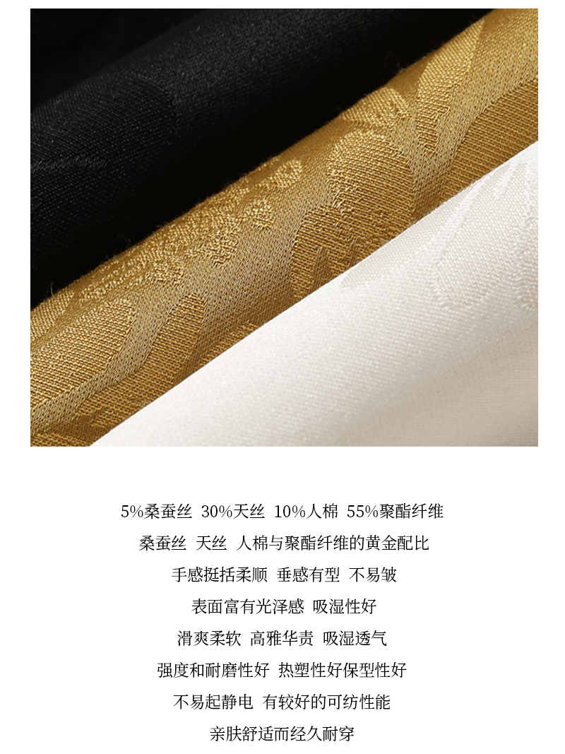 Material composition | Polyester fiber 55% regenerated cellulose fiber 30% viscose fiber (viscose fiber) 10% mulberry silk 5% |