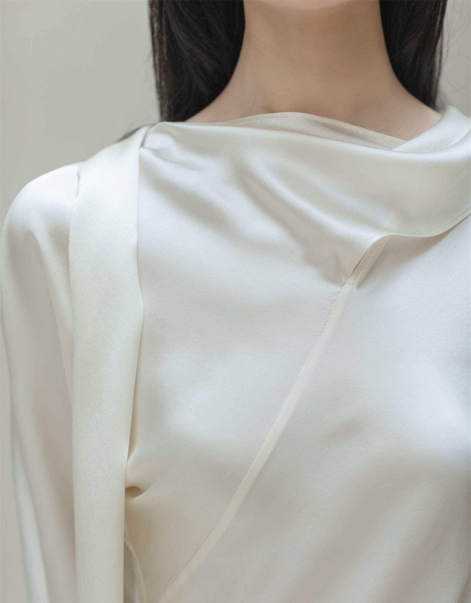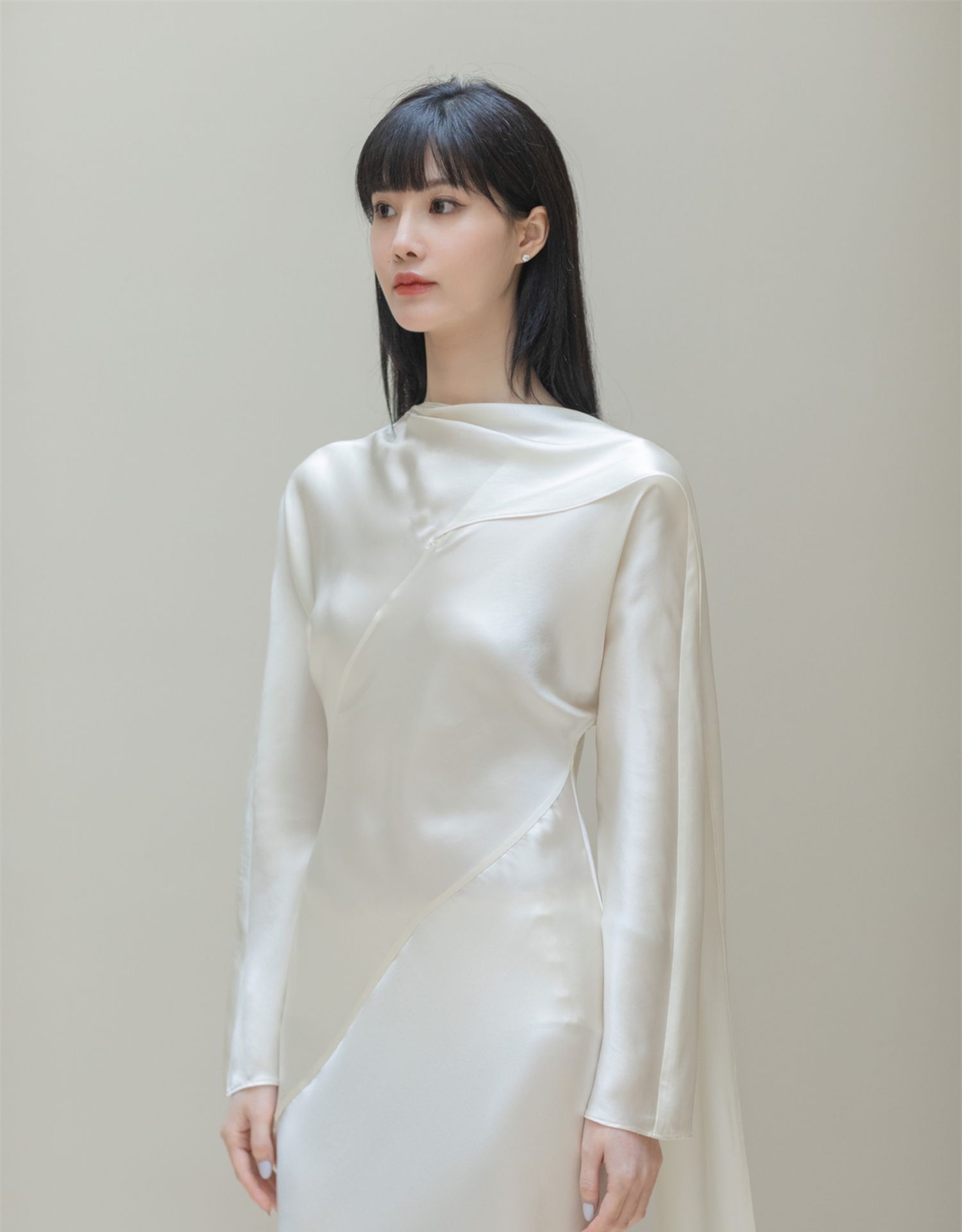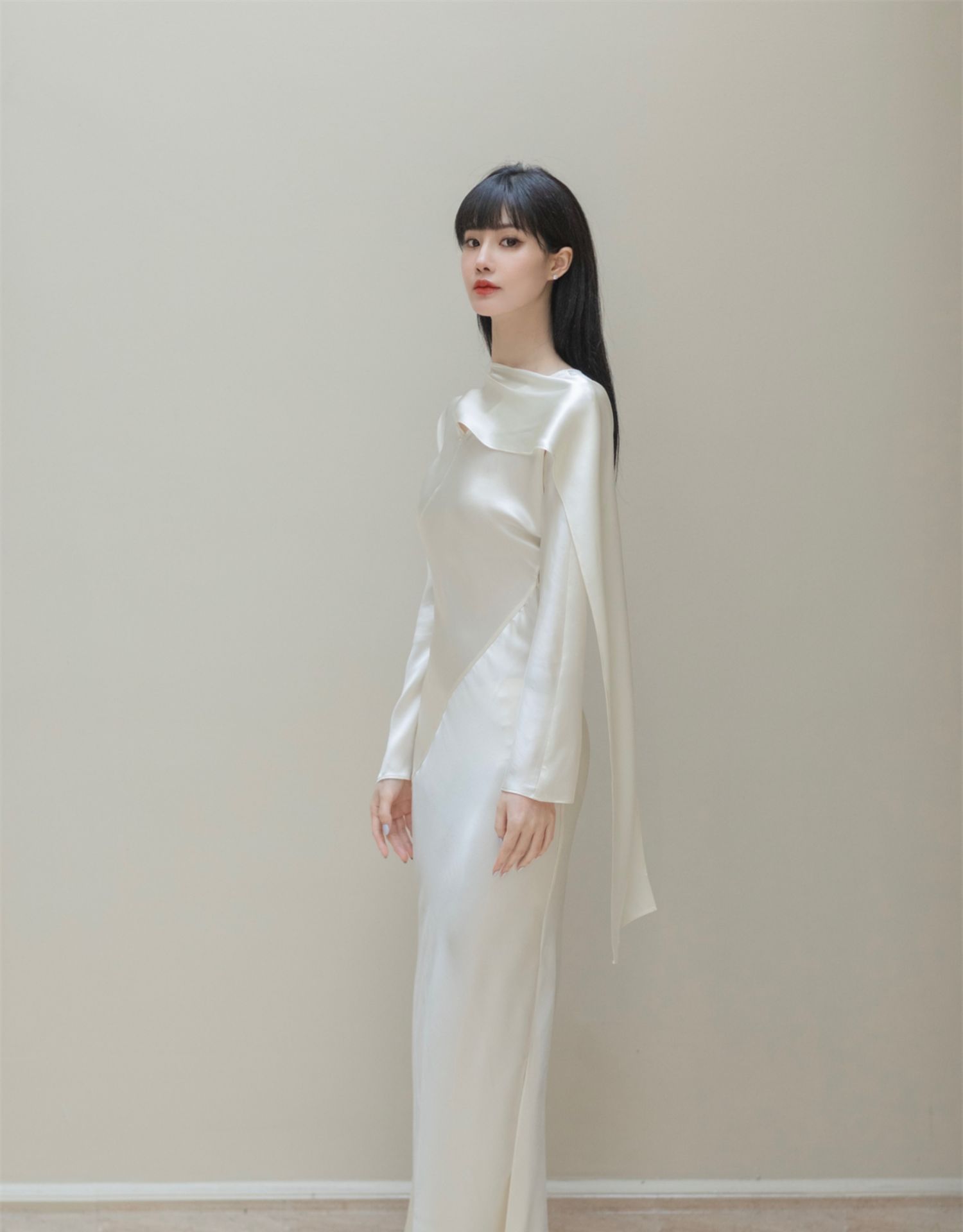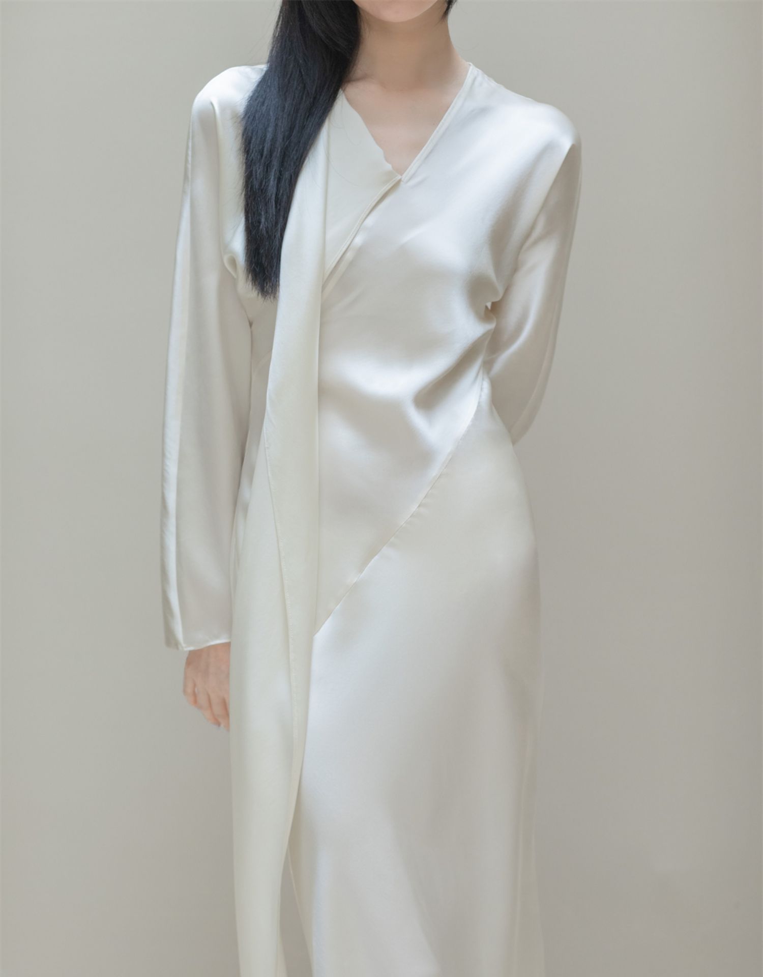 Asya773 - SAKINAWANG 22 Summer Silk Crepe Slant Cut Scarf Style Slim Fit Waist Long Sleeve Dress Solid Color