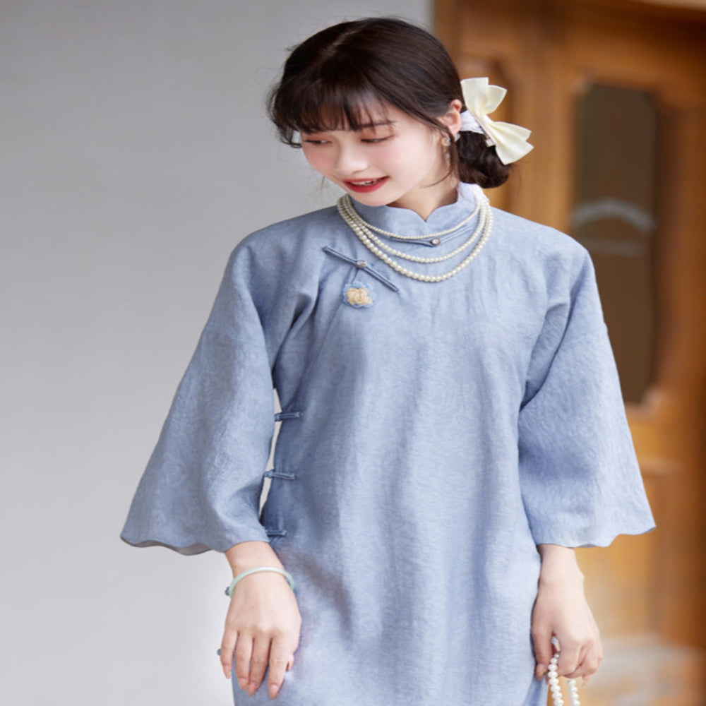 ASAYA3640 original blue petal collar three-quarter sleeves medium-length girl retro ancient cheongsam young style inverted large sleeves