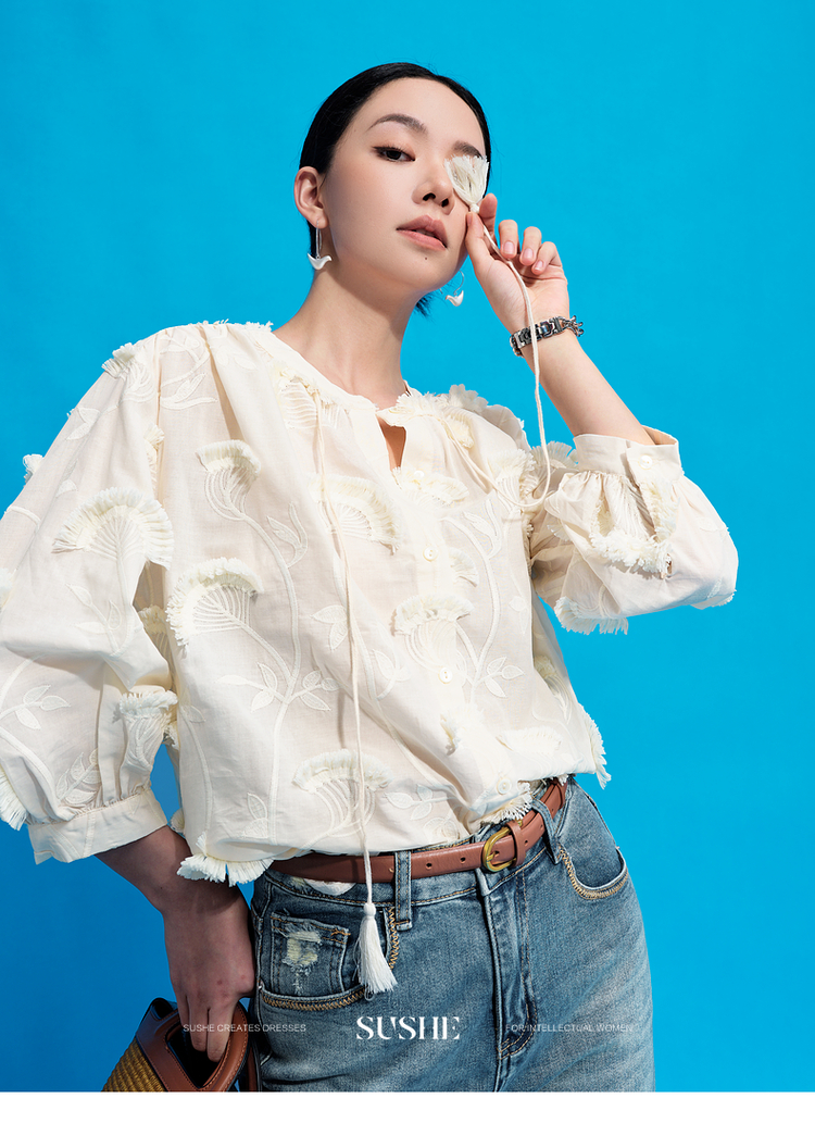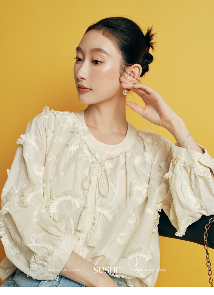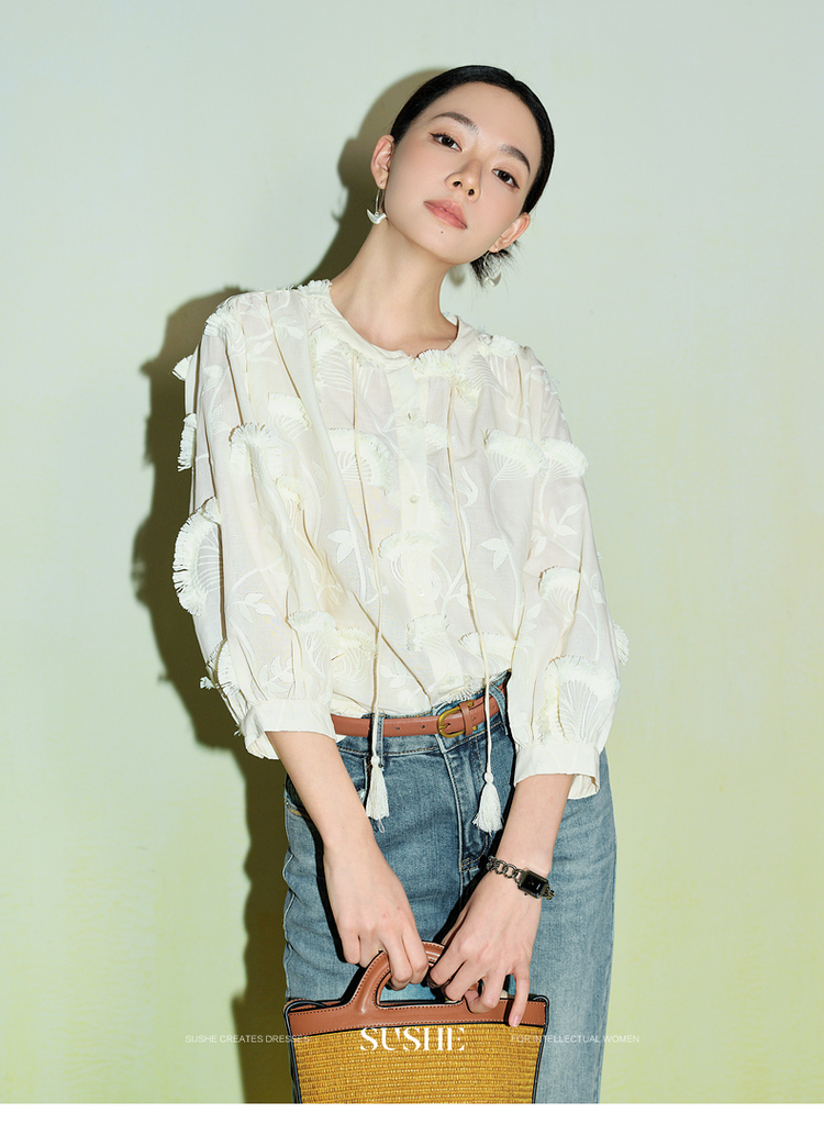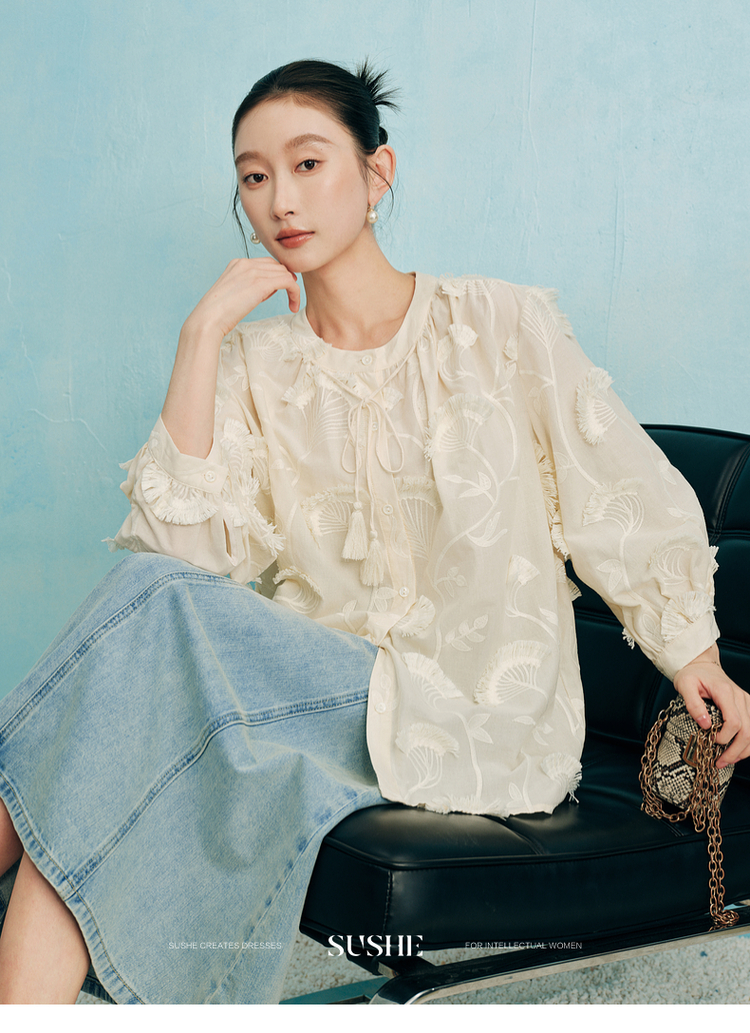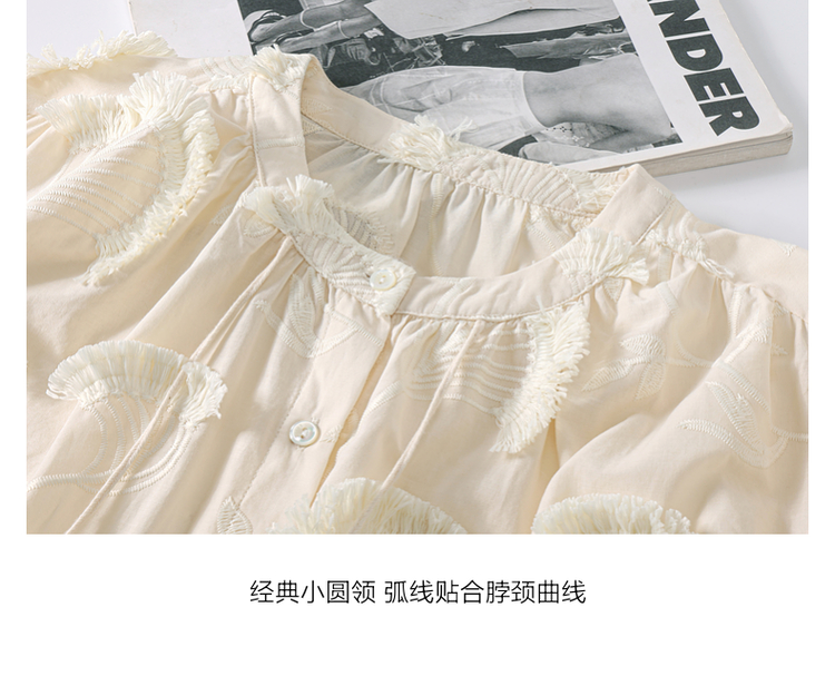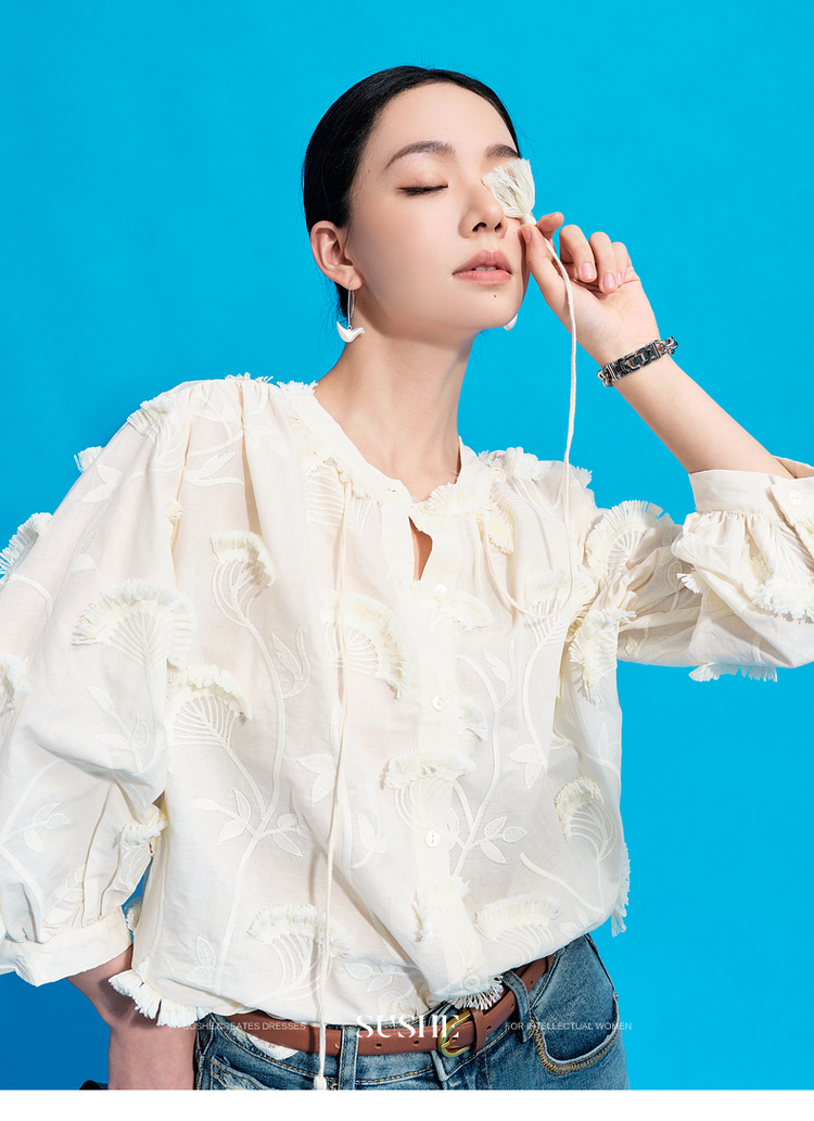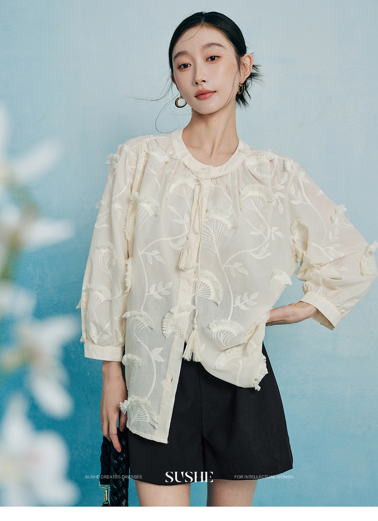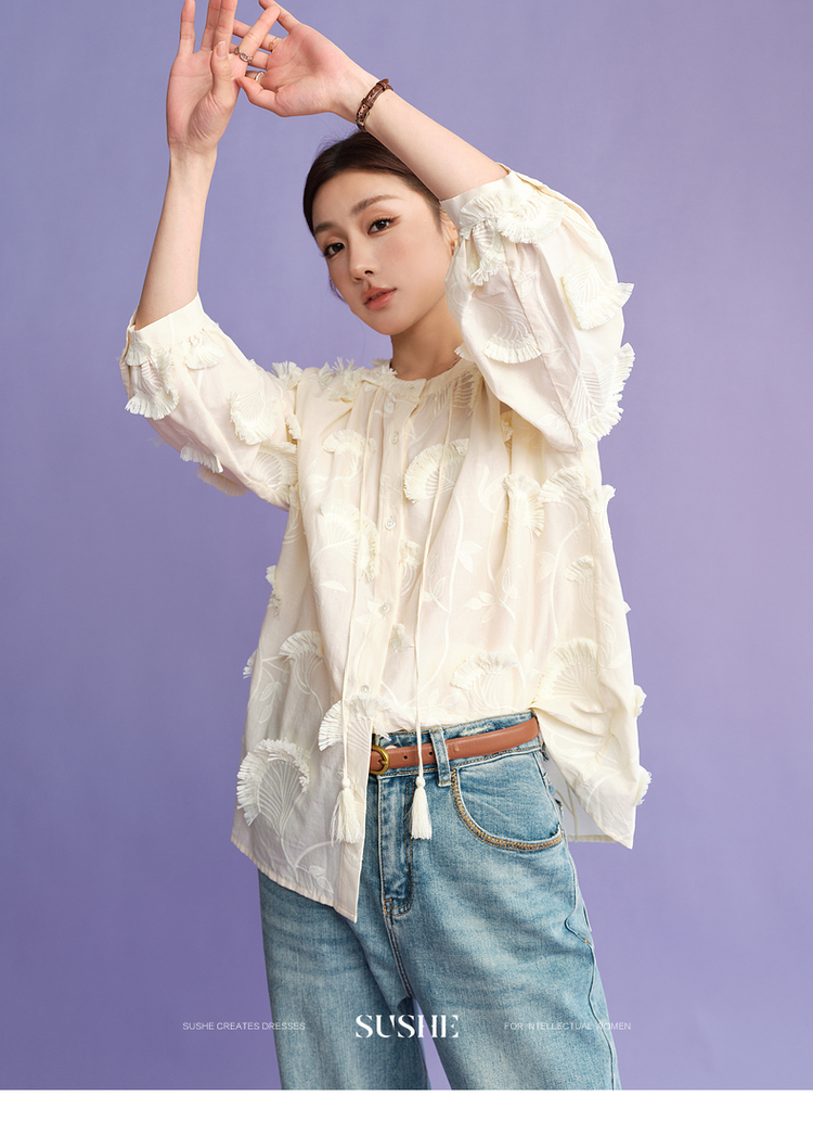 ASAYA2389 three-dimensional embroidery cotton French top niche high-end white fringed shirt