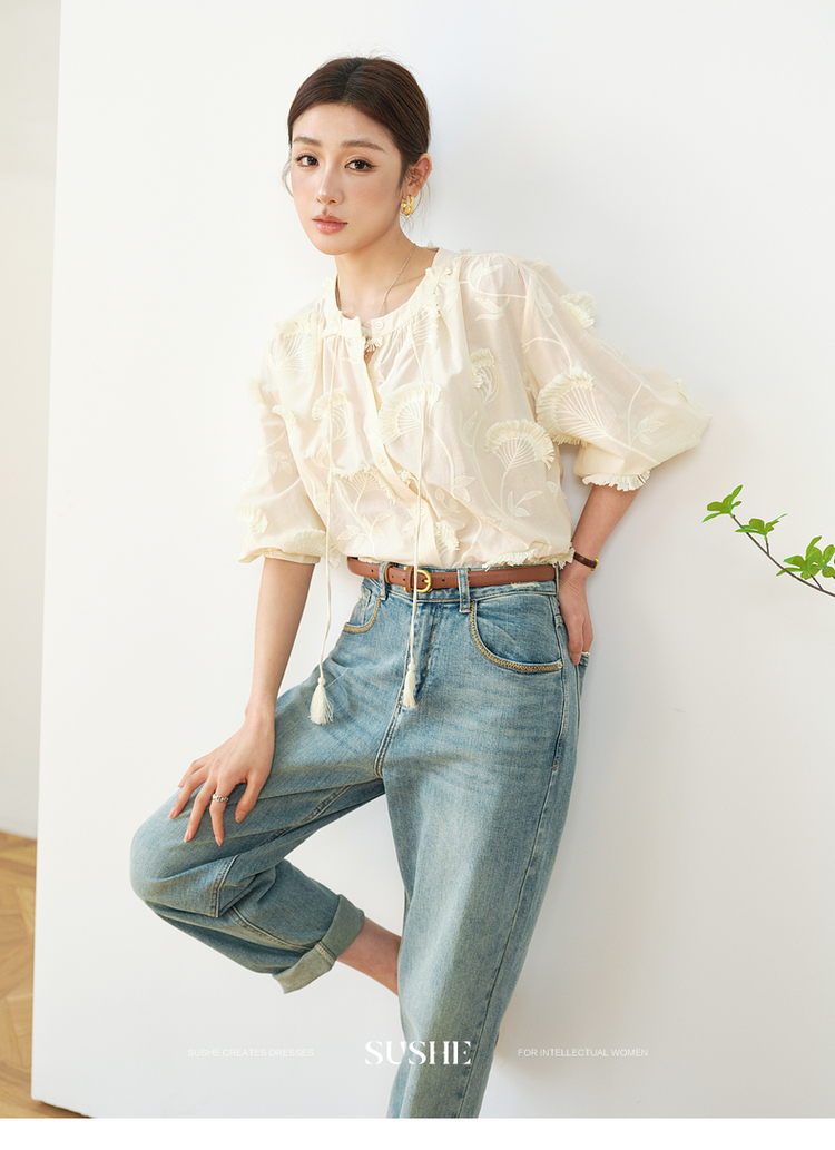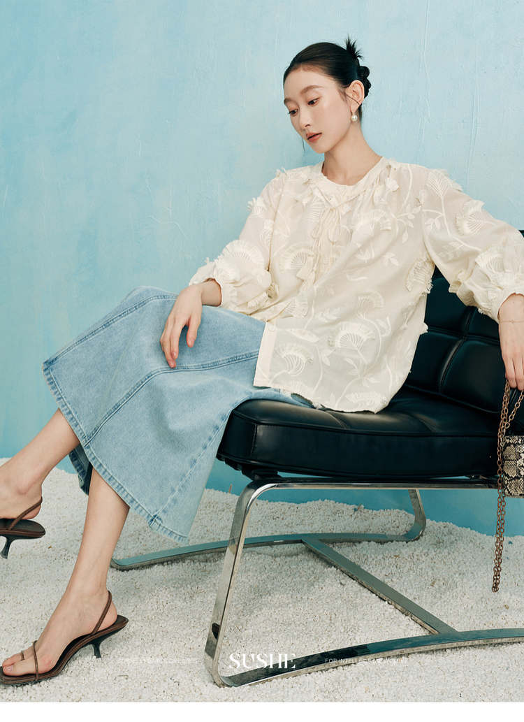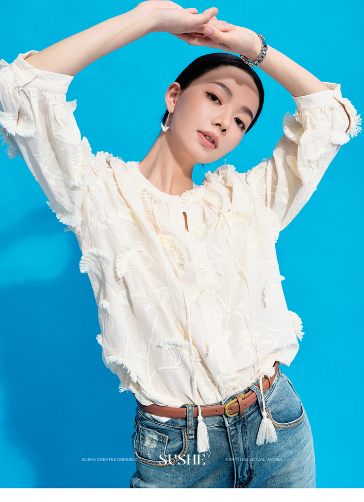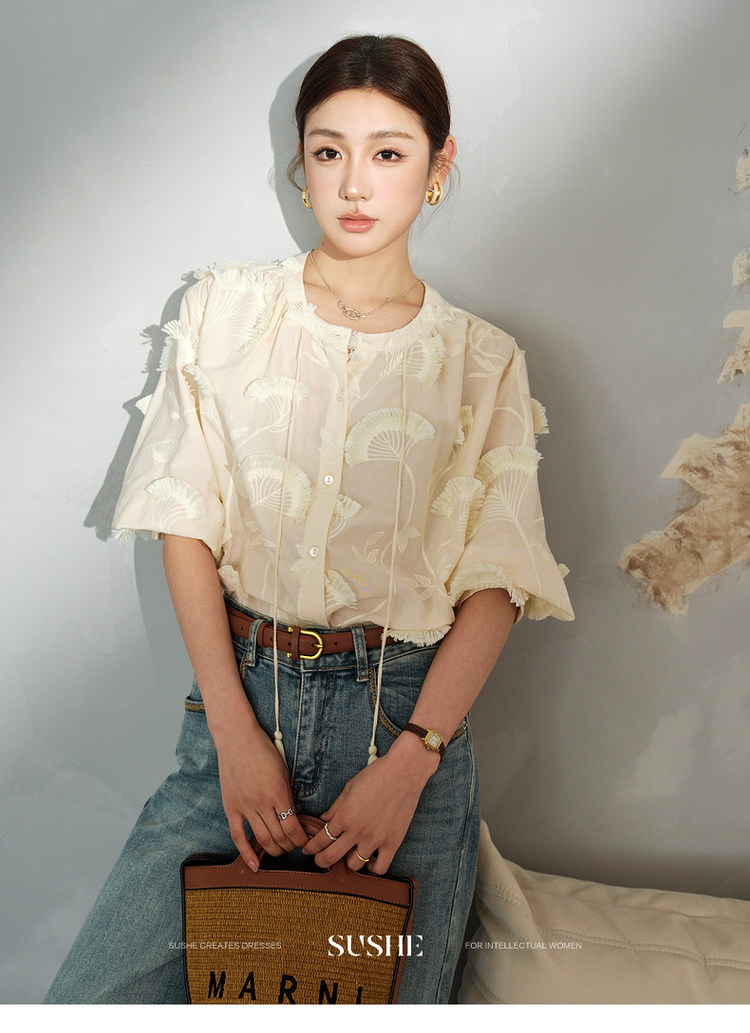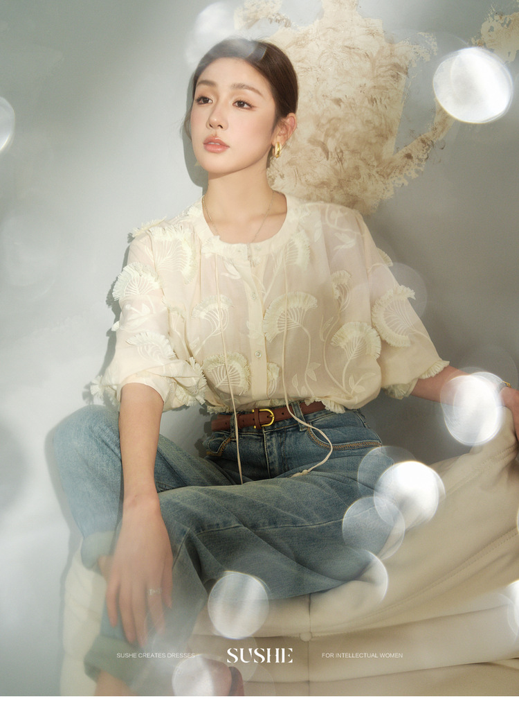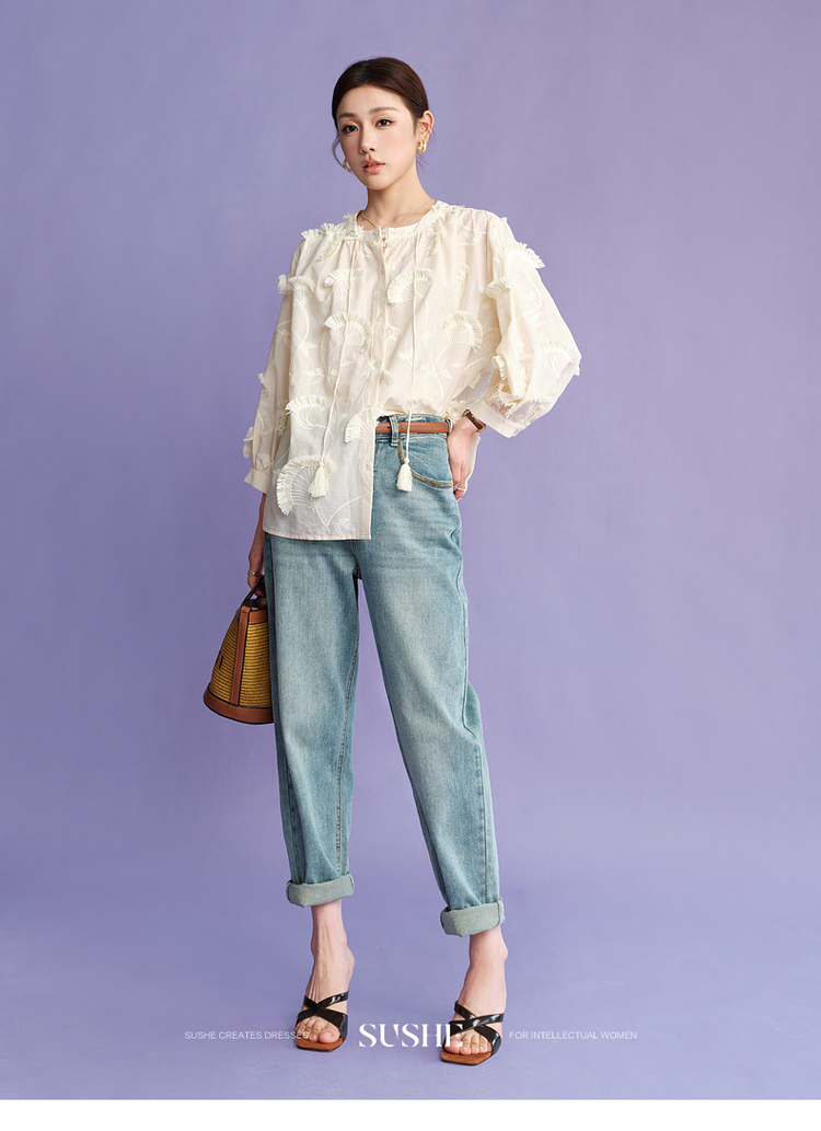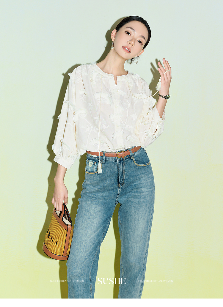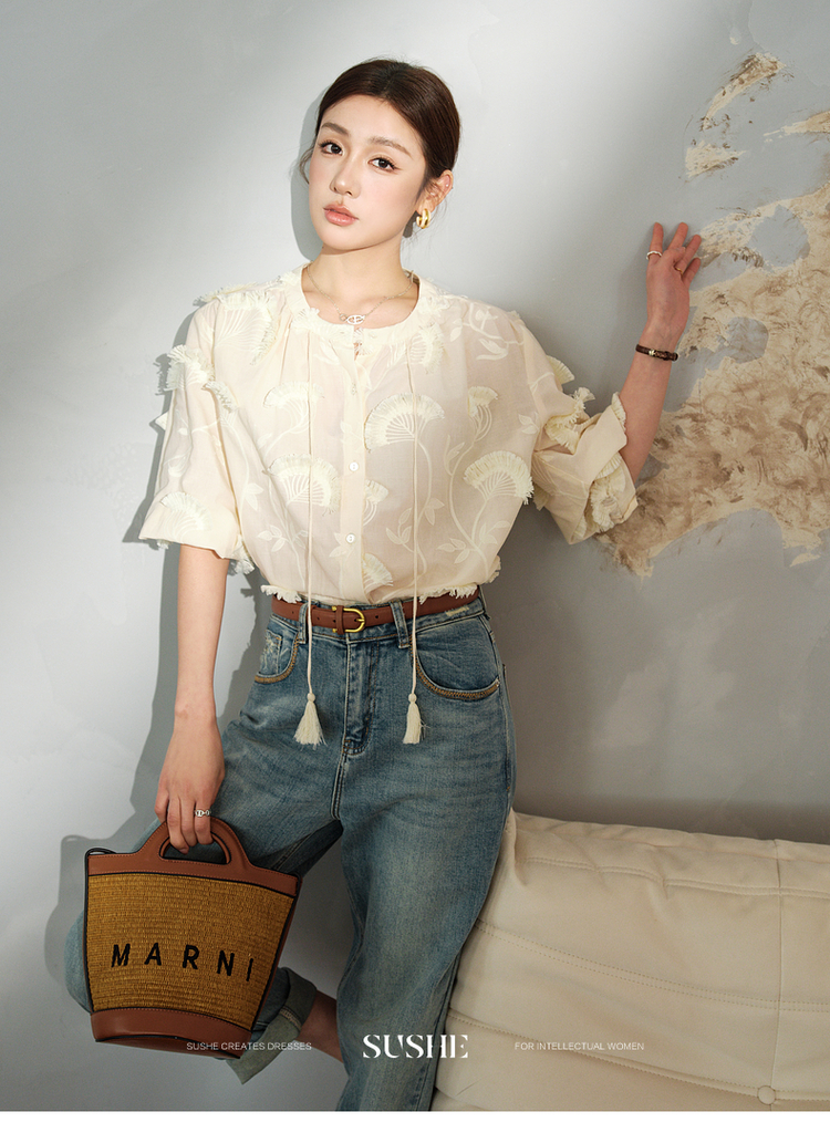 ASAYA2389 three-dimensional embroidery cotton French top niche high-end white fringed shirt