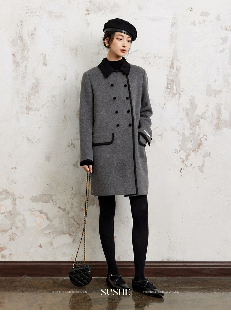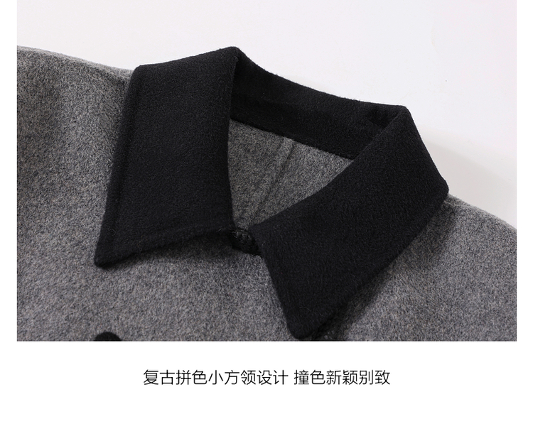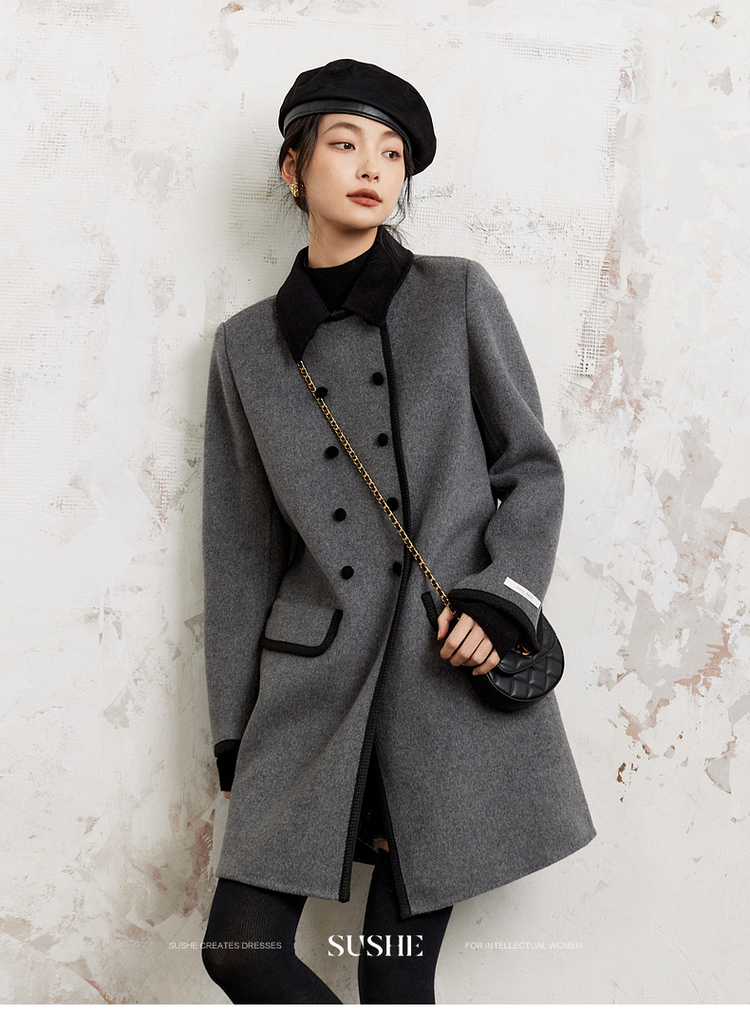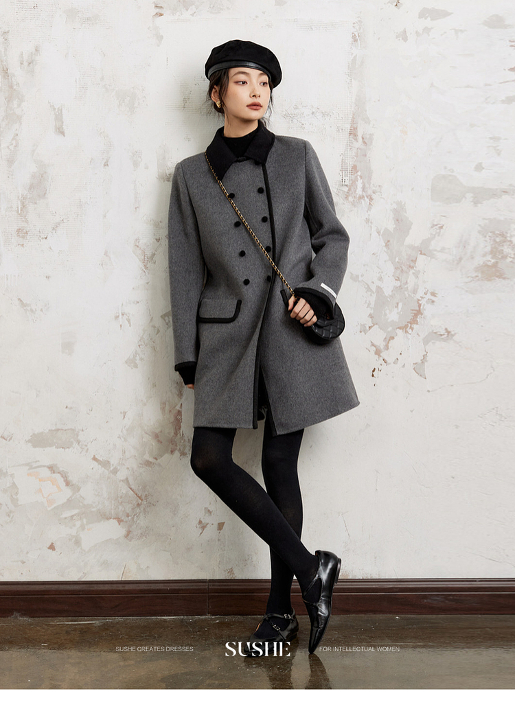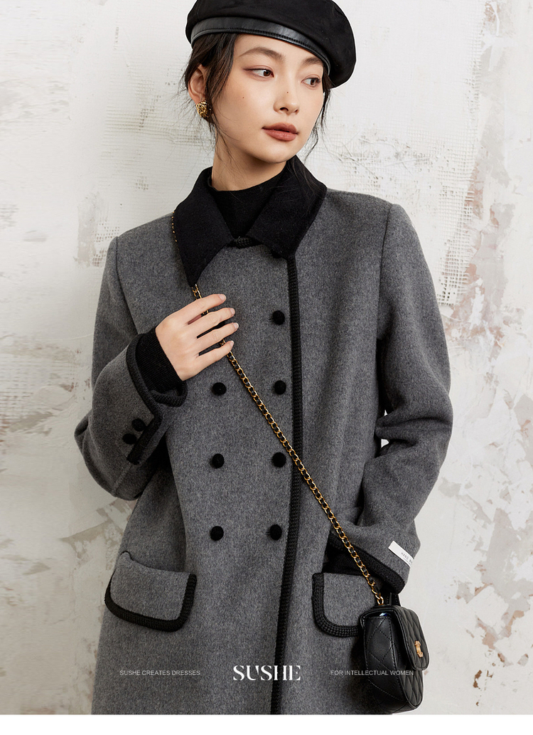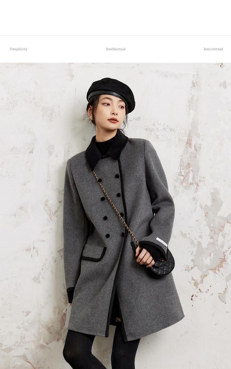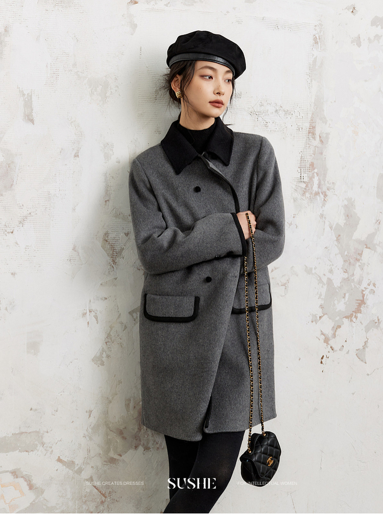ASAYA2593 Sheep wool literary style contrasting double-breasted gray double-sided straight coat