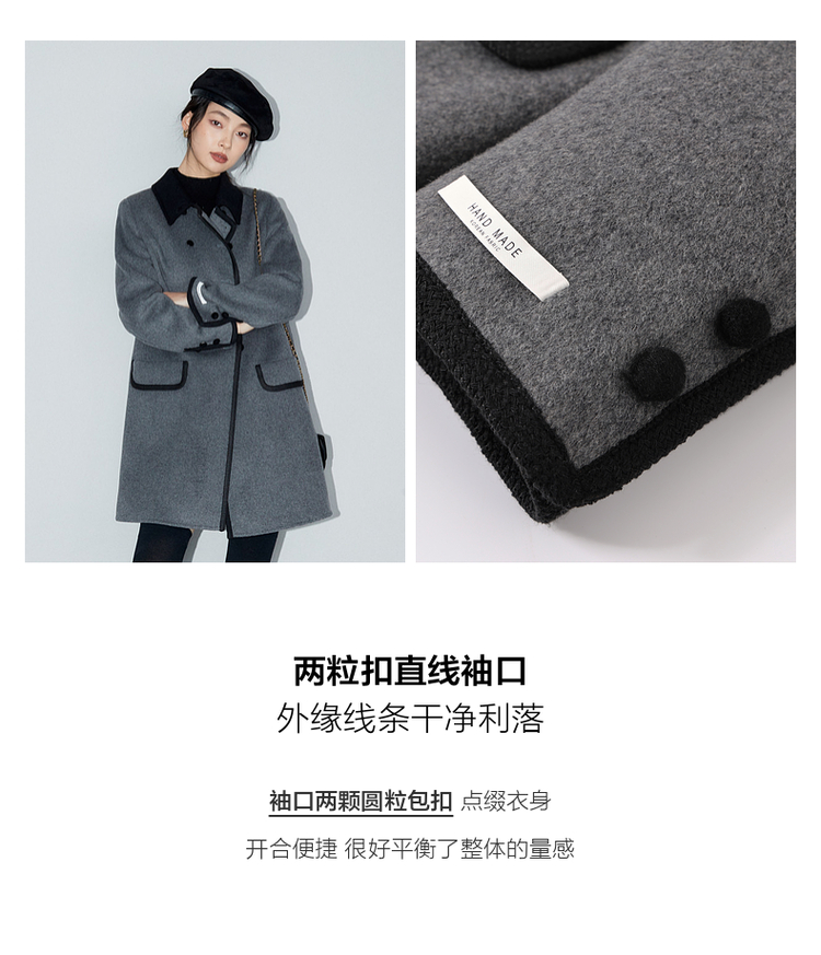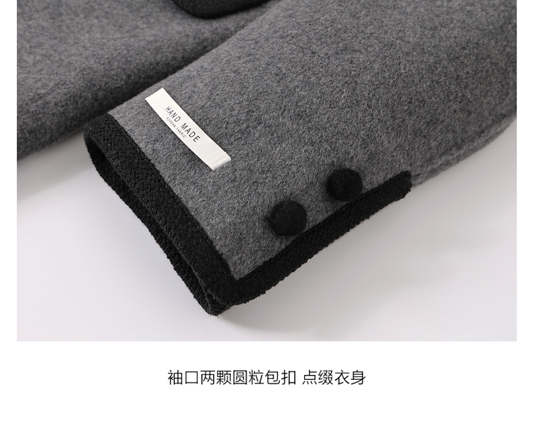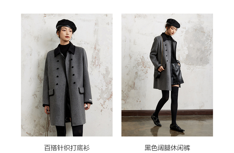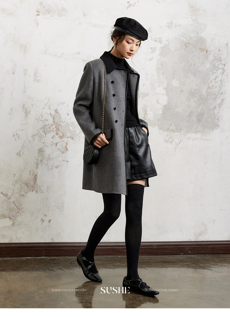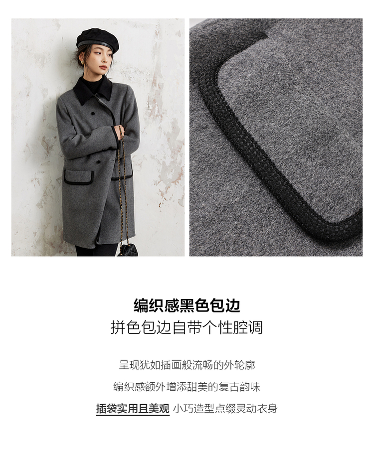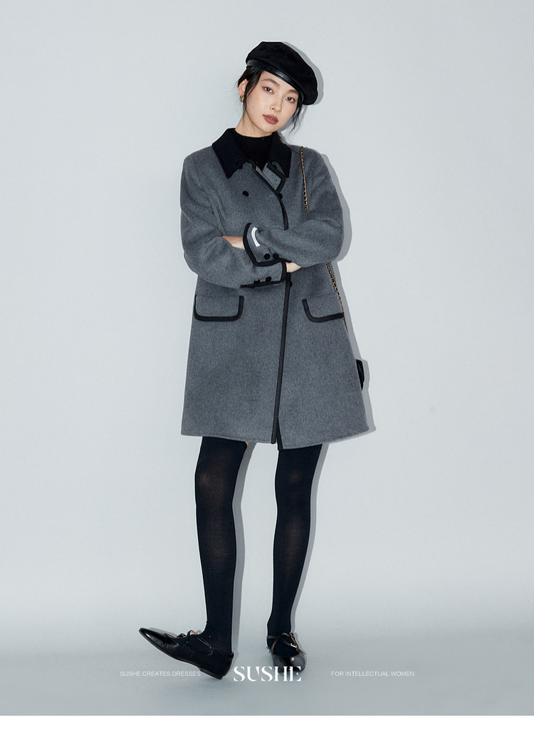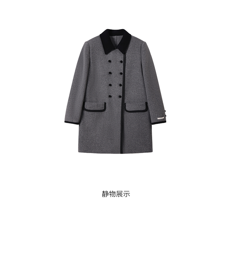 ASAYA2593 Sheep wool literary style contrasting double-breasted gray double-sided straight coat