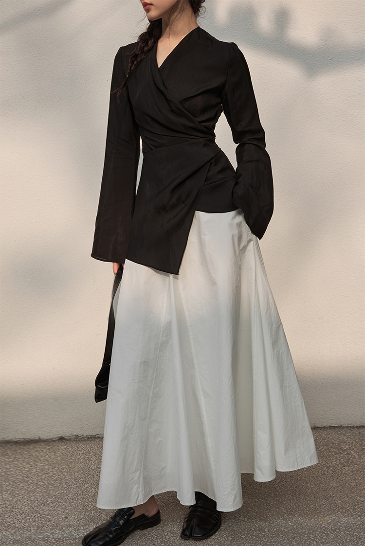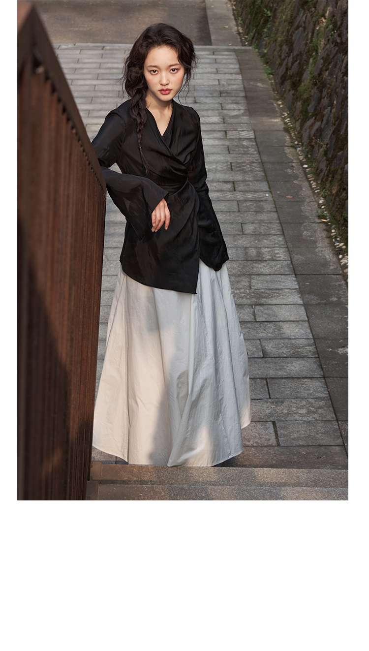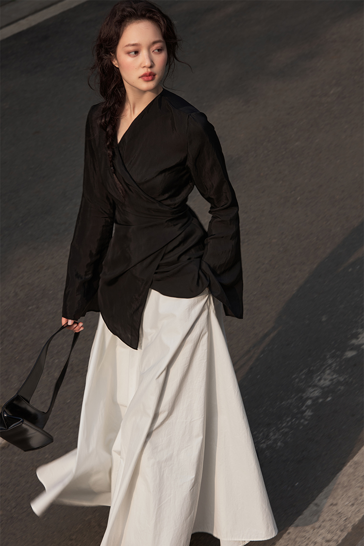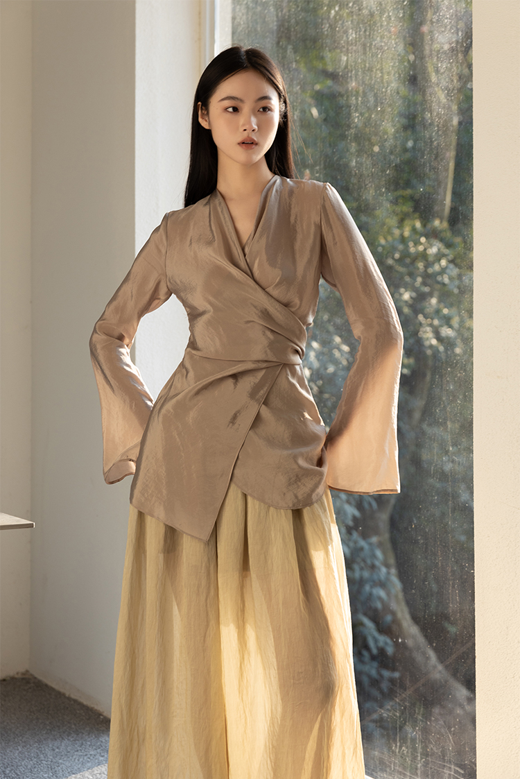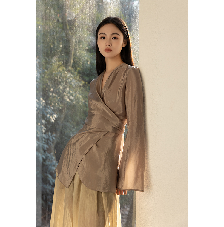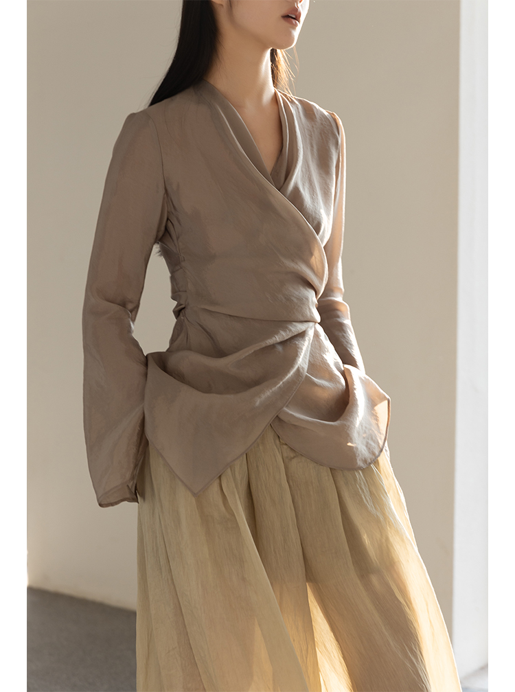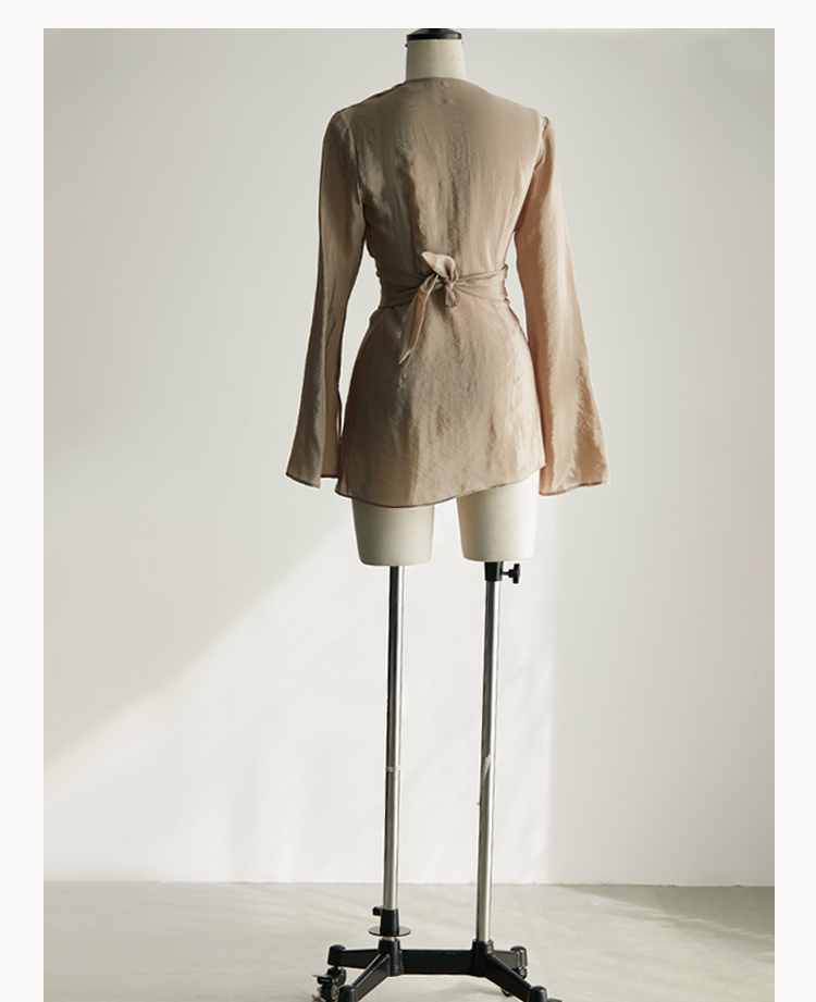 Asaya2159 : Silk fabric wrap-style slim v-neck trumpet sleeve shirt spring and summer elegant temperament long-sleeved top women