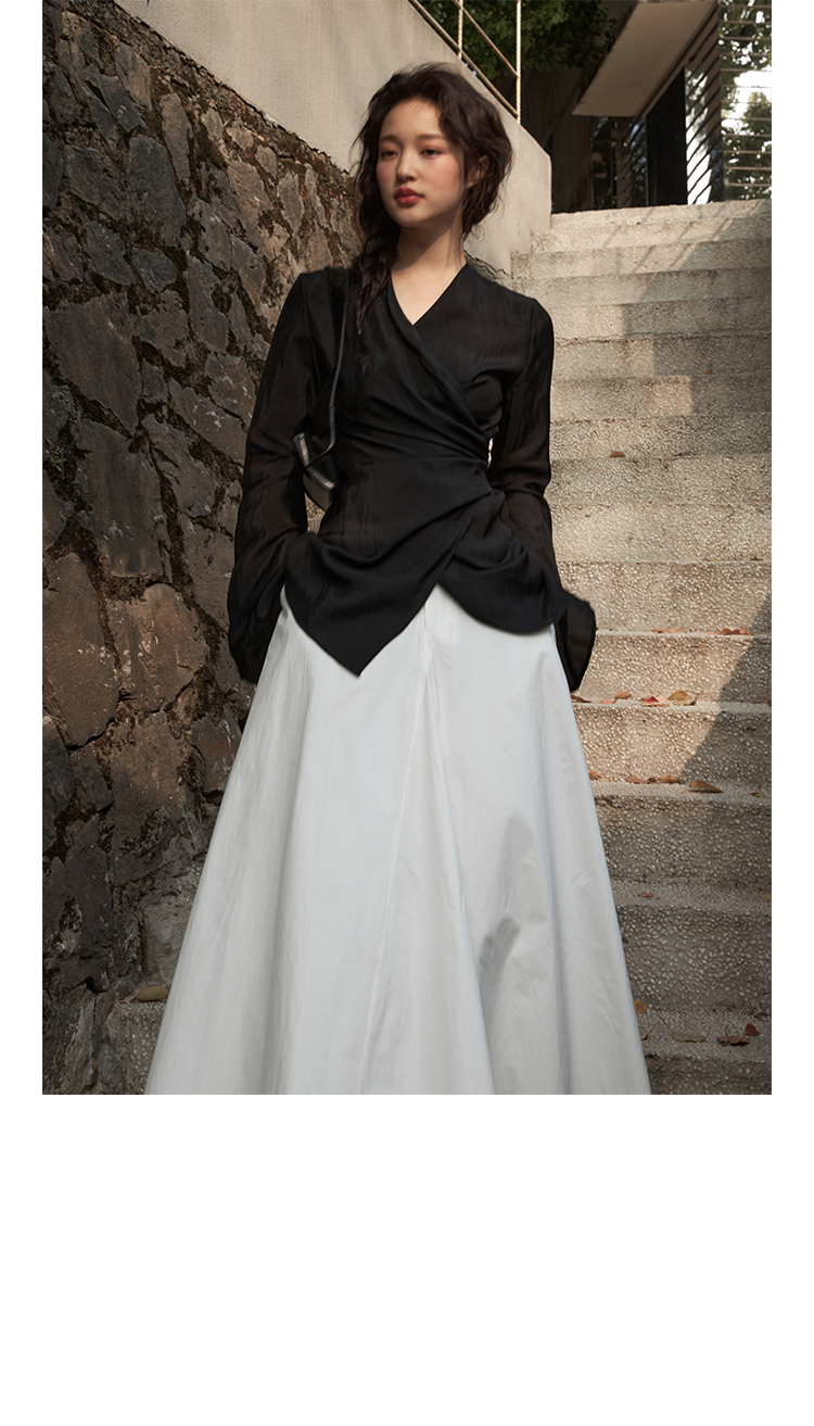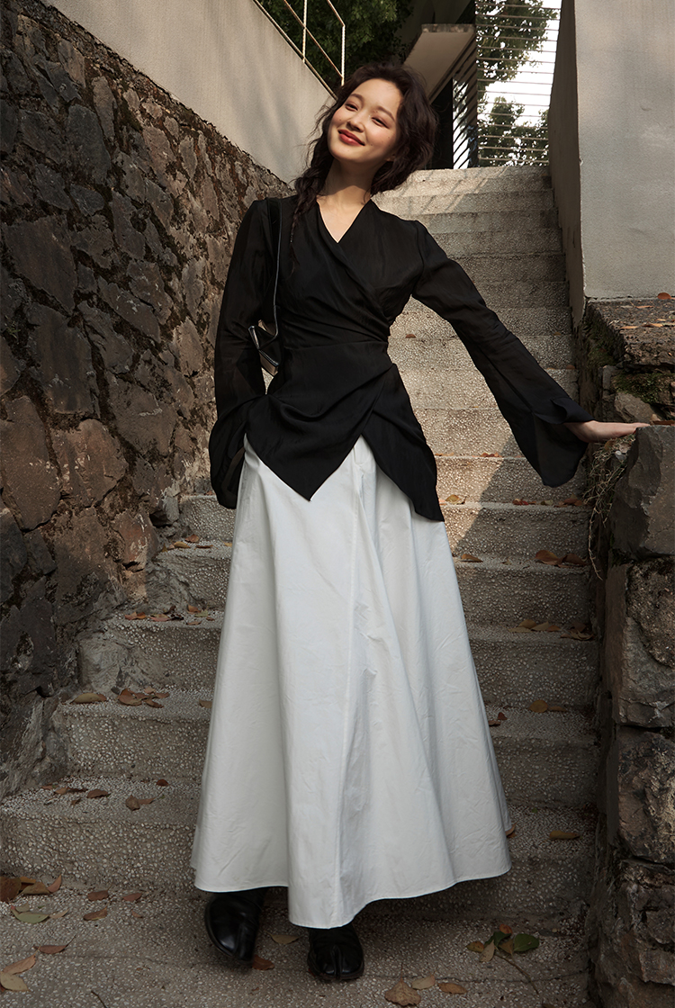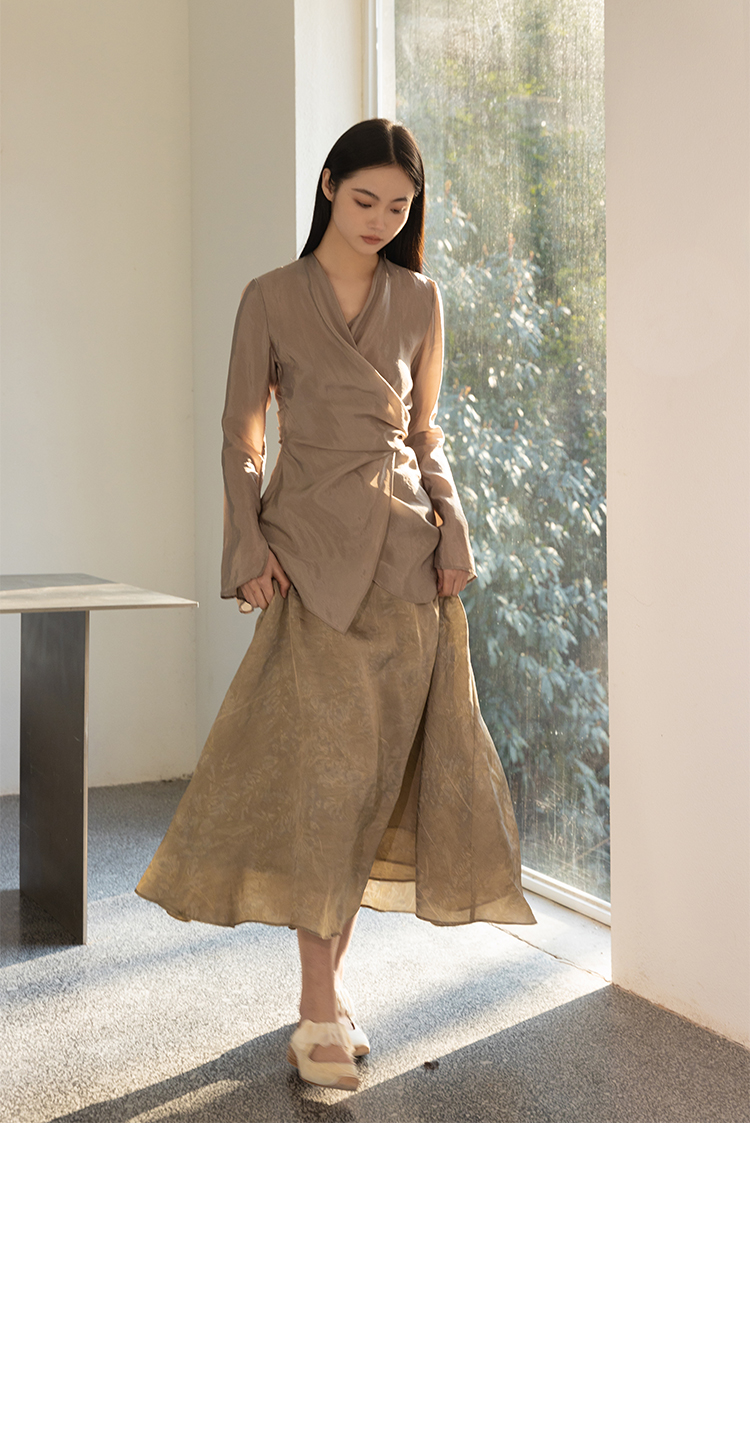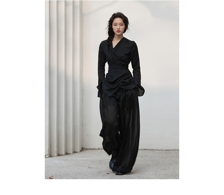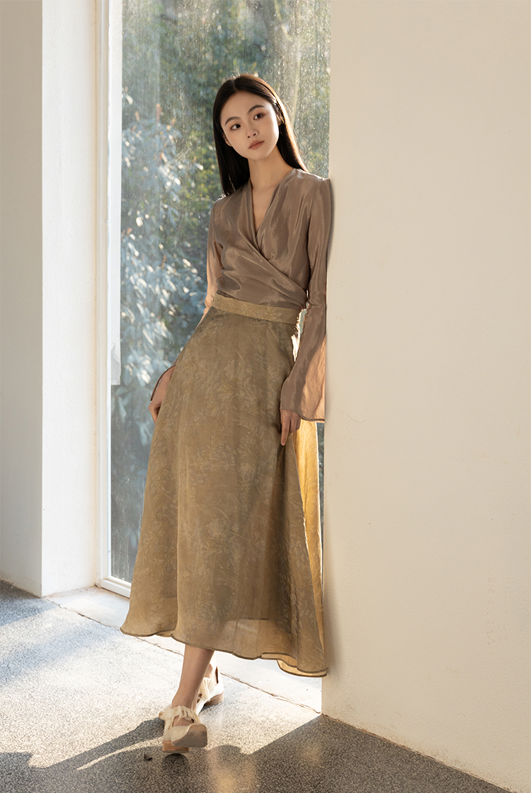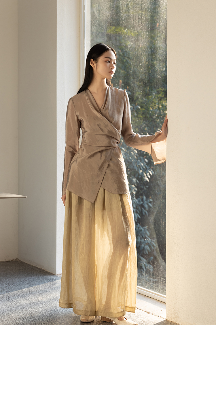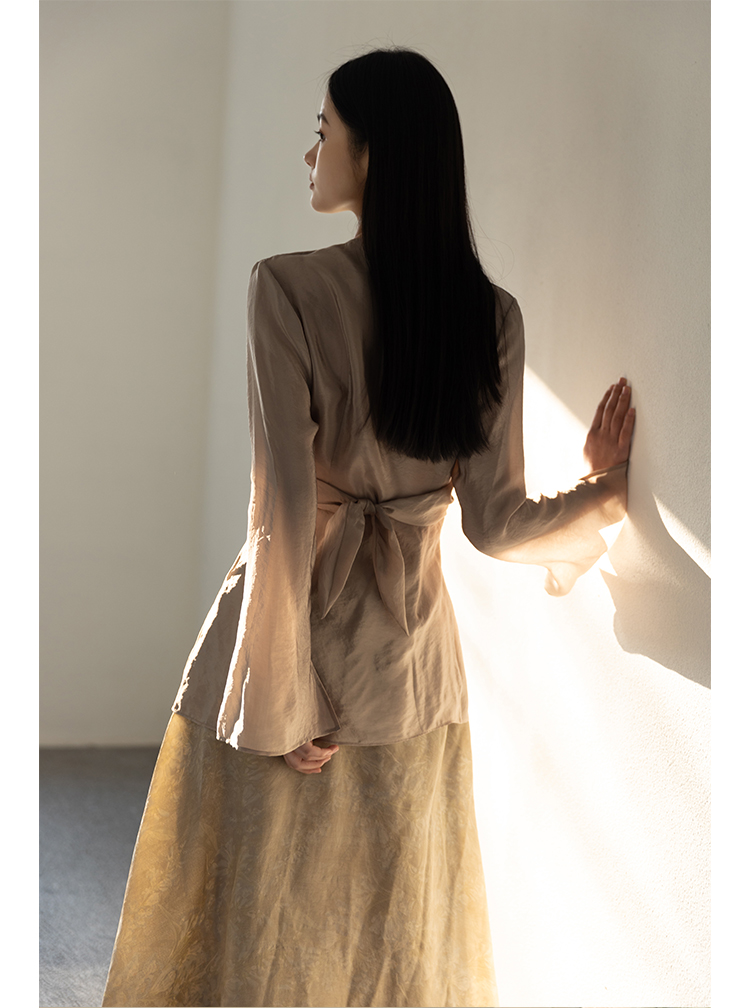 Asaya2159 : Silk fabric wrap-style slim v-neck trumpet sleeve shirt spring and summer elegant temperament long-sleeved top women
