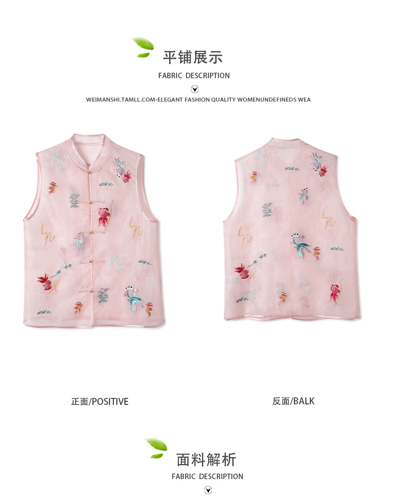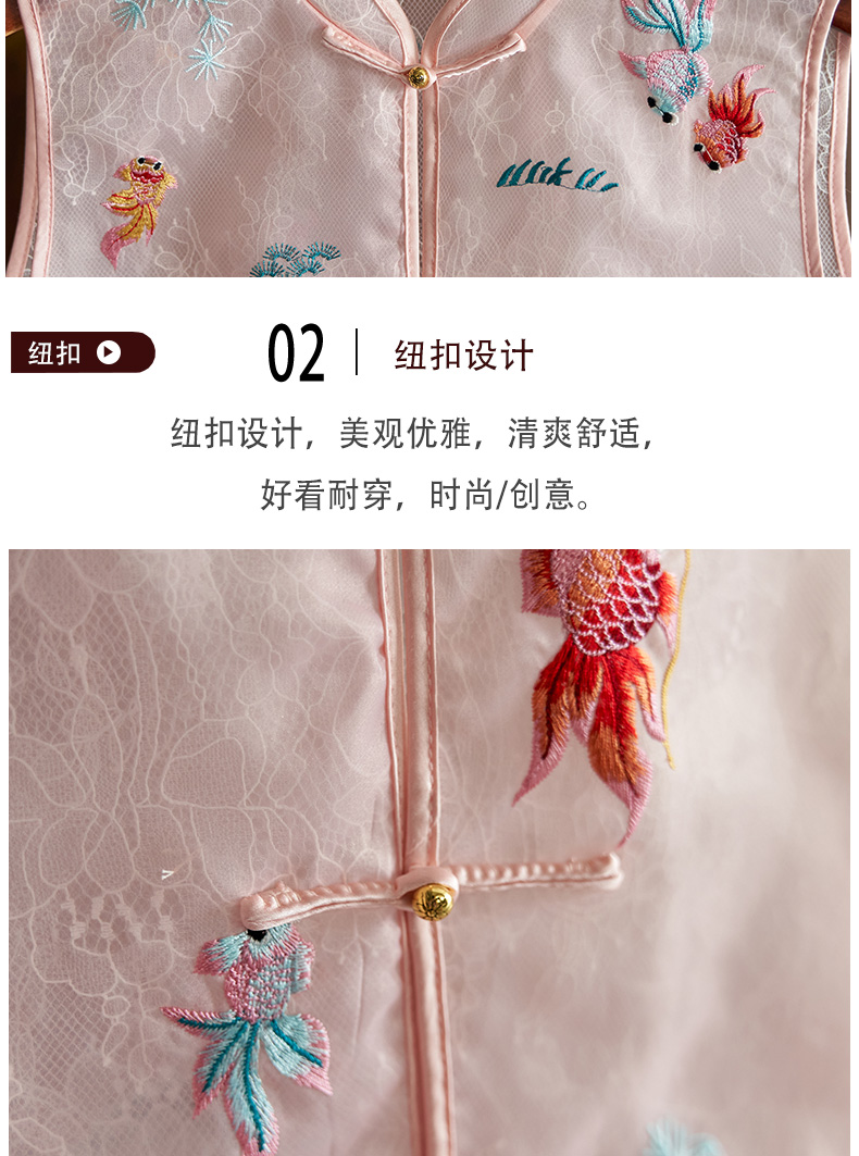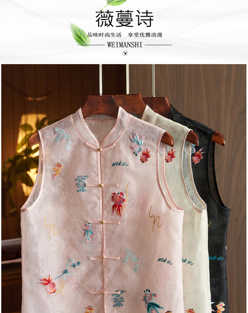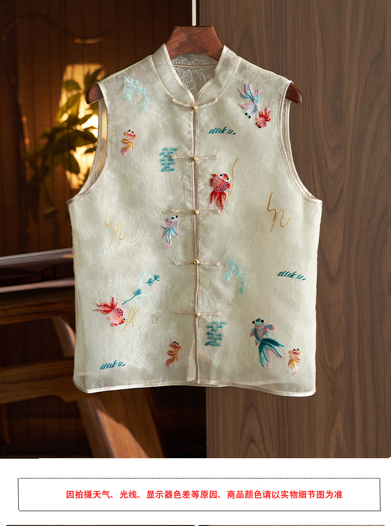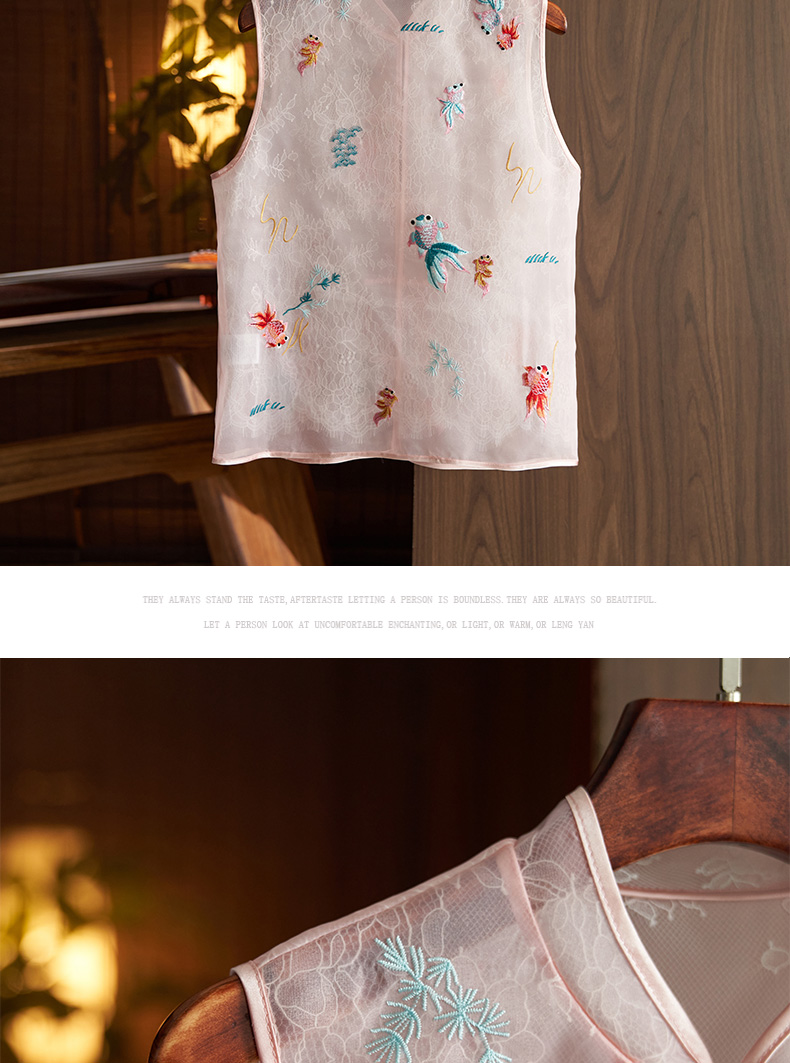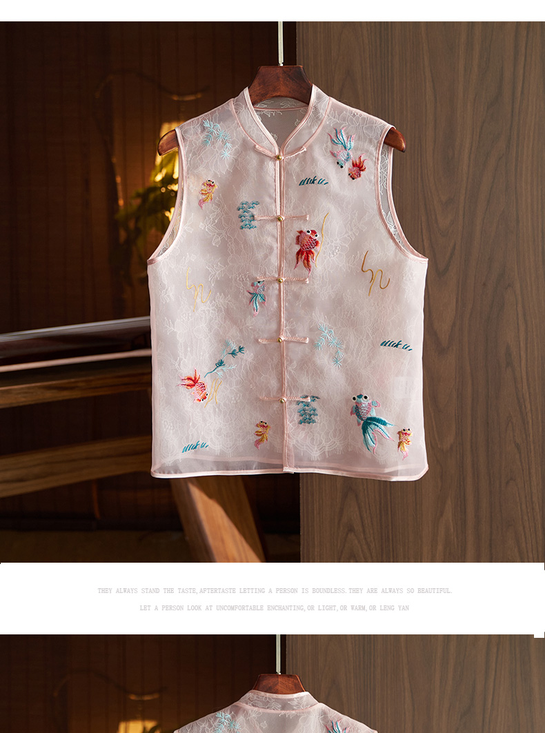Asaya2090 : Goldfish embroidery light and transparent stand-up collar buckle lace stitching vest spring and summer new top