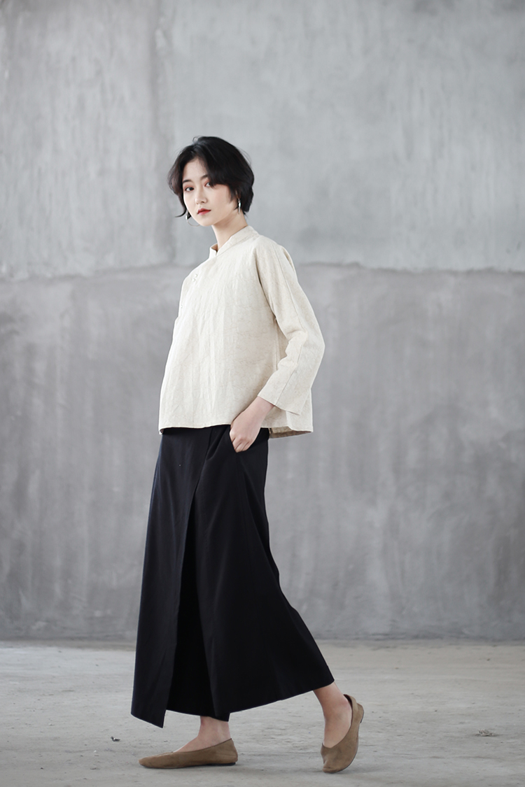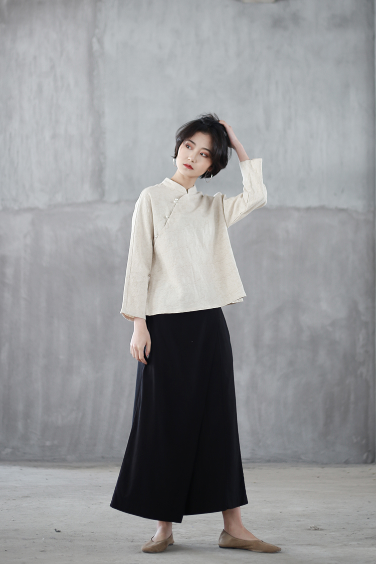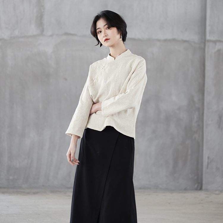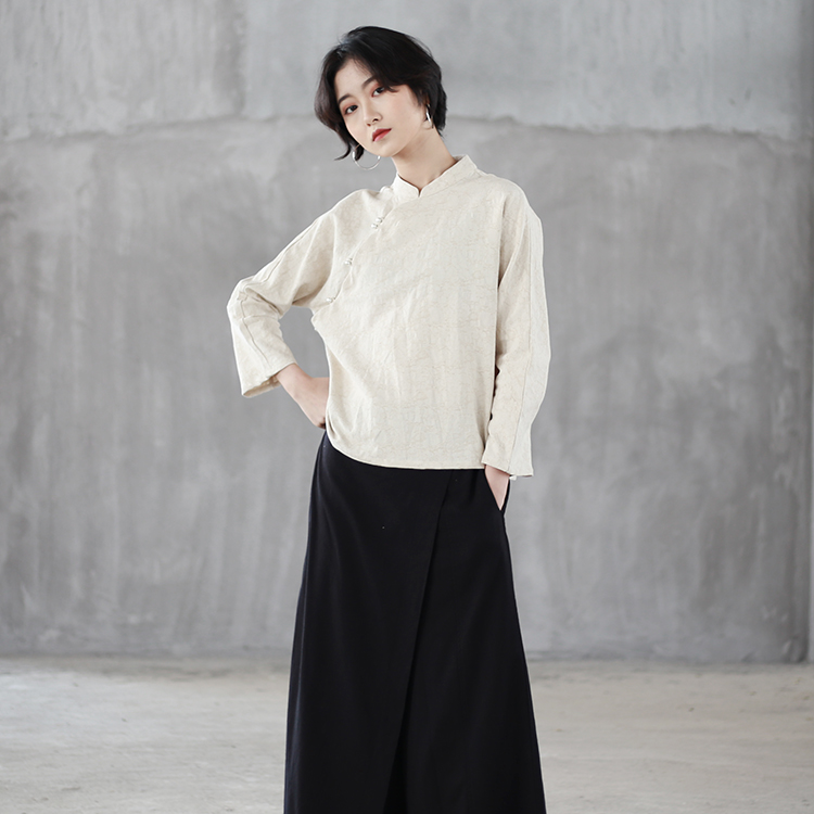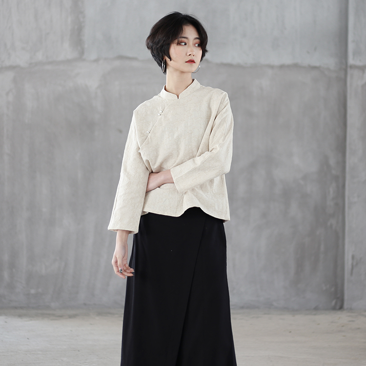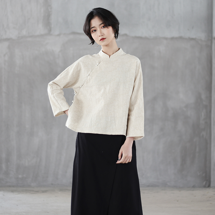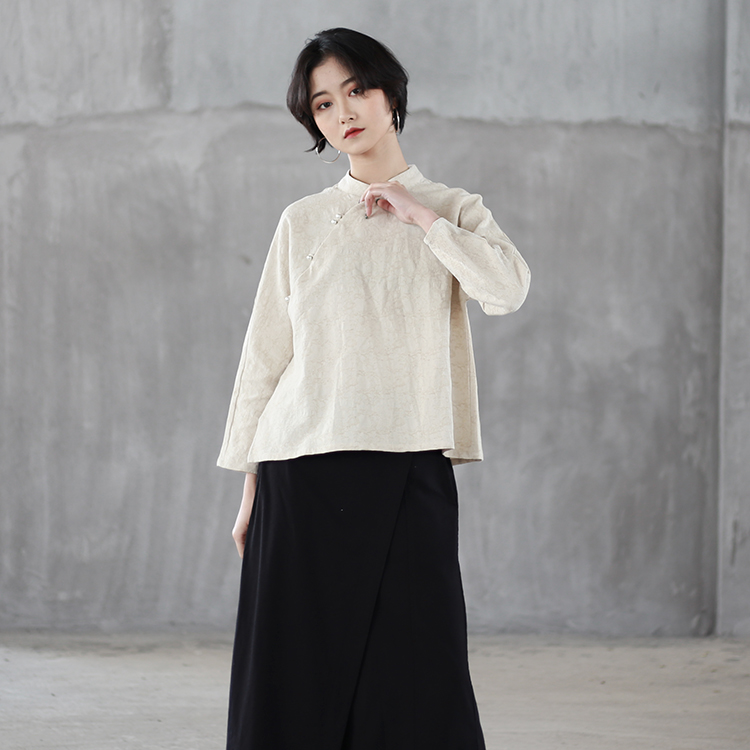 ASAYA1796 : Spring and autumn Chinese style shirt, women's stand collar, slanted placket, beaded button, tea dress, cotton and linen jacquard shirt, cropped sleeves, loose top