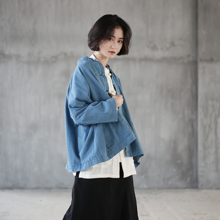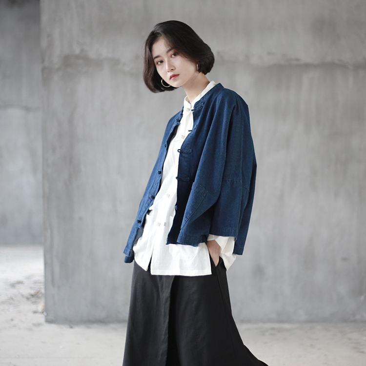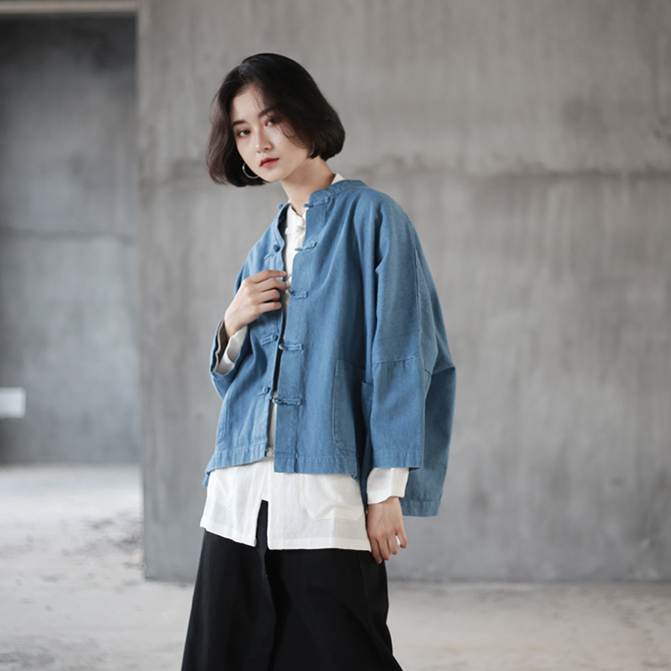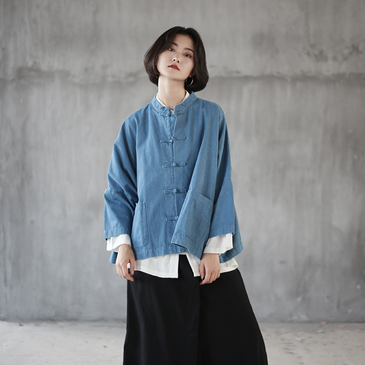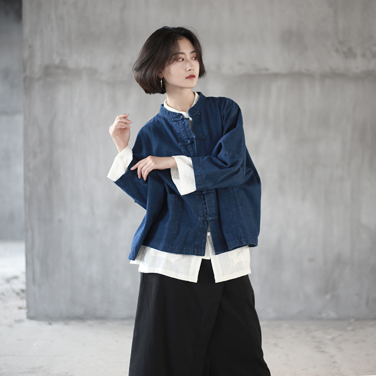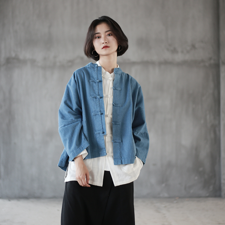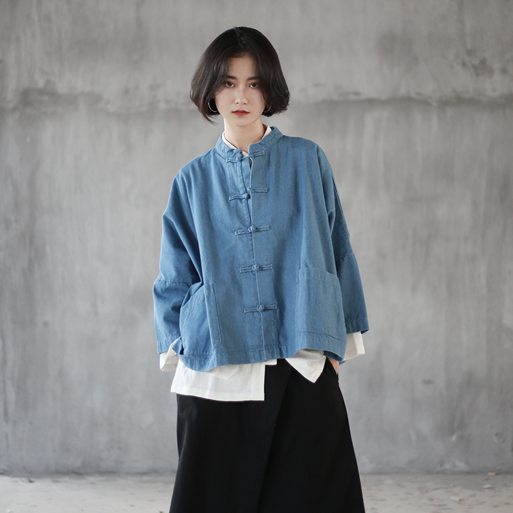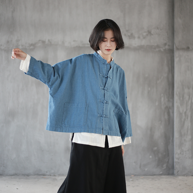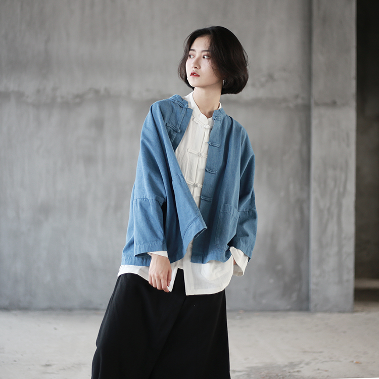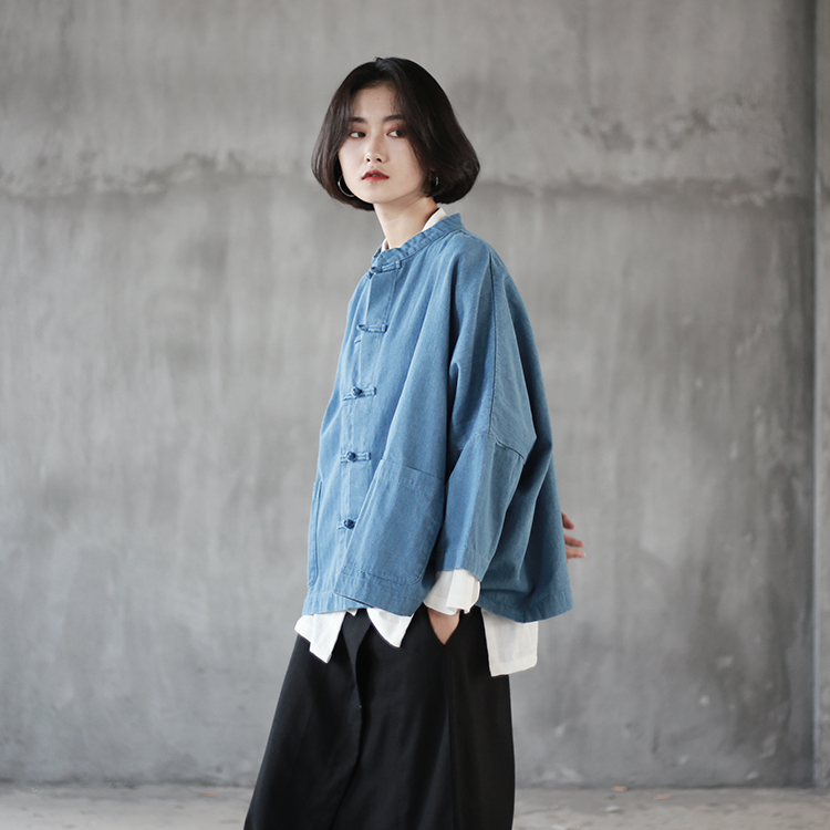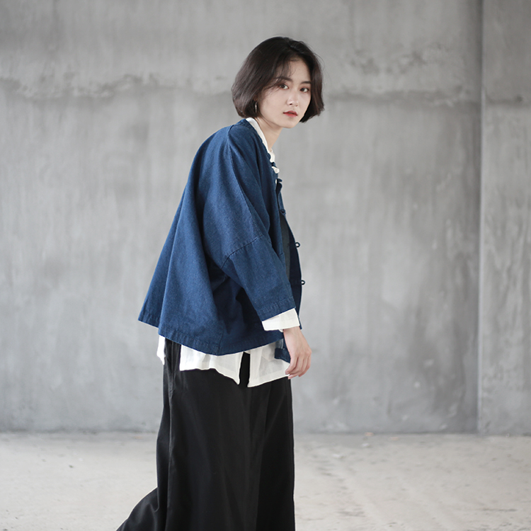 ASAYA1800 Spring Chinese style denim short jacket women's vintage cropped sleeve button cardigan stand collar loose bat sleeve cardigan top