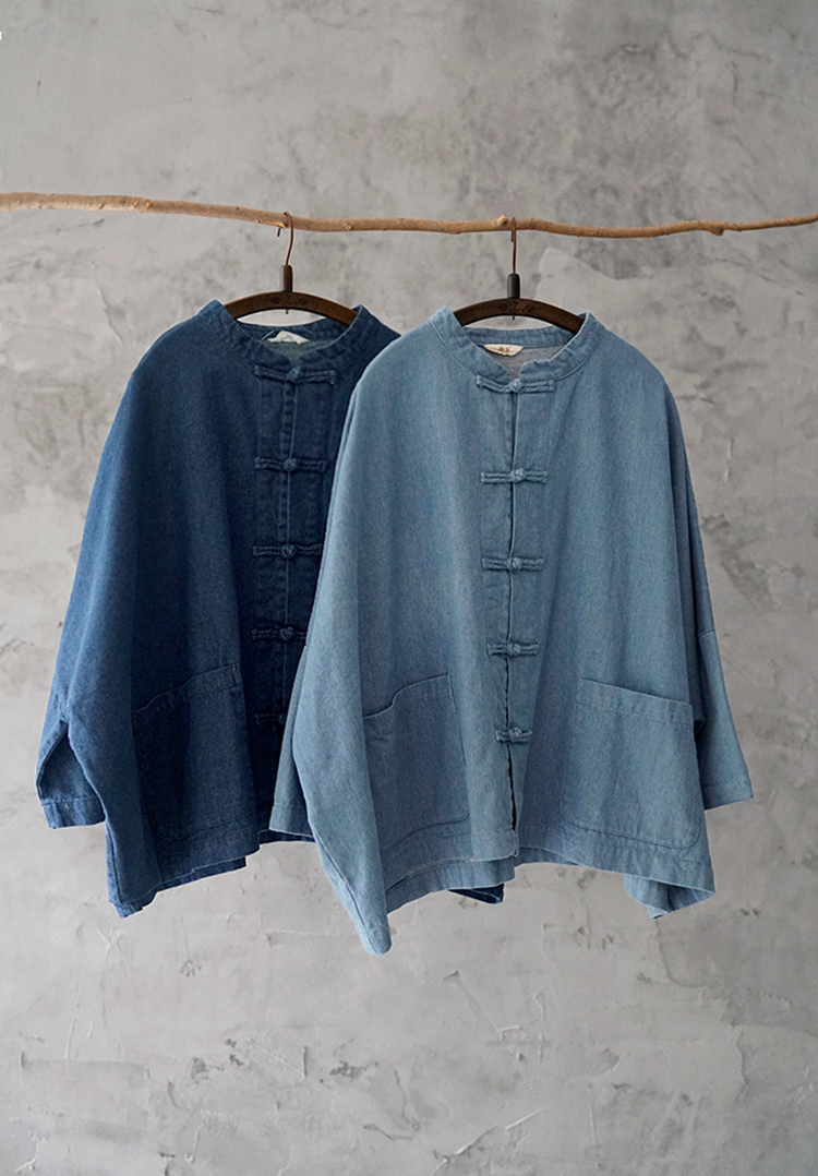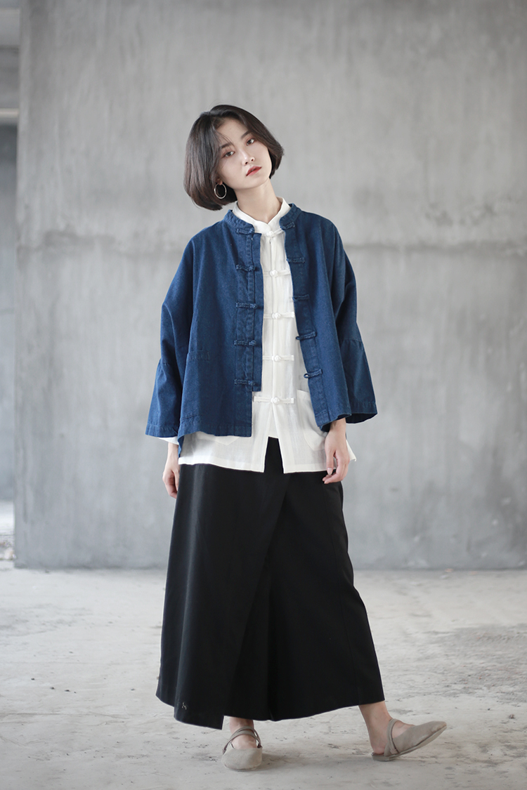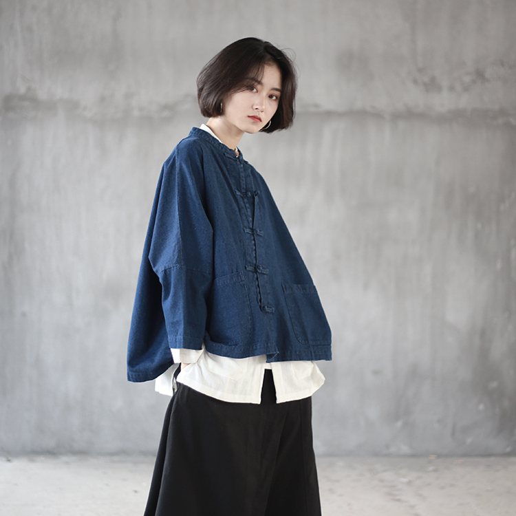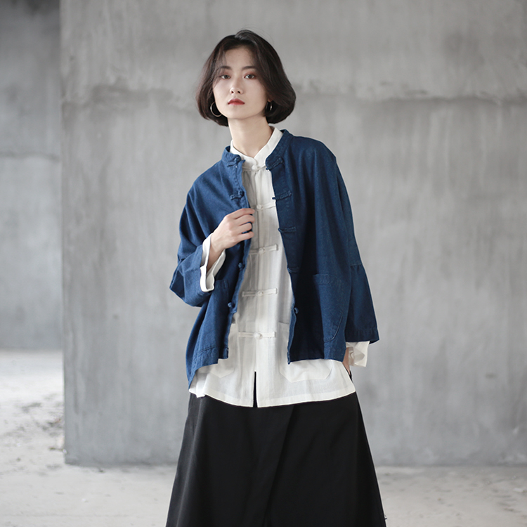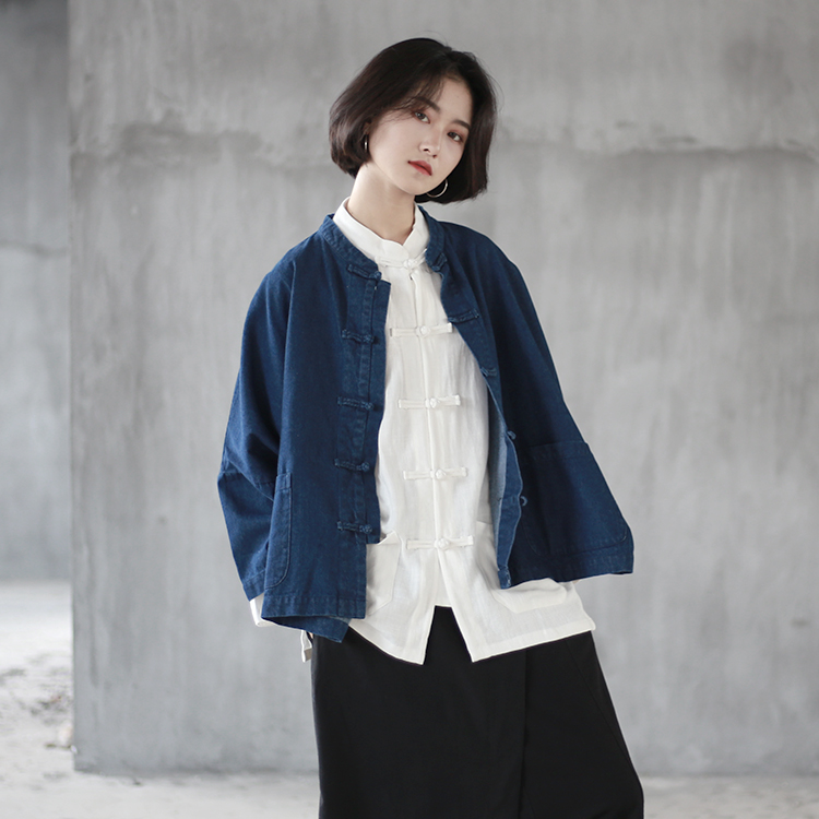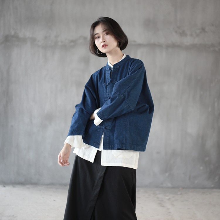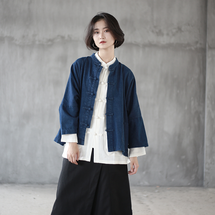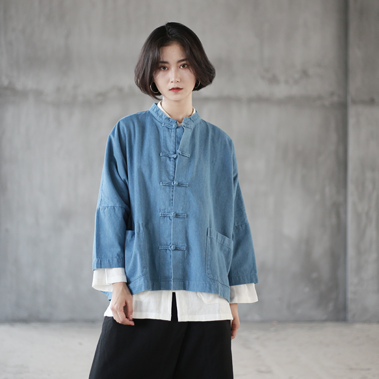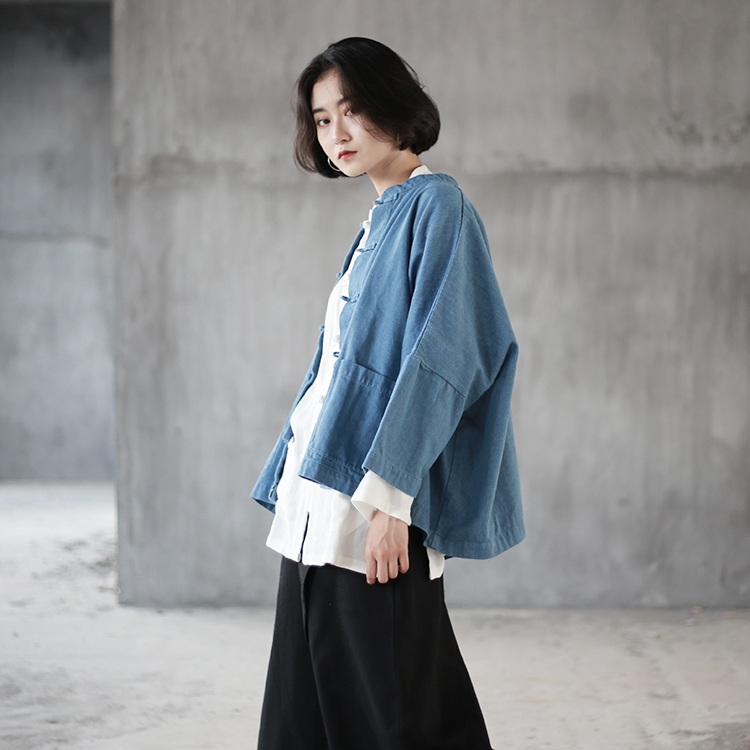 ASAYA1800 Spring Chinese style denim short jacket women's vintage cropped sleeve button cardigan stand collar loose bat sleeve cardigan top