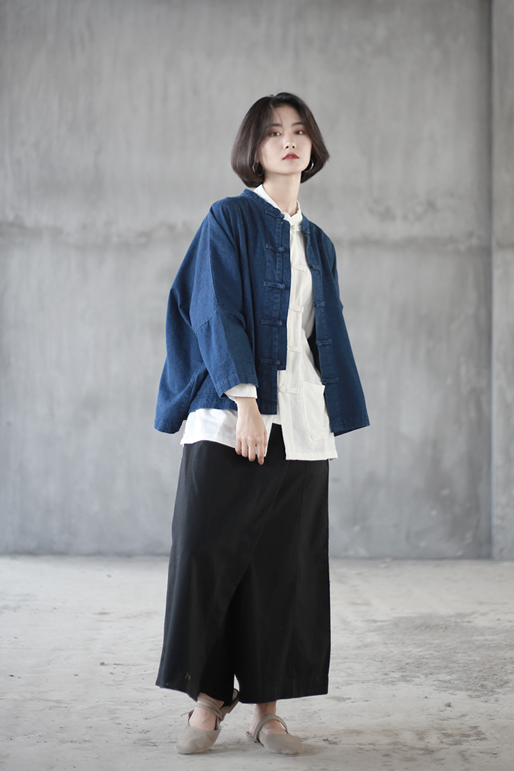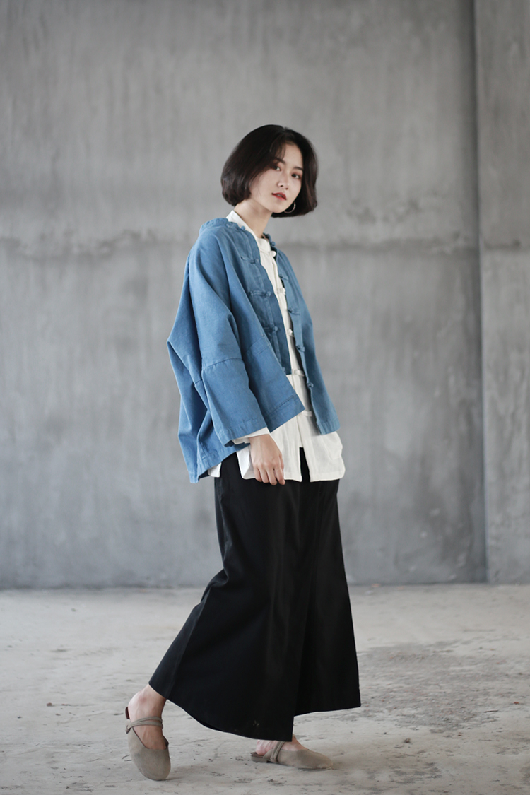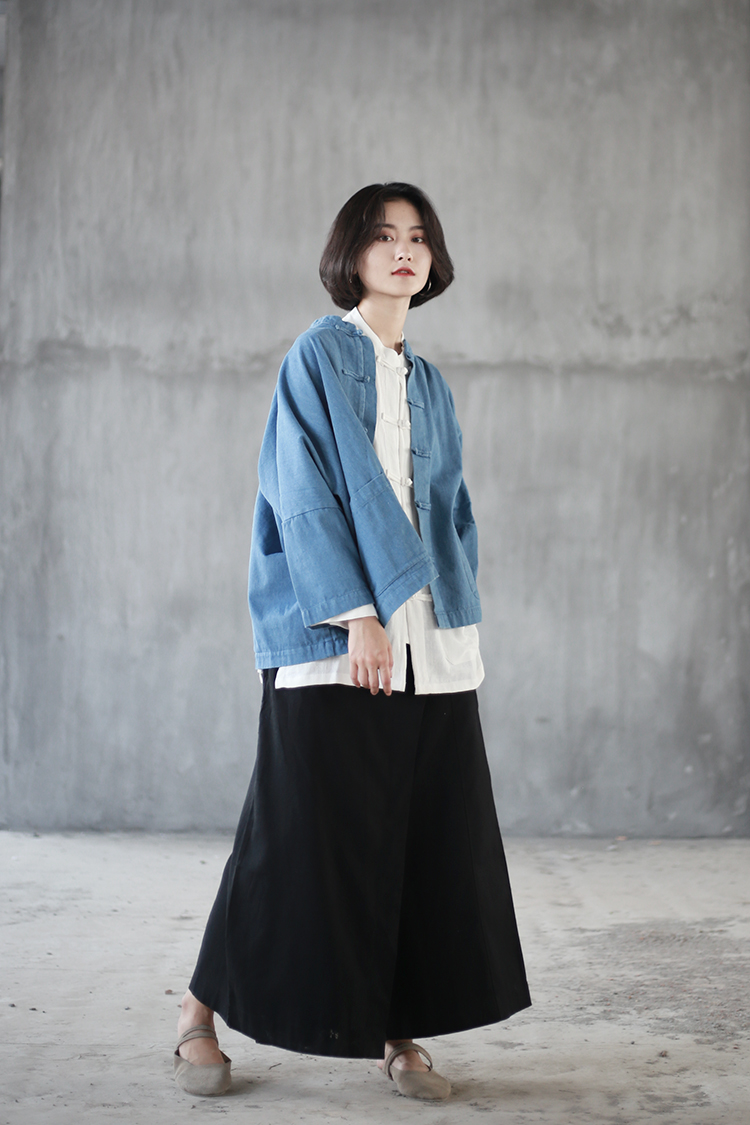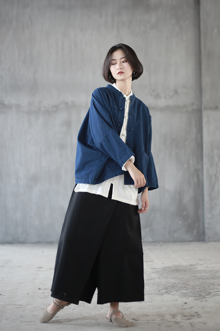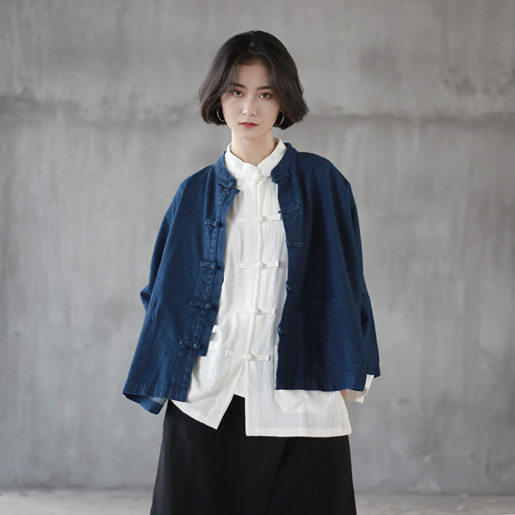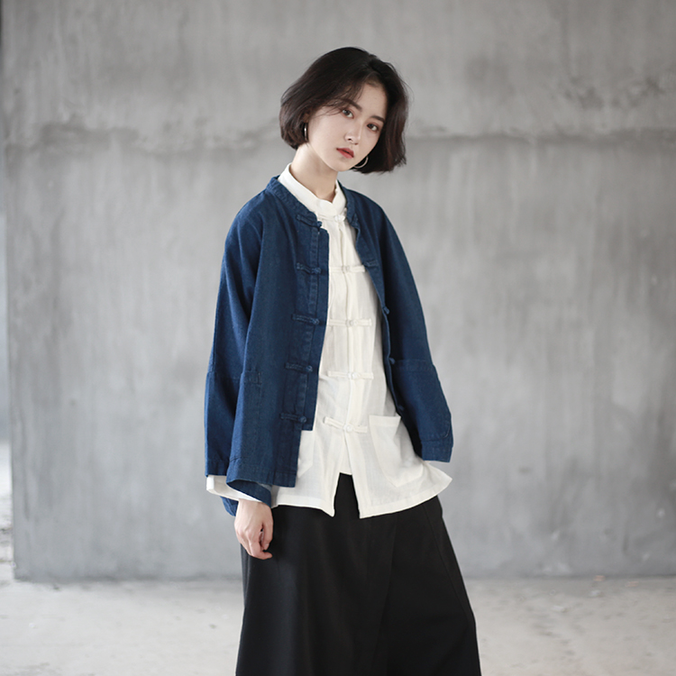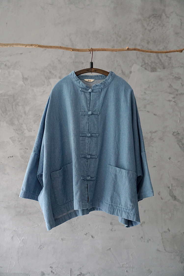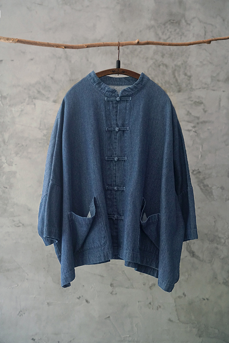 ASAYA1800 Spring Chinese style denim short jacket women's vintage cropped sleeve button cardigan stand collar loose bat sleeve cardigan top