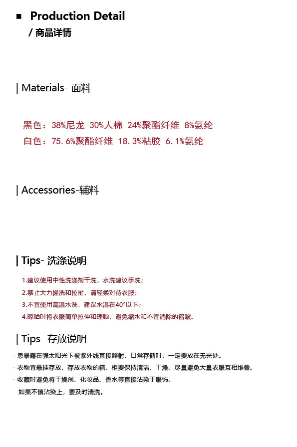 Material composition | Polyester fiber 75.6% viscose fiber (viscose fiber) 18.3% polyurethane elastic fiber (spandex) 6.1% |
