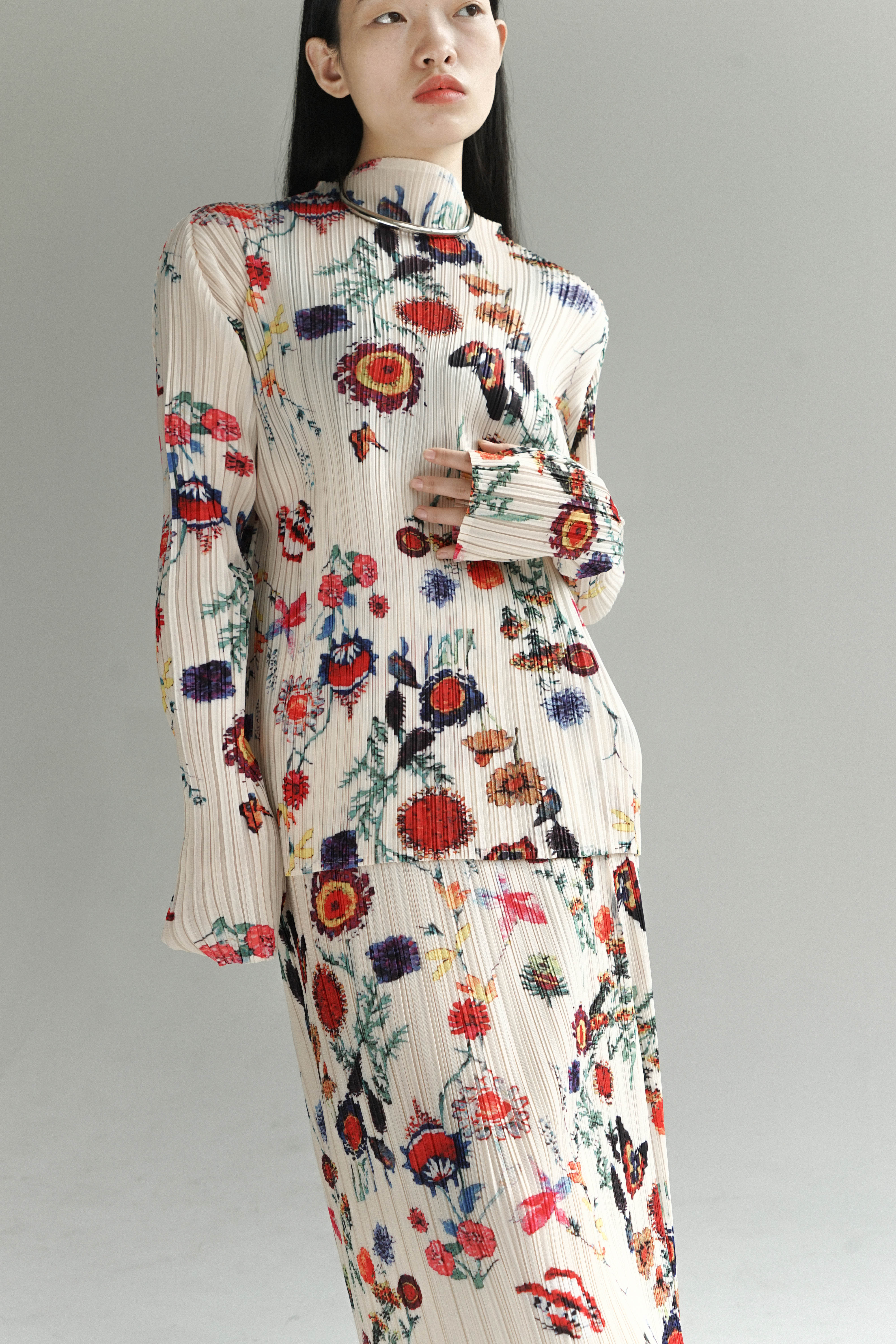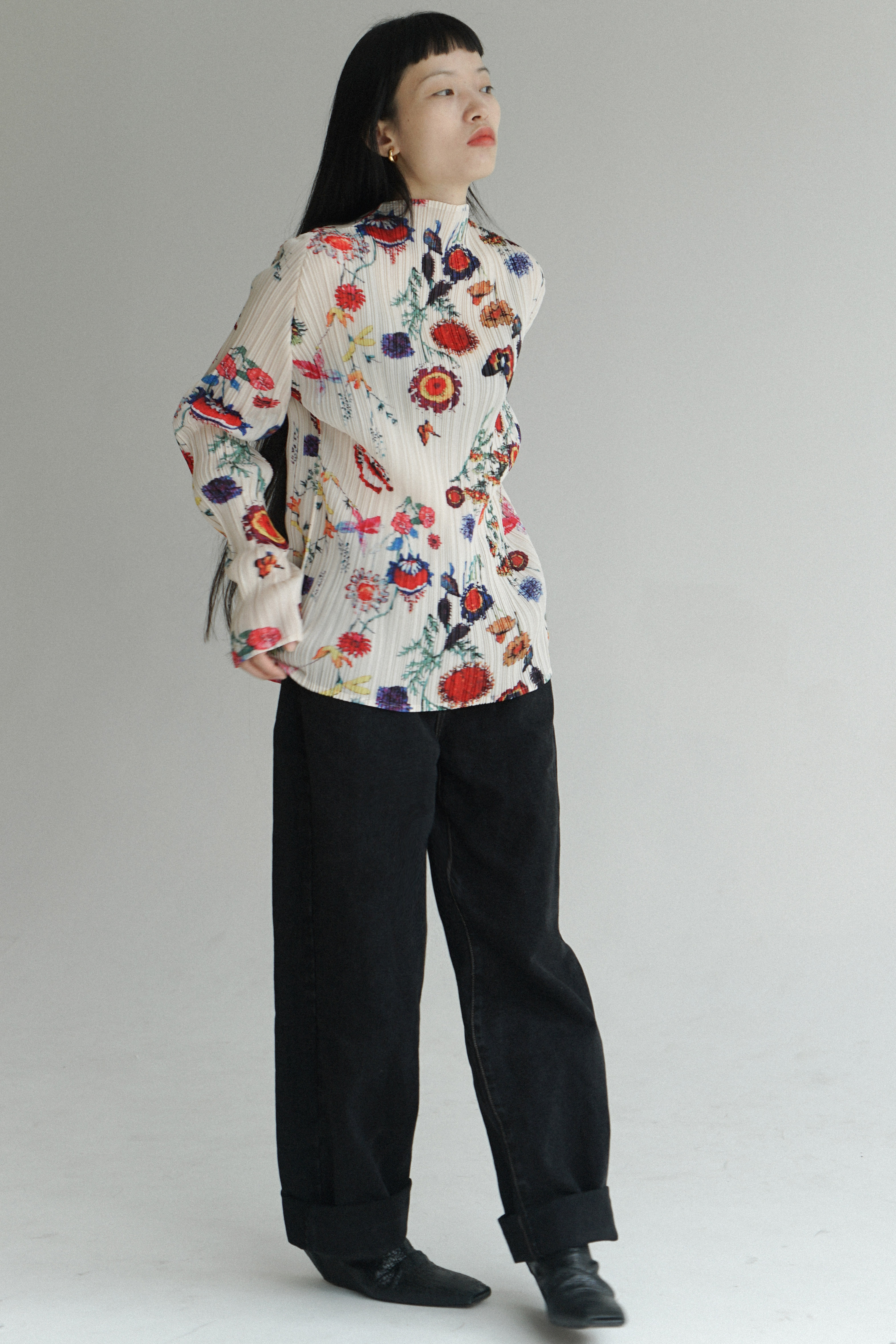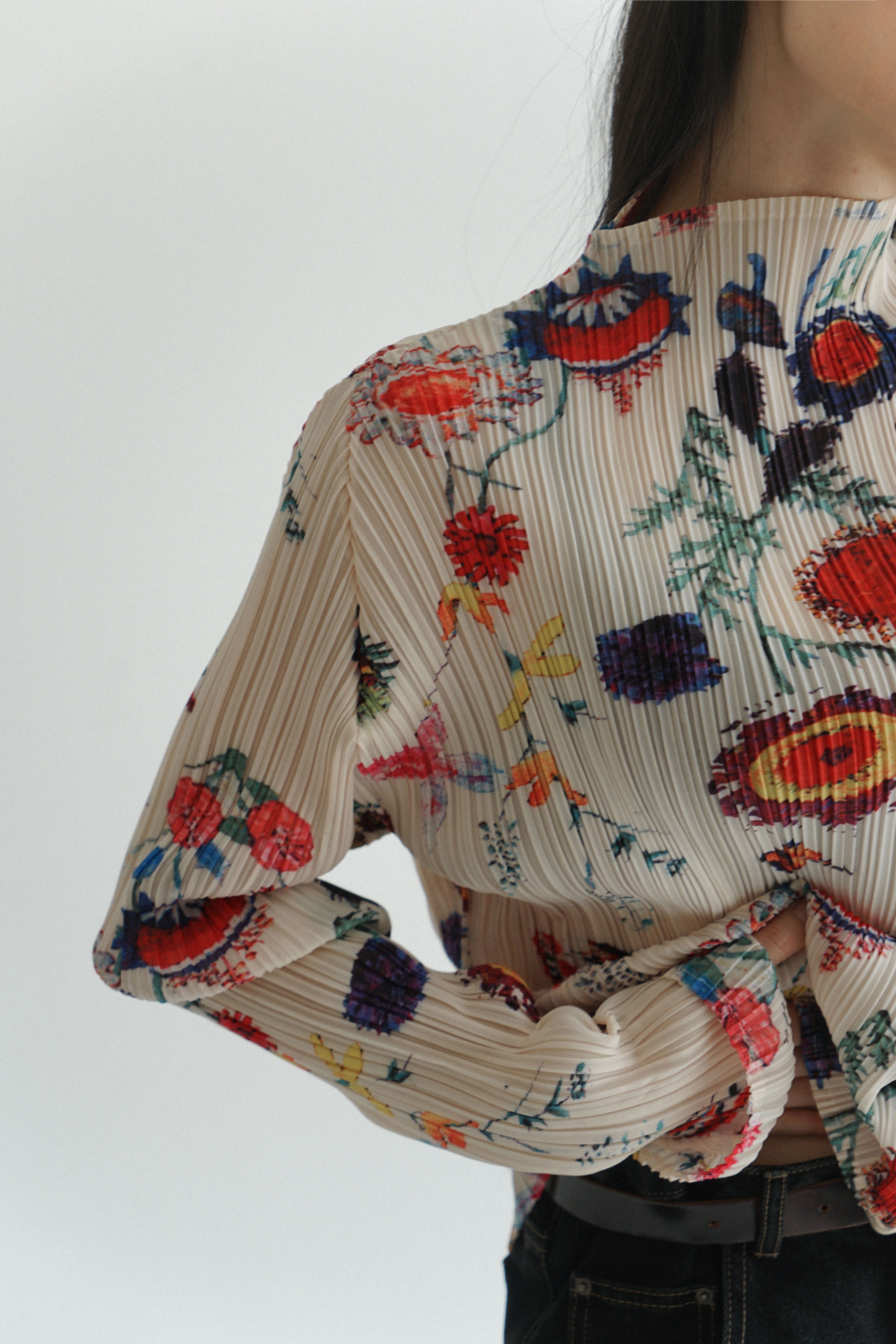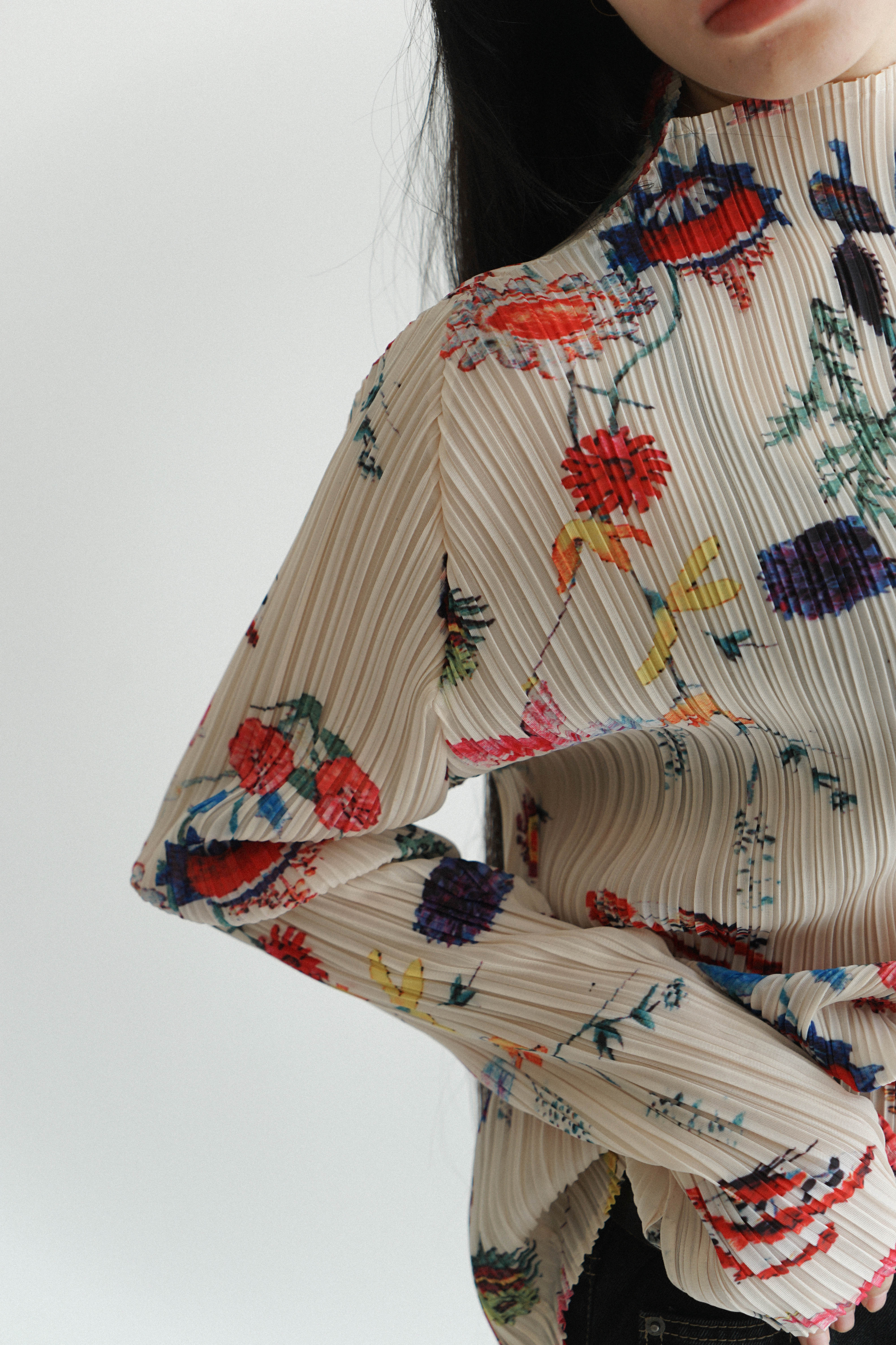 ASAYA1675 TLonely1 long sleeved base pleated print stand up collar long sleeved pullover floral long sleeved T shirt
