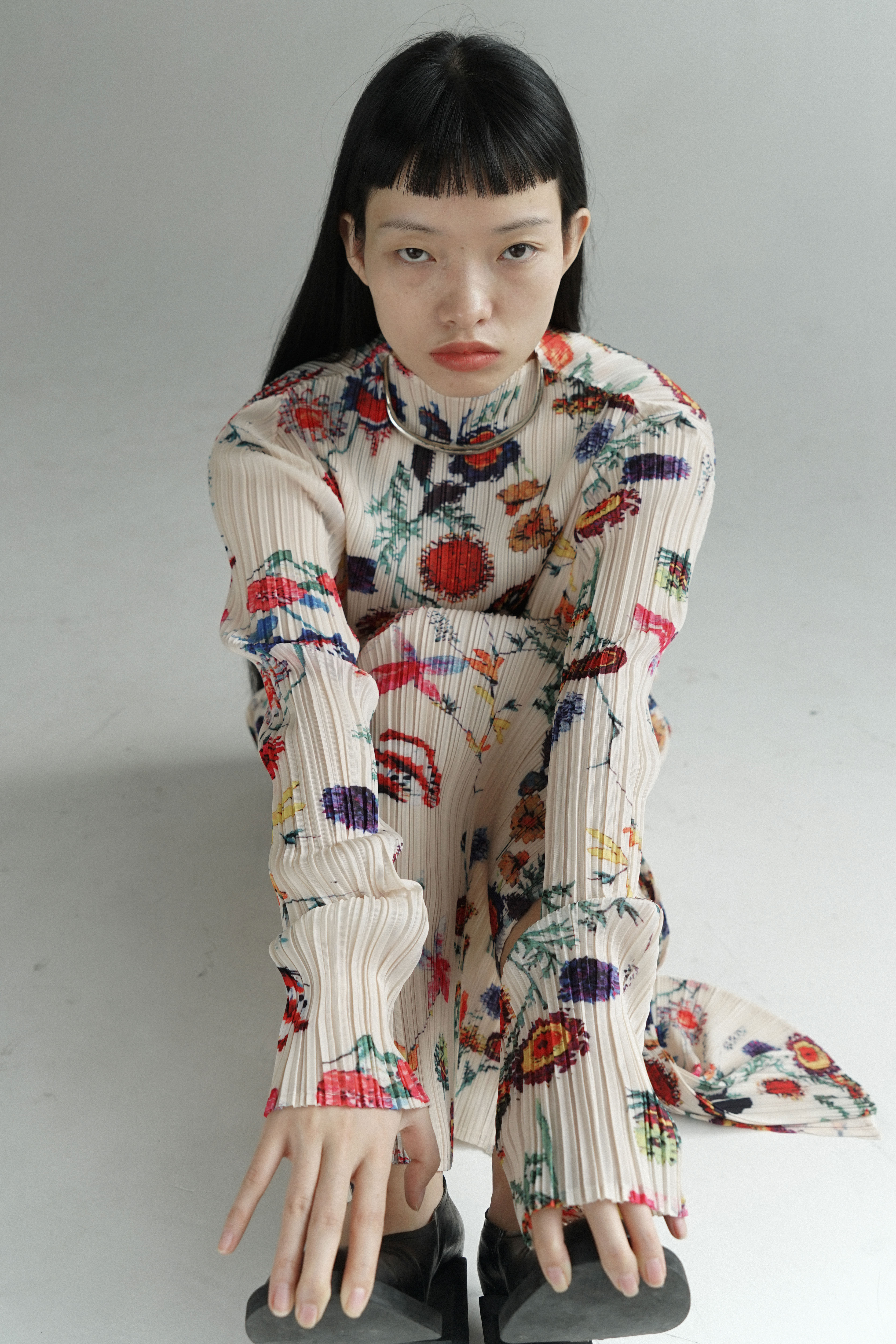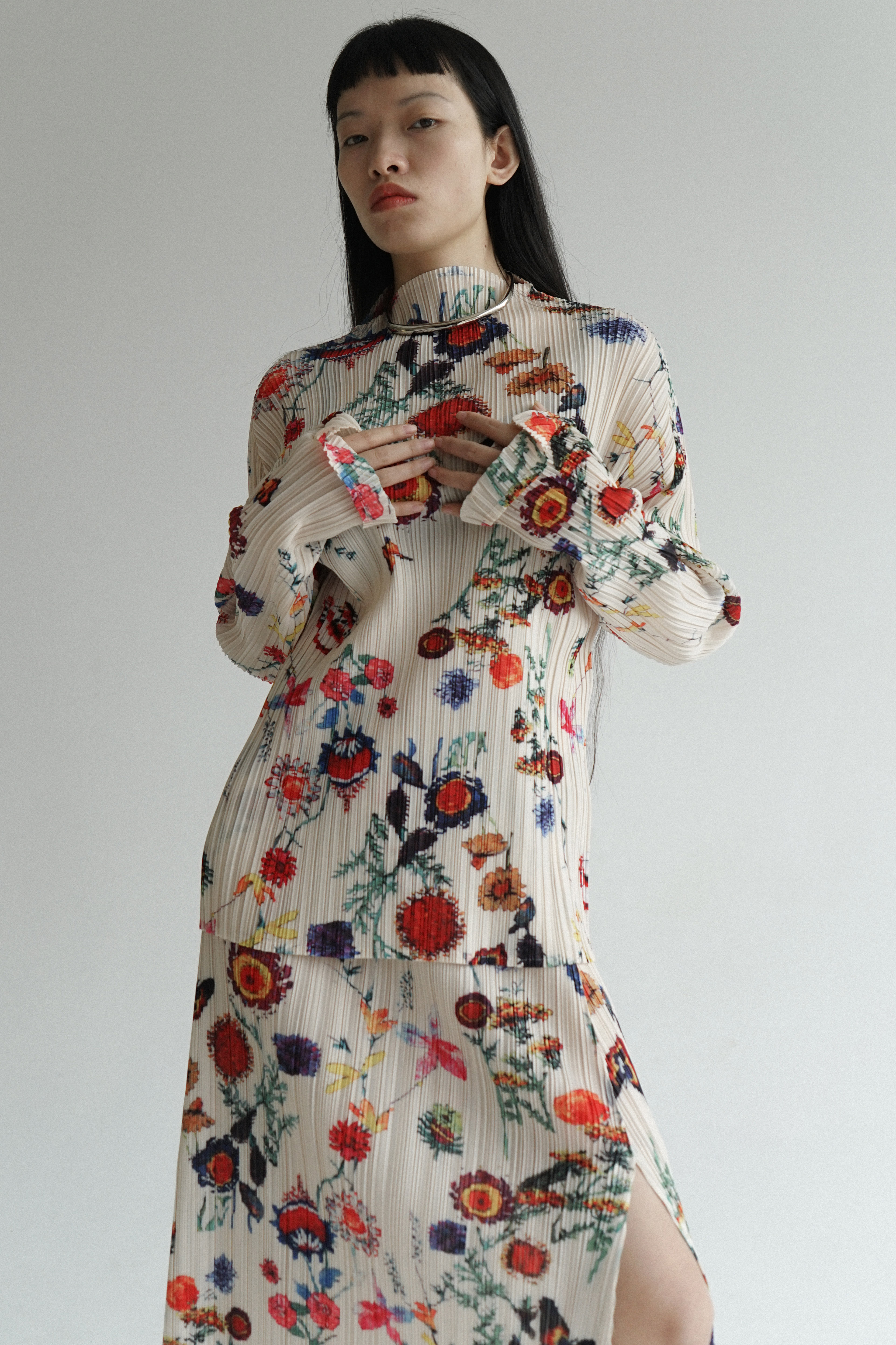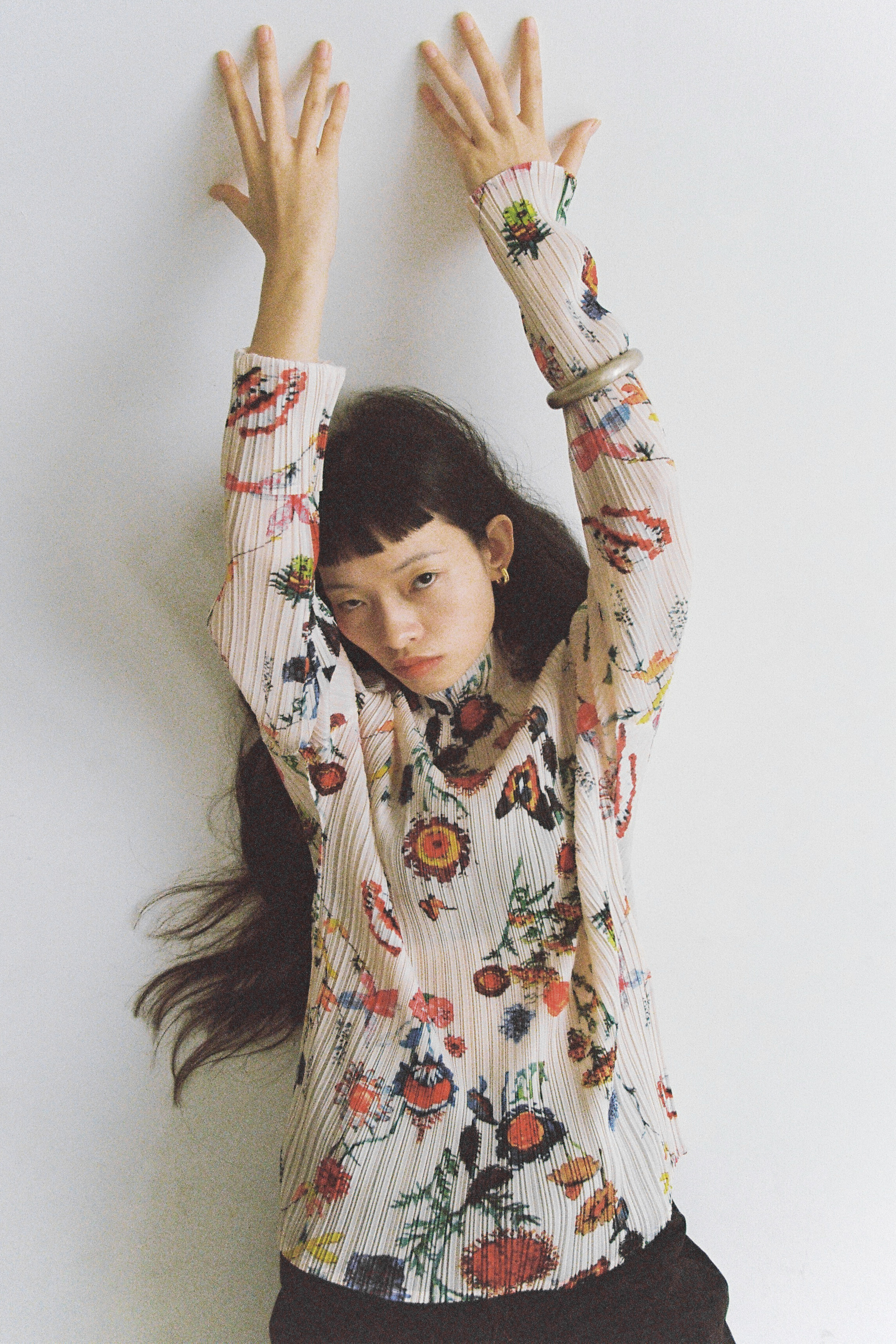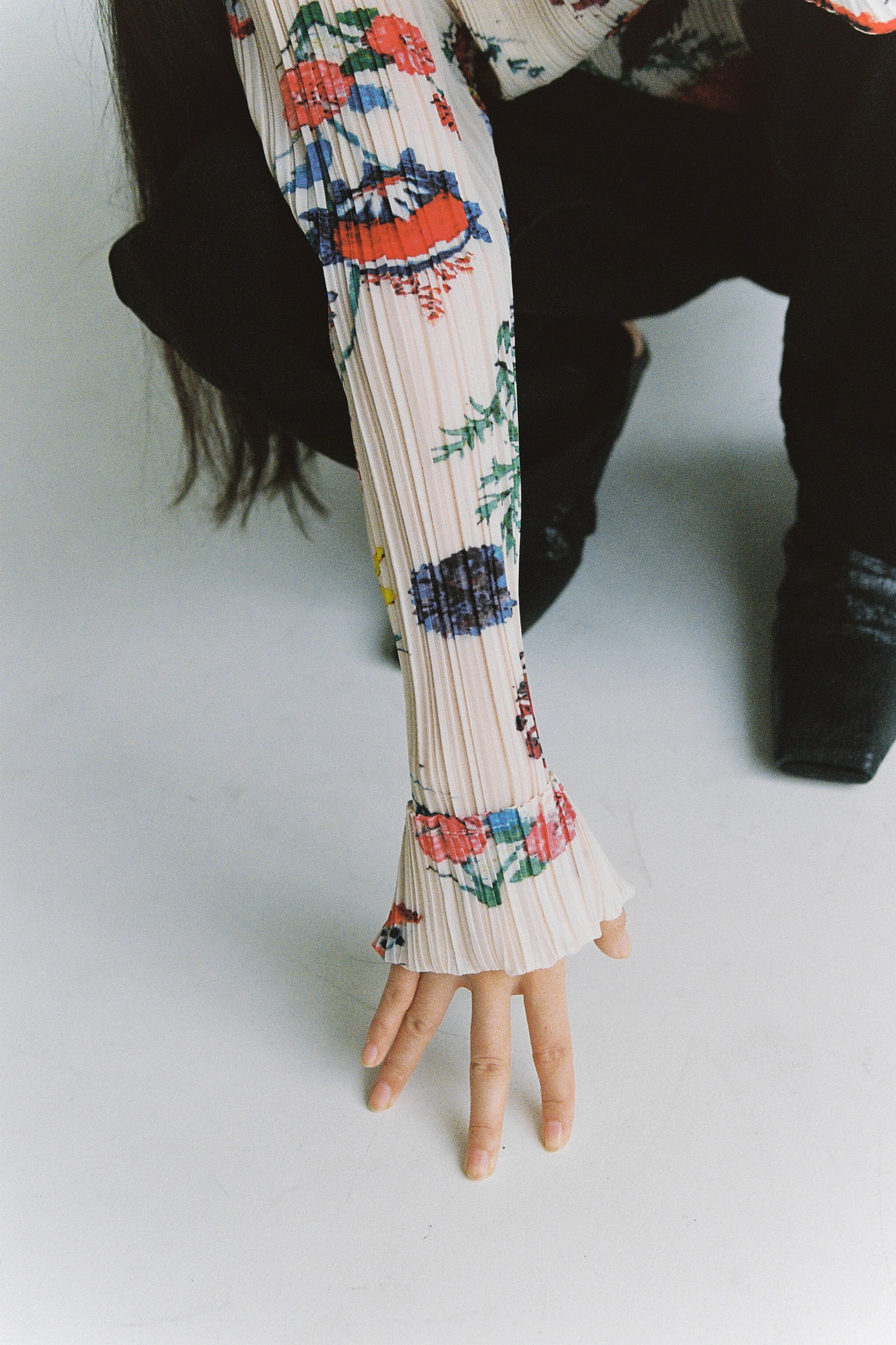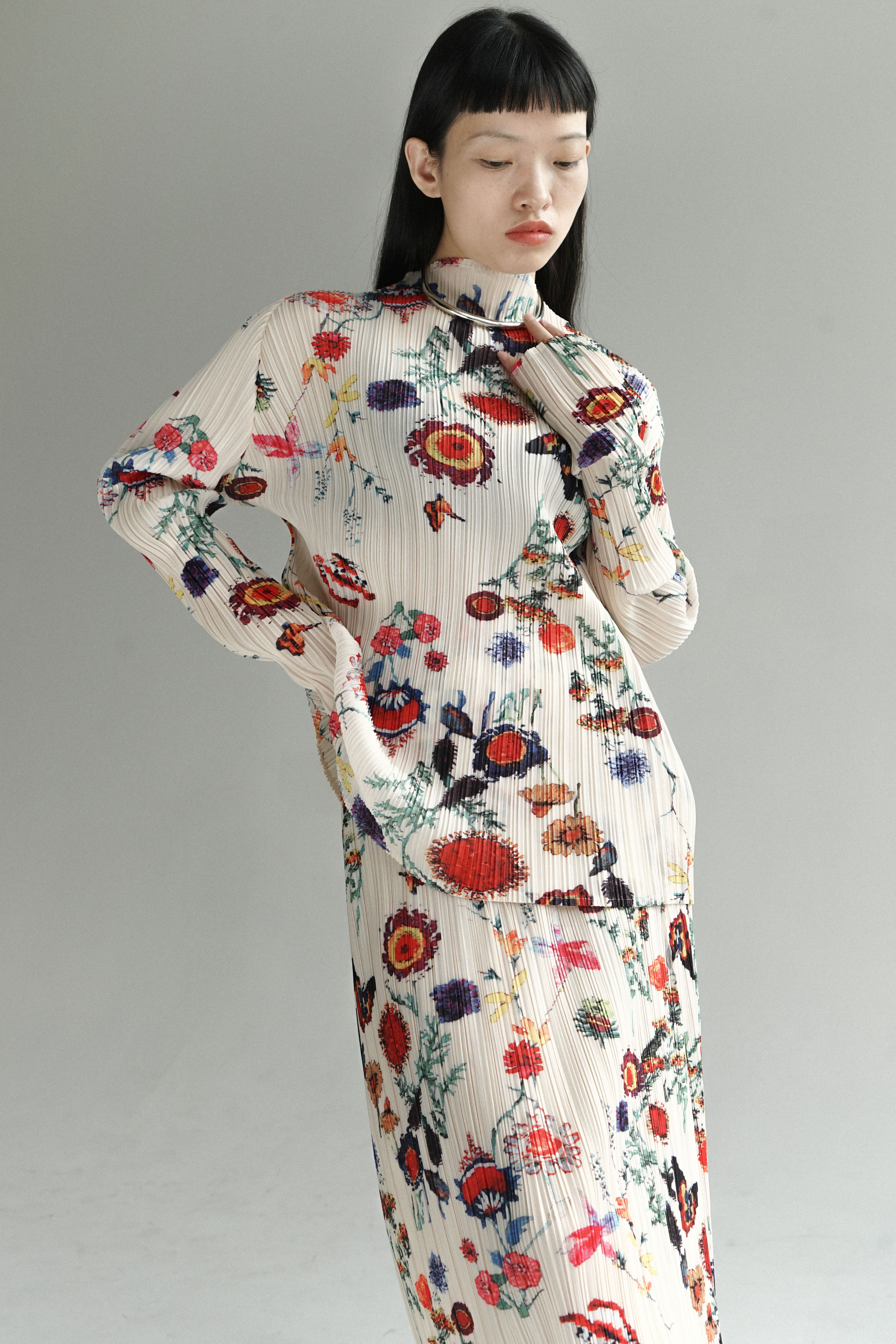 ASAYA1675 TLonely1 long sleeved base pleated print stand up collar long sleeved pullover floral long sleeved T shirt