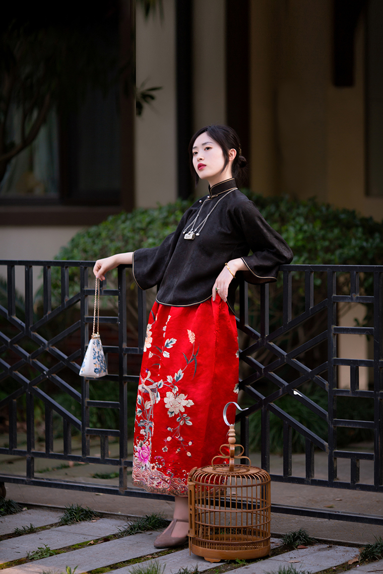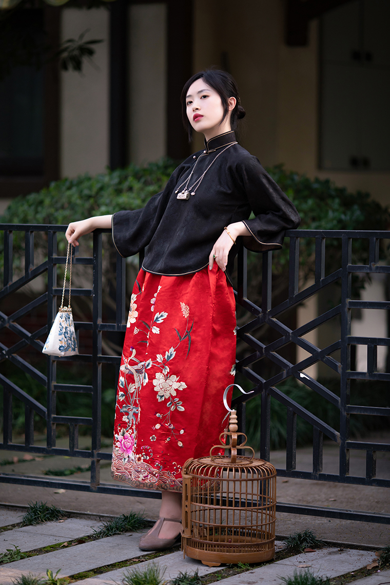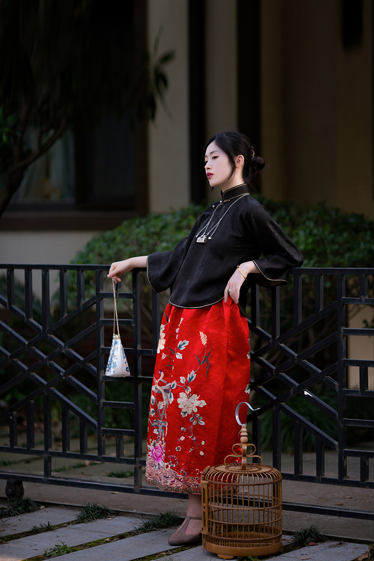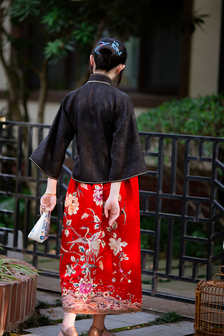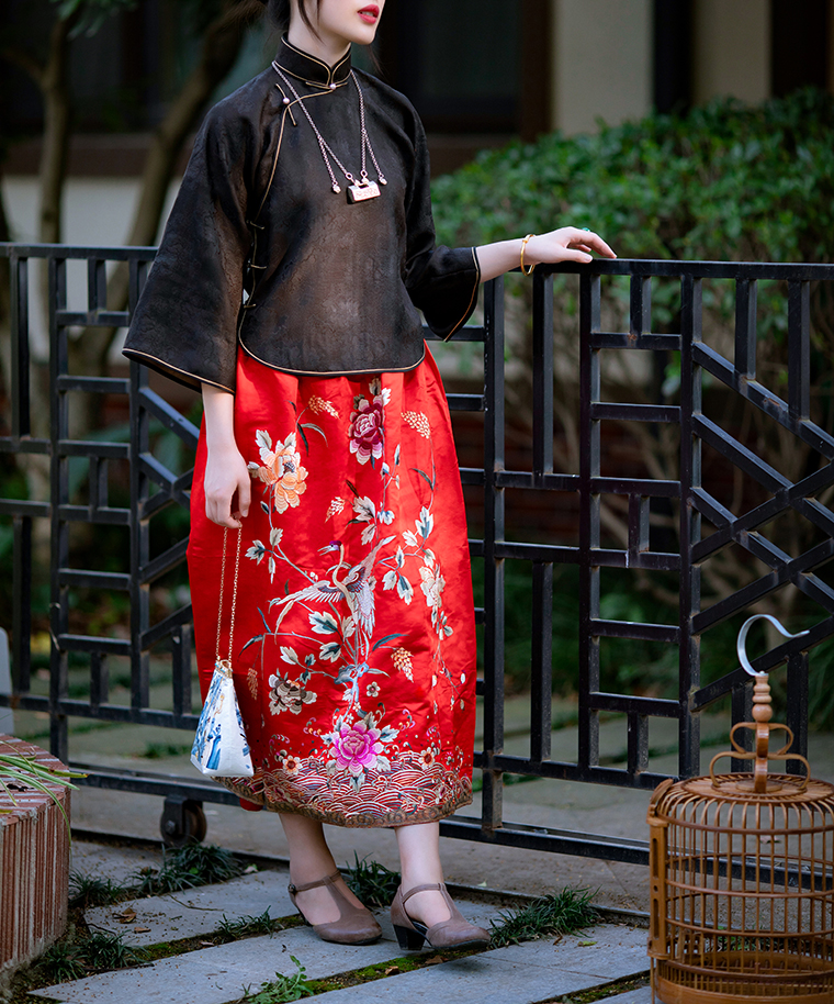 Color classification | Red machine embroidered top, red machine embroidered half skirt |