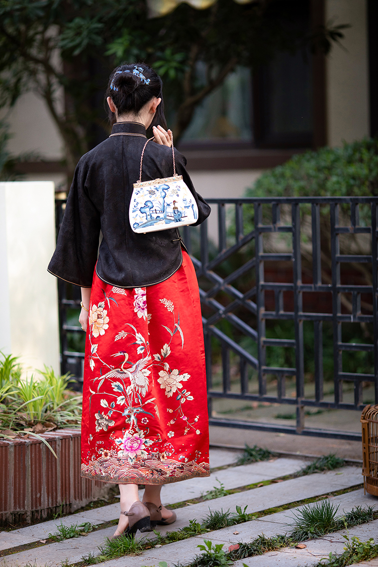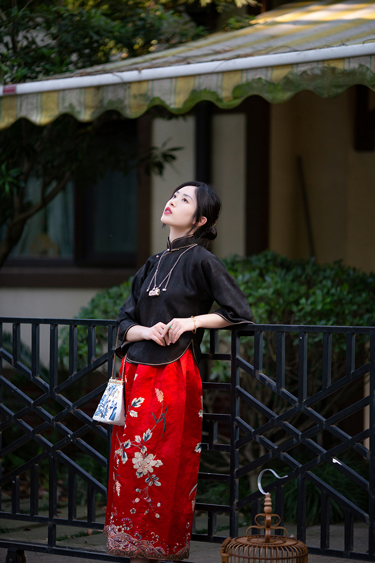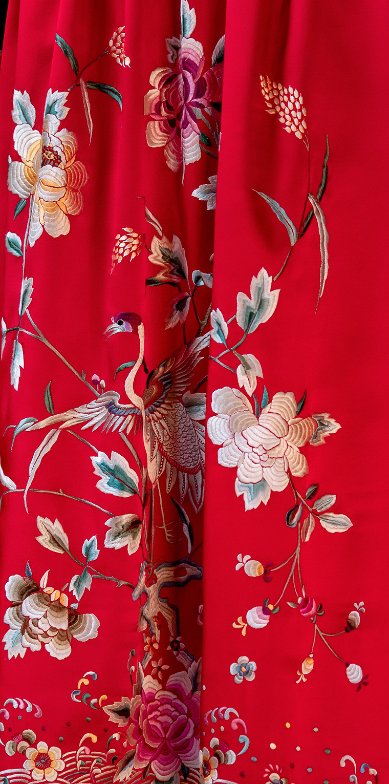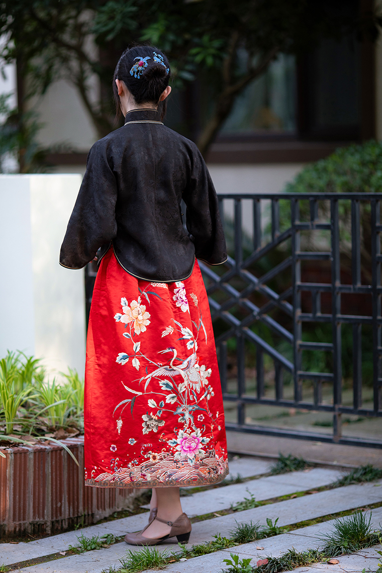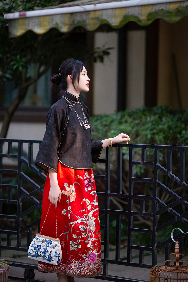 Color classification | Red machine embroidered top, red machine embroidered half skirt |