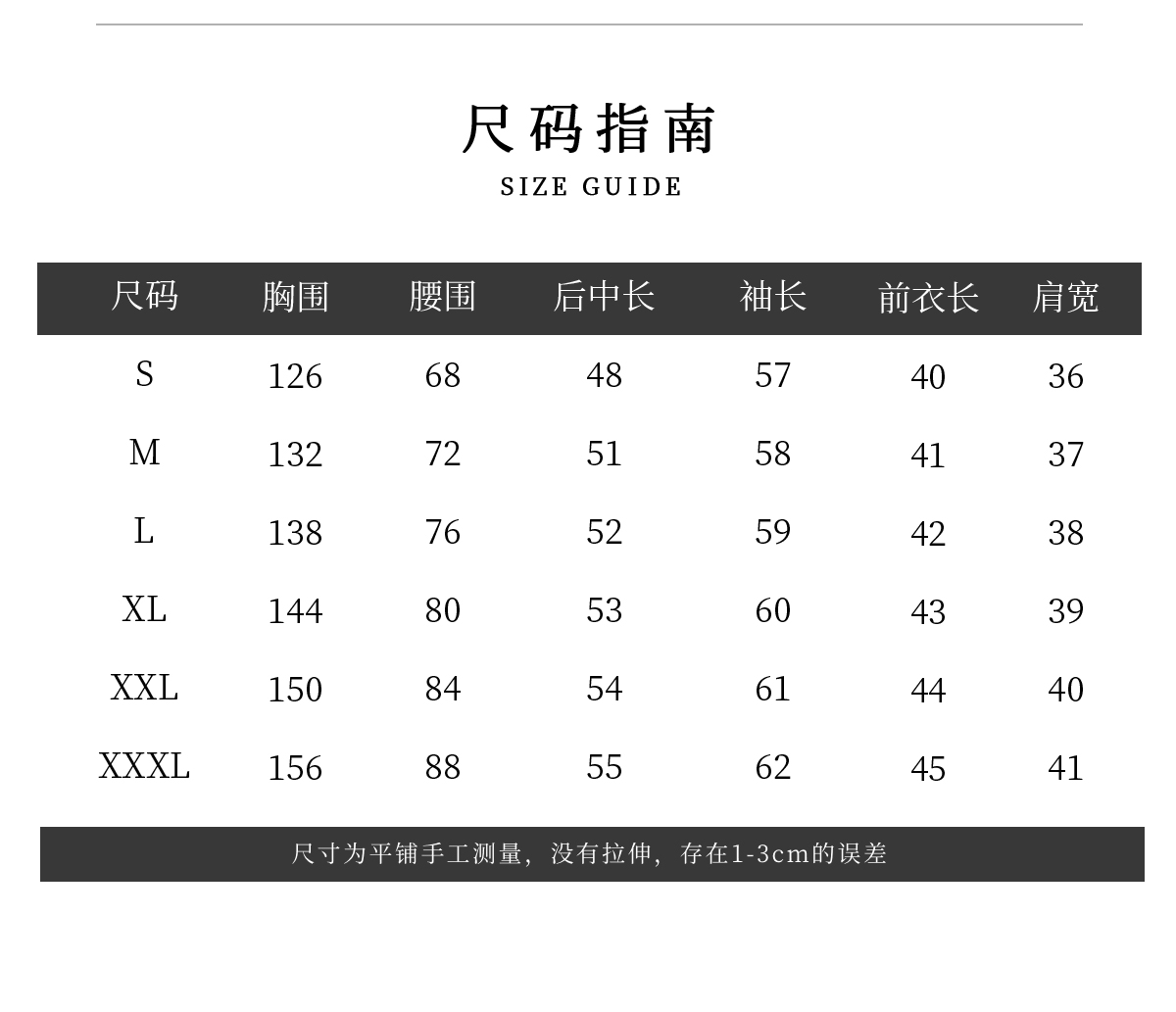 尺码 | 前长(cm) | 胸围(cm) | 袖长(cm) | 圆摆后中长(cm) |