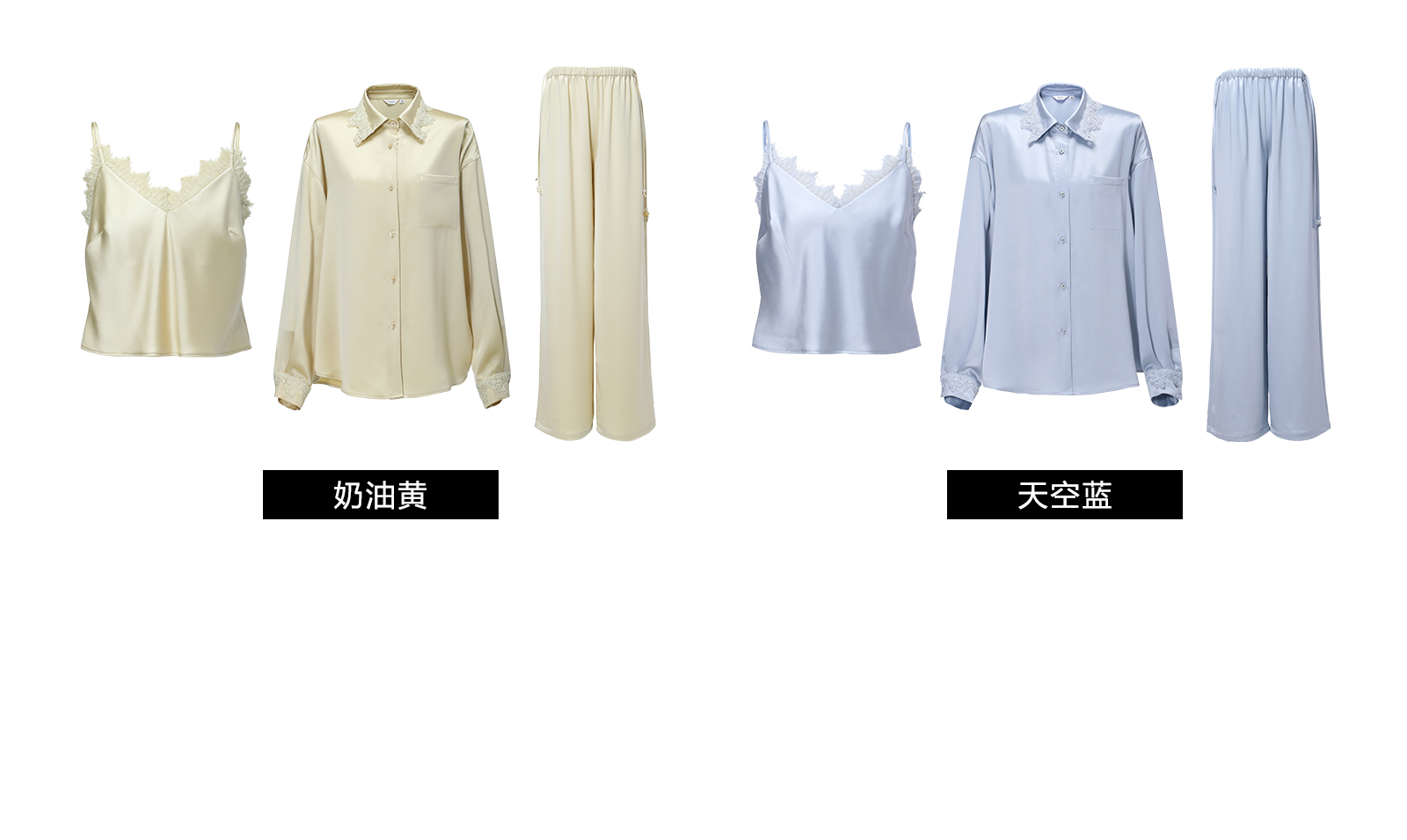 color classification | Cream yellow shirt, cream yellow pants, cream yellow camisole, sky blue shirt, sky blue pants, sky blue camisole |