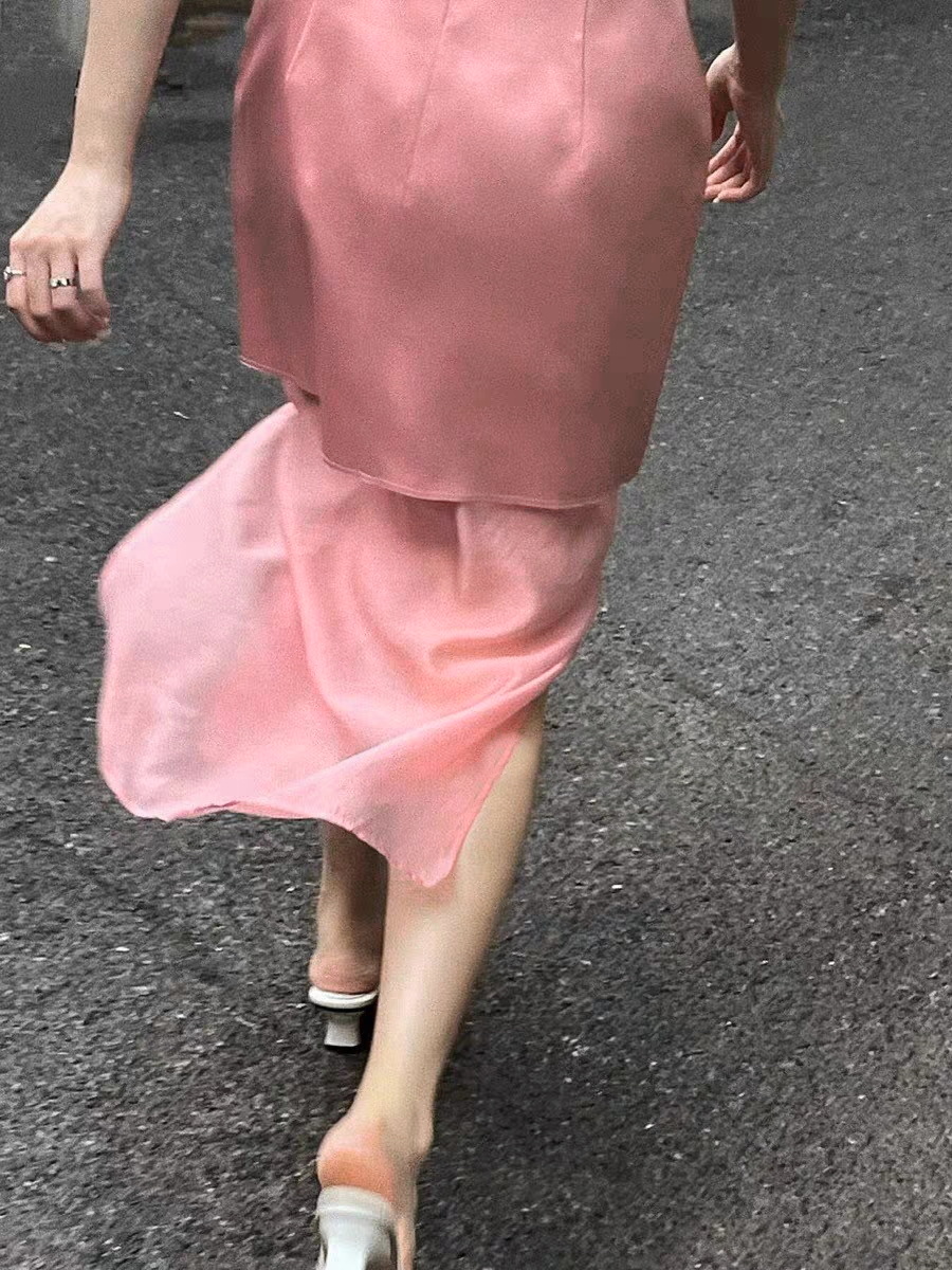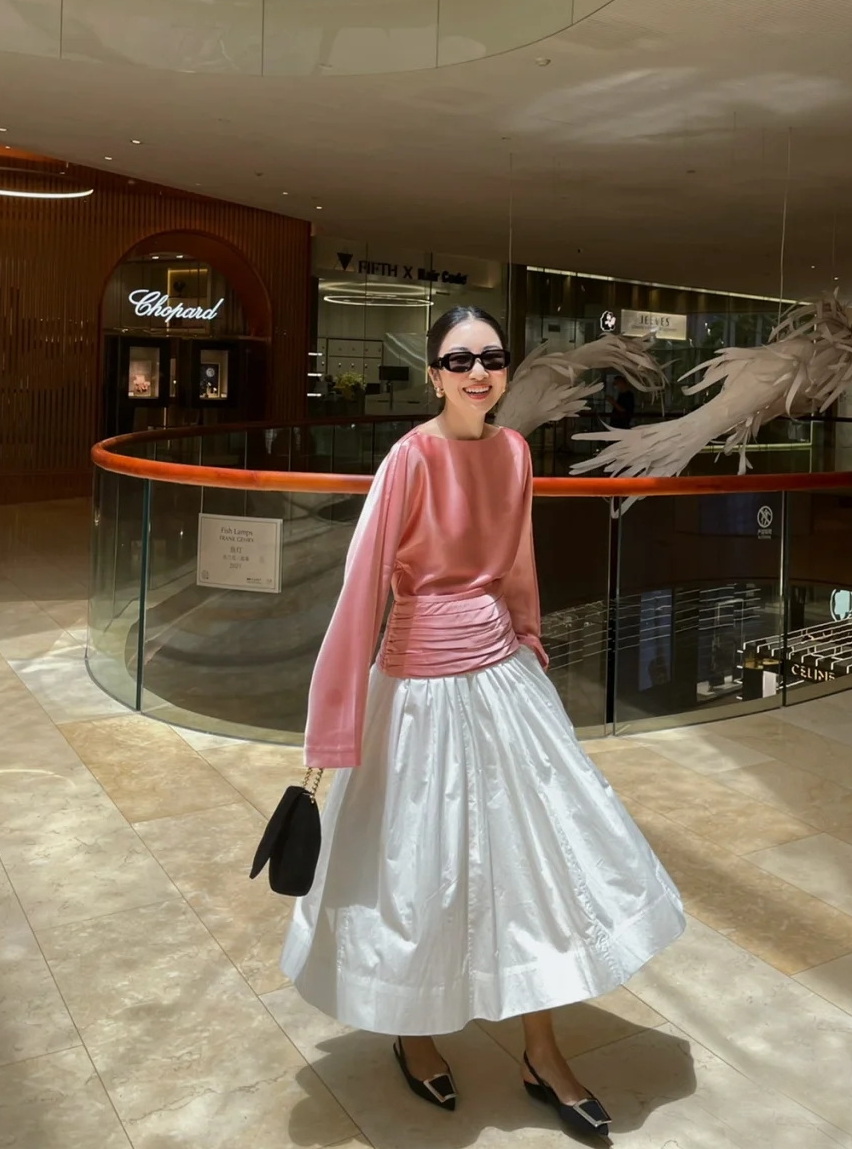 Color classification | Pink top with water sleeves and white skirt |
