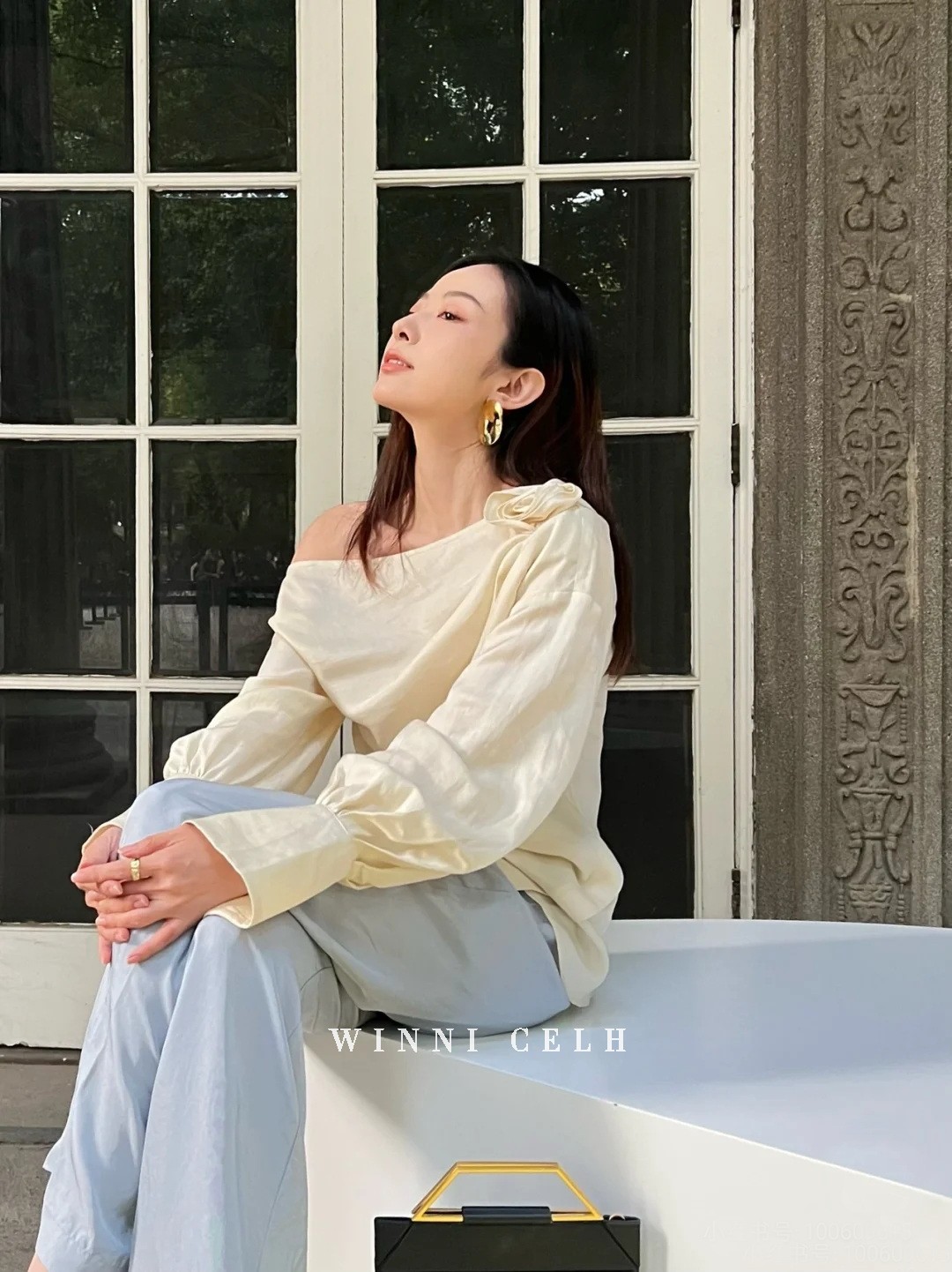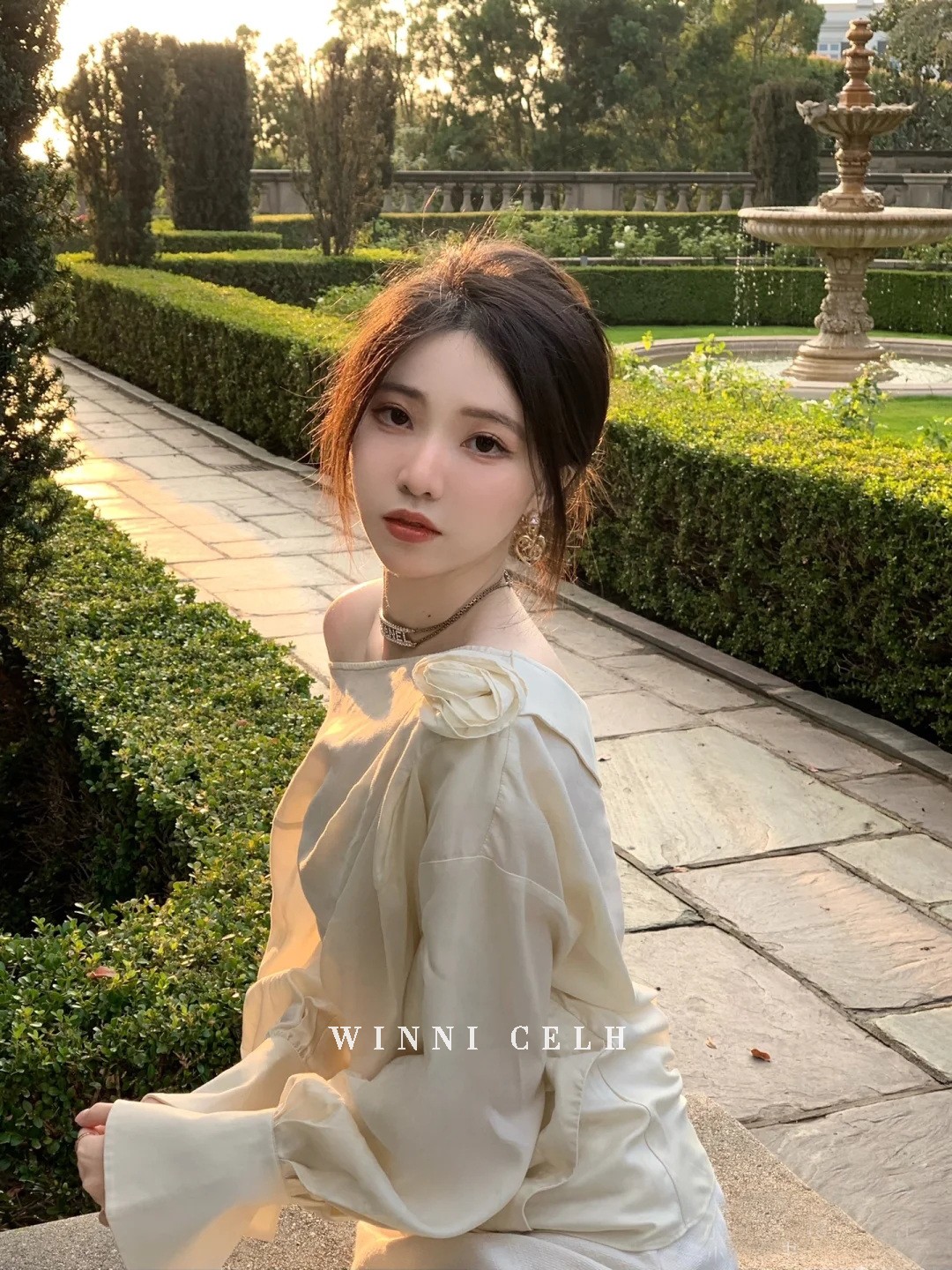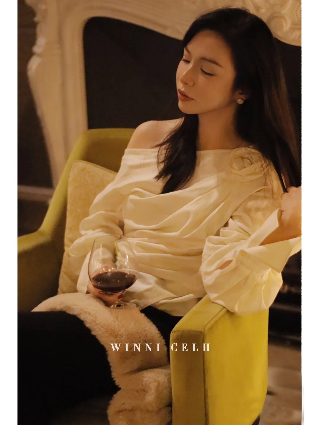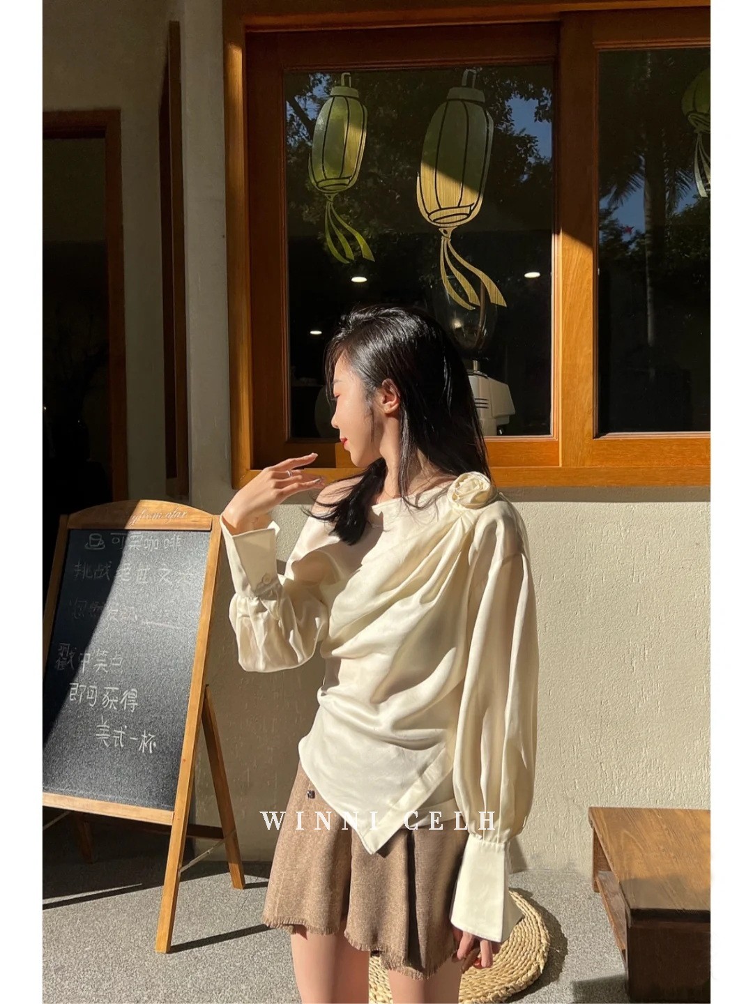 ASAYA2767 Niche rose flower oblique shoulder off-shoulder shirt long-sleeved women’s top