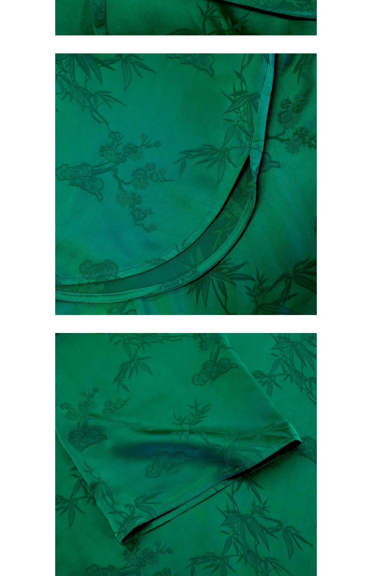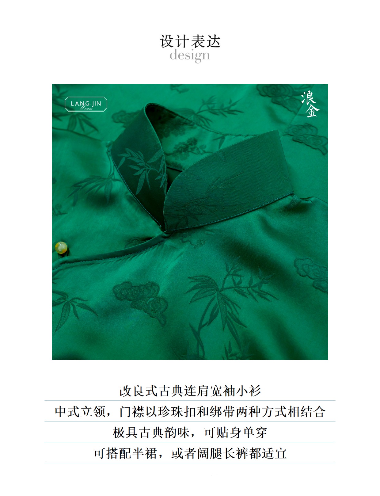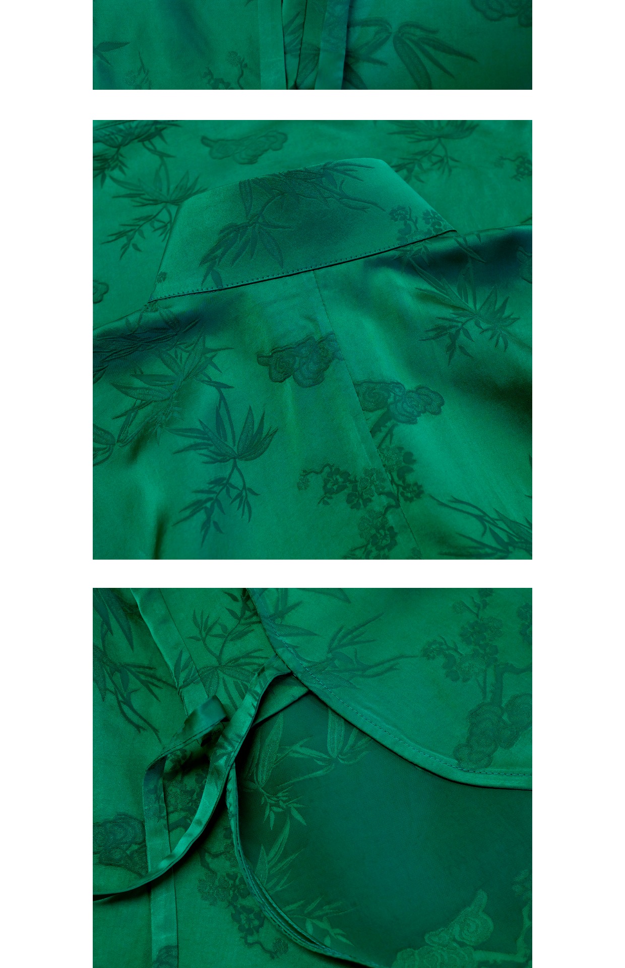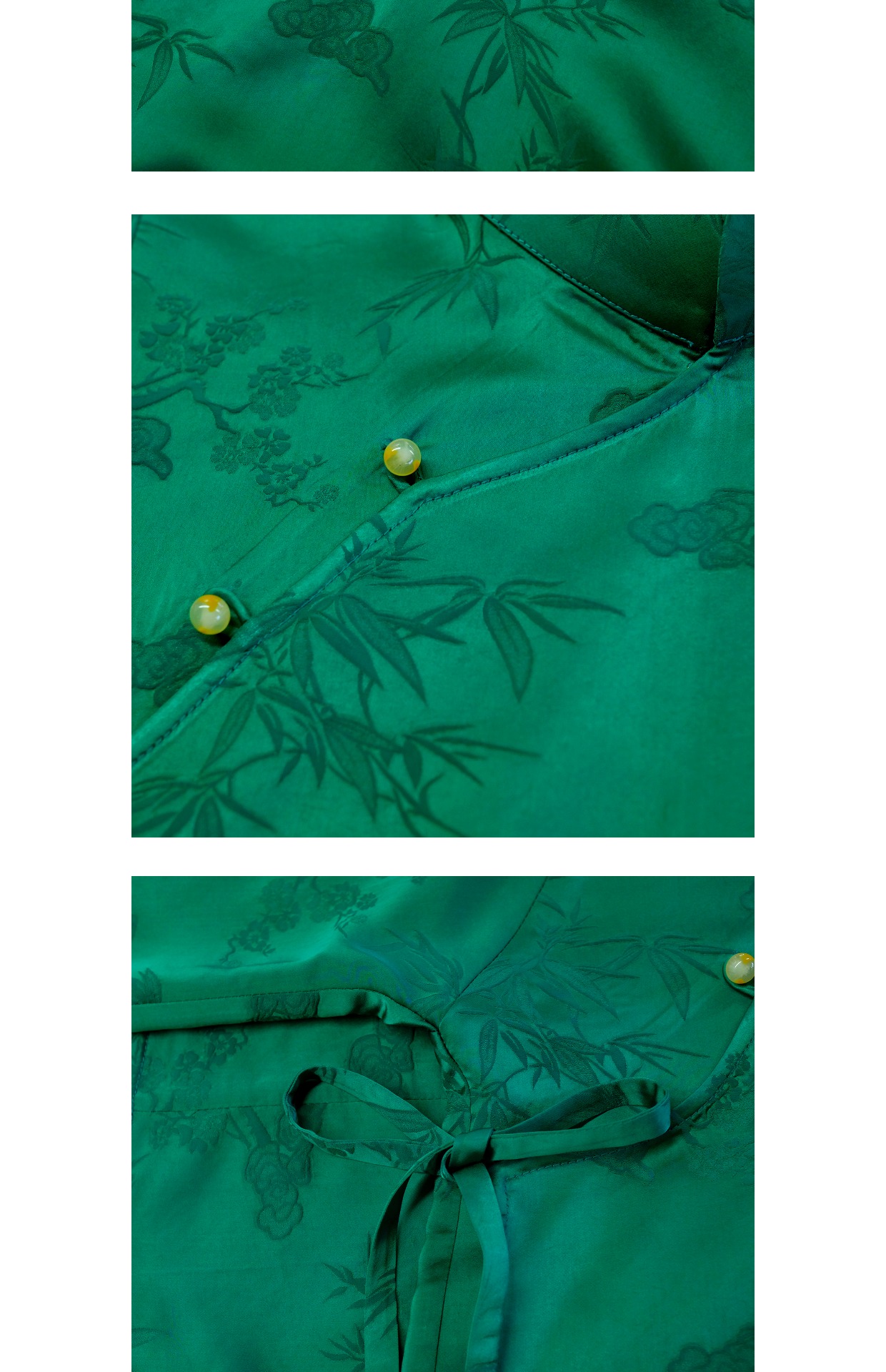 Asaya1351 - Women s cheongsam top with stand up collar jacquard pattern and side ties Chinese retro shirt summer green oblique lapel langjin gold