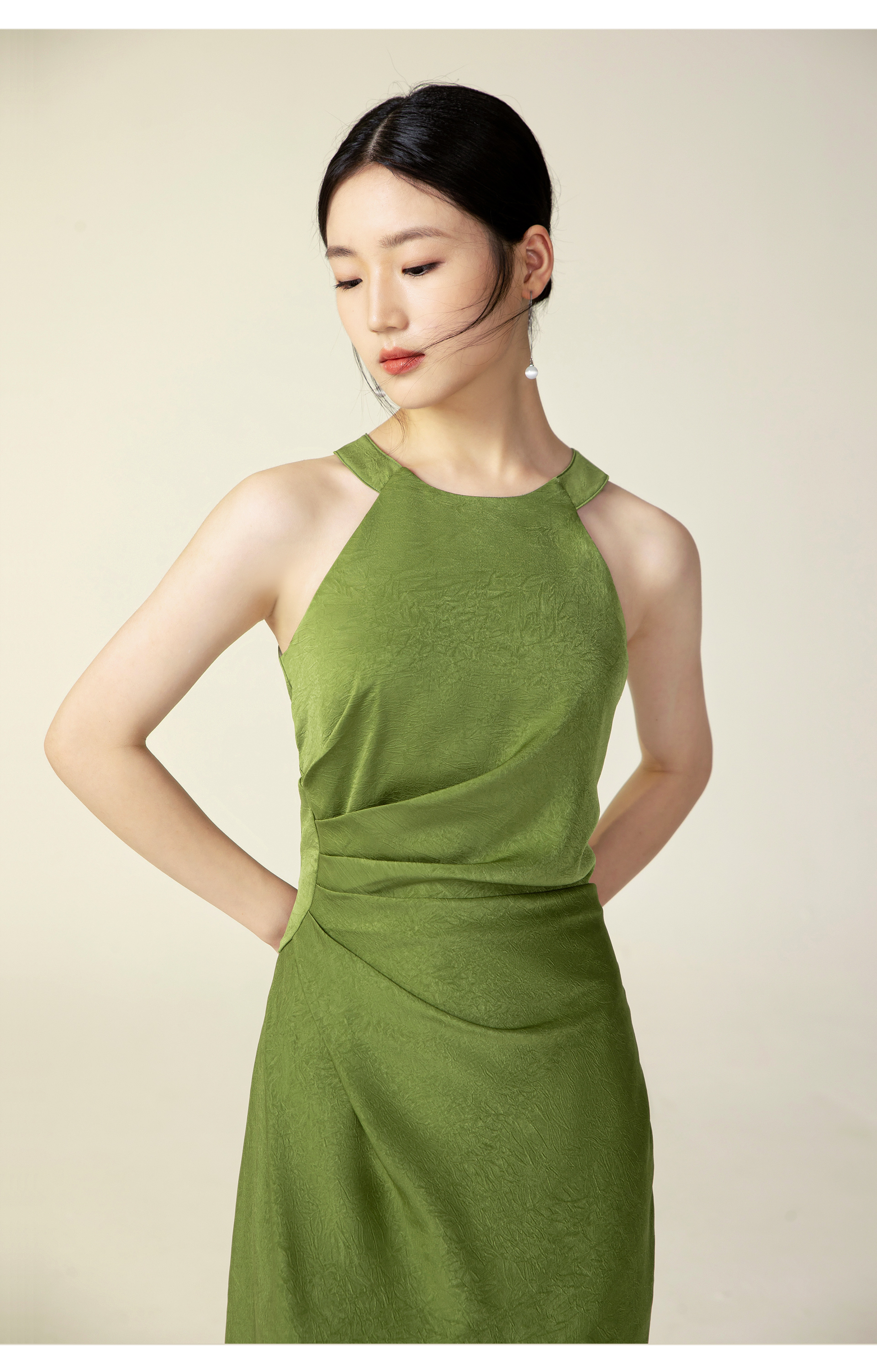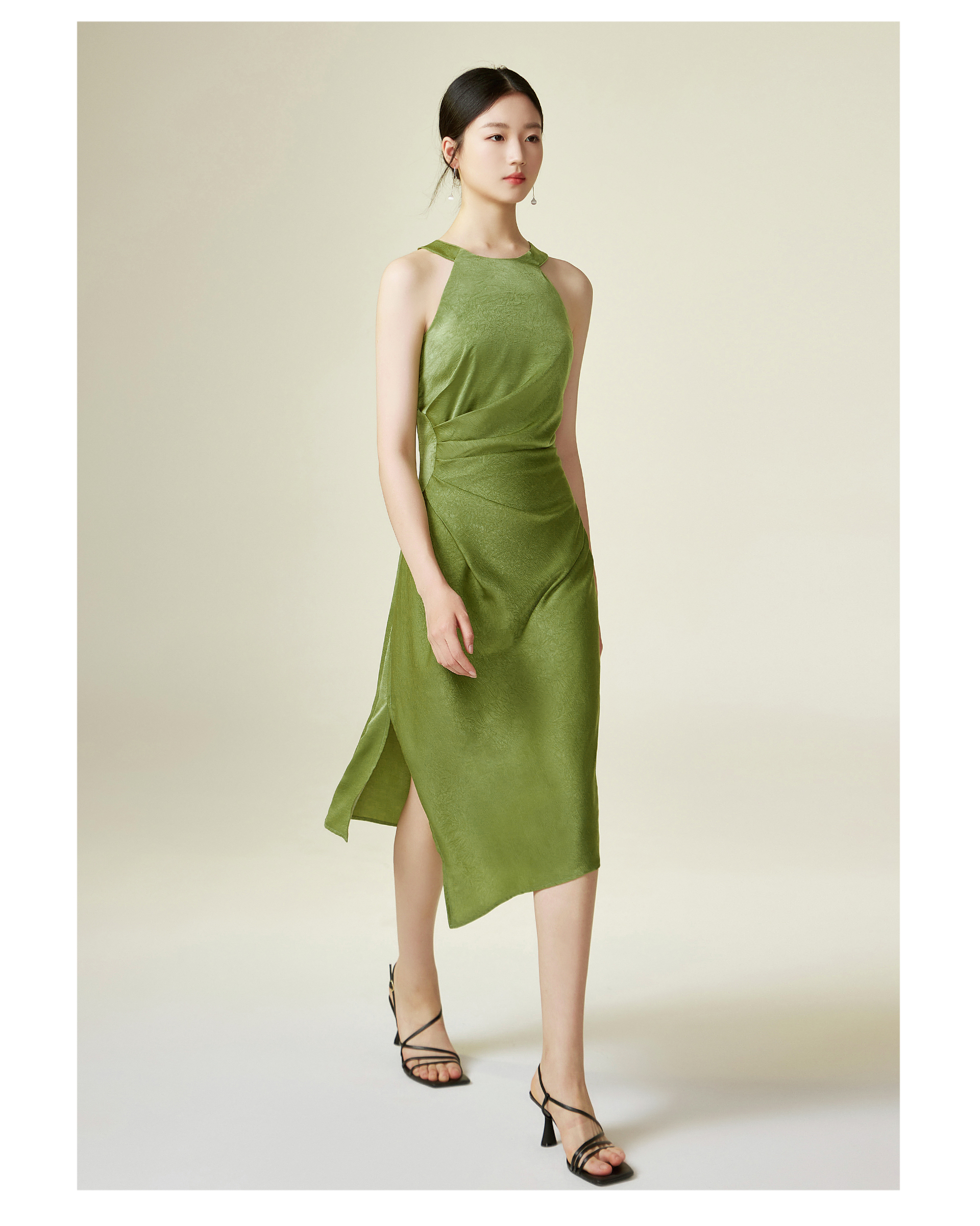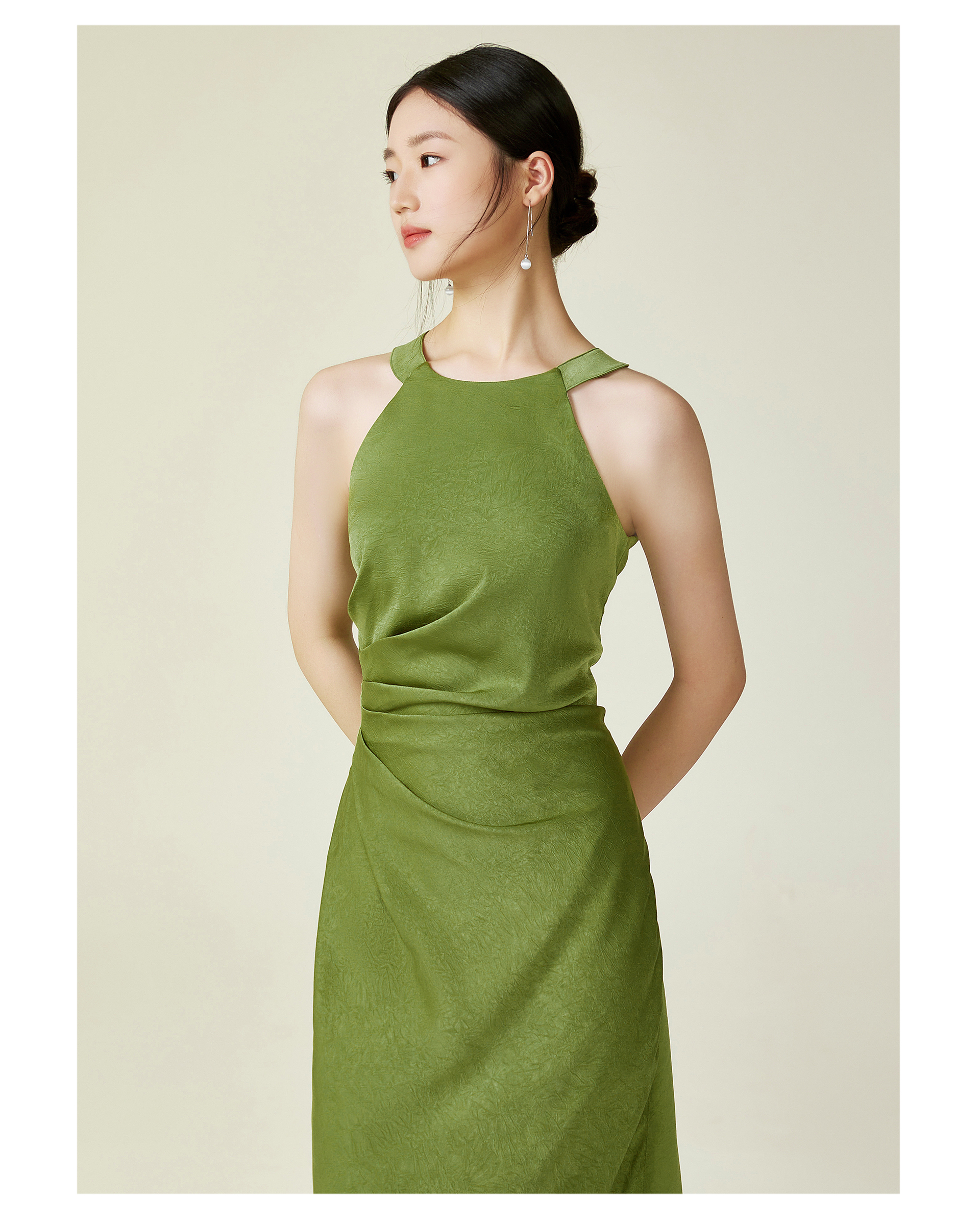 ASAYA2987 Simple design pleated waist slimming halterneck sleeveless dress
