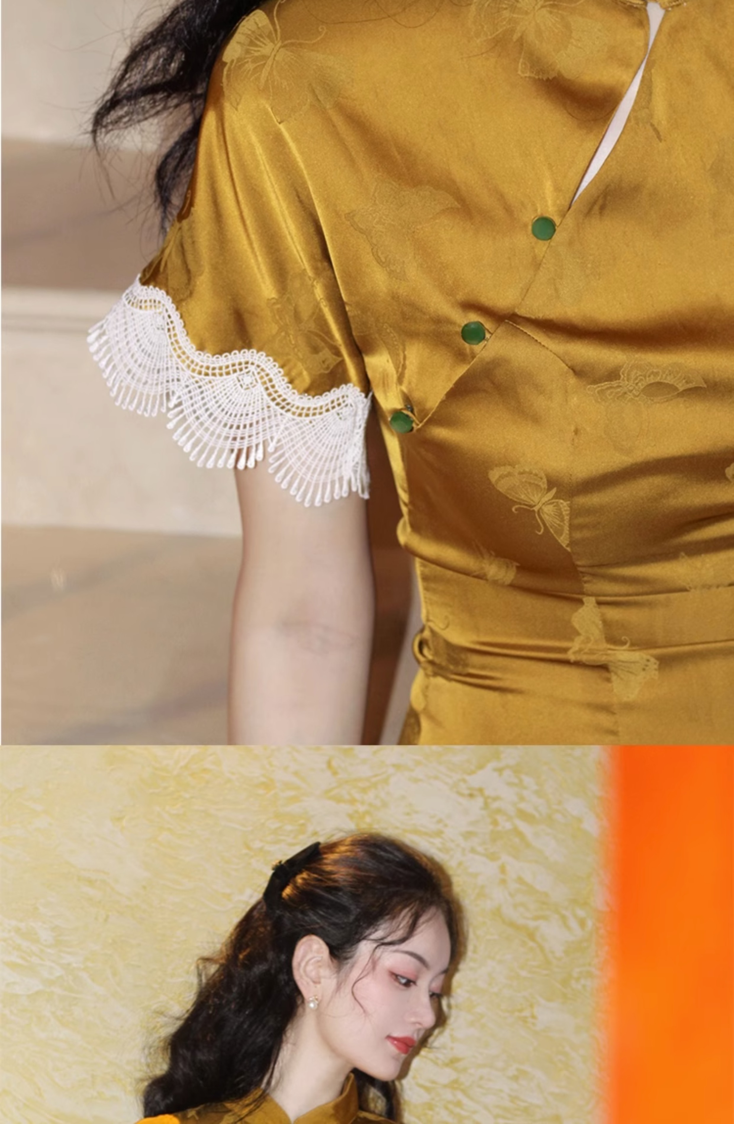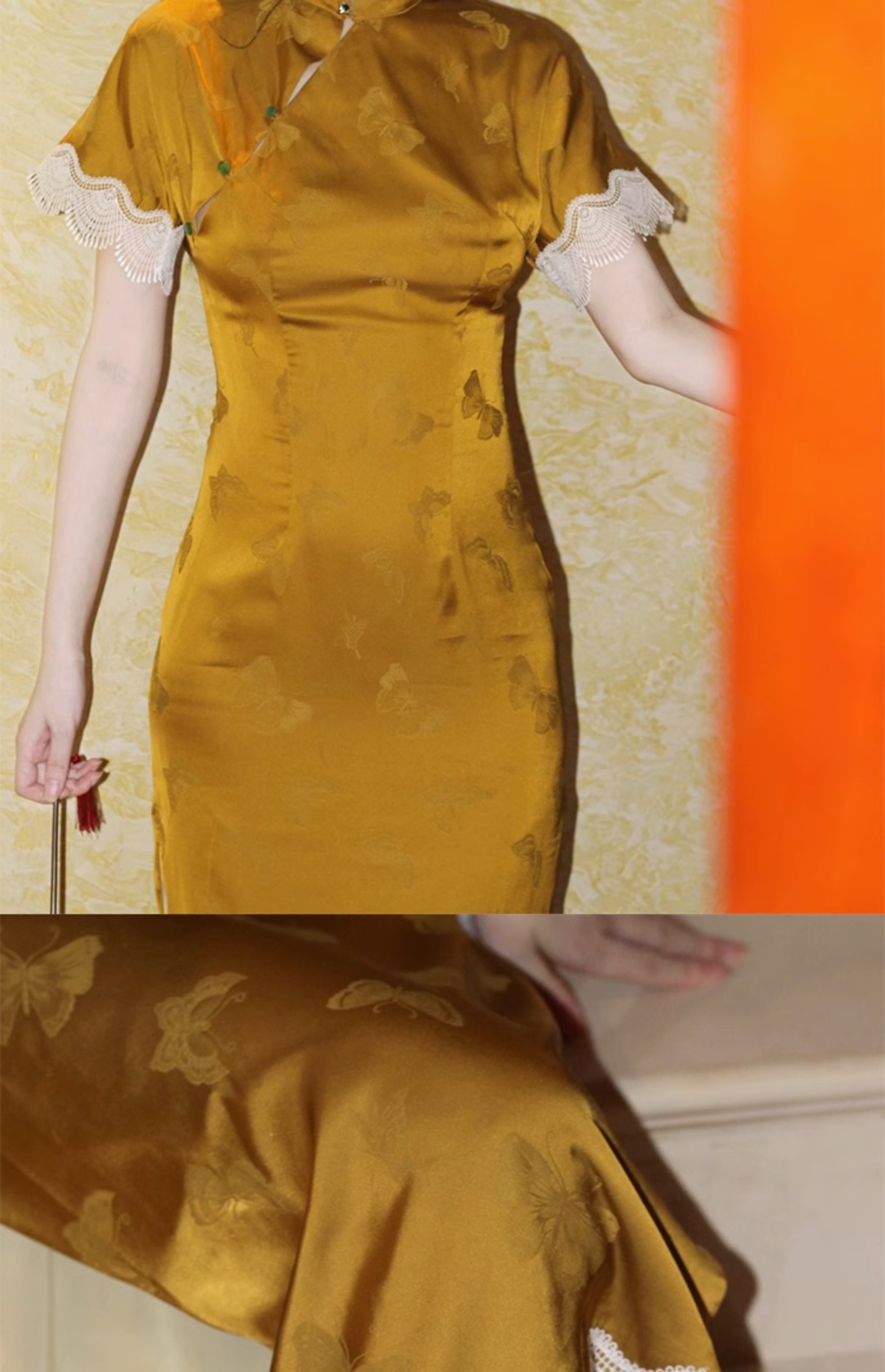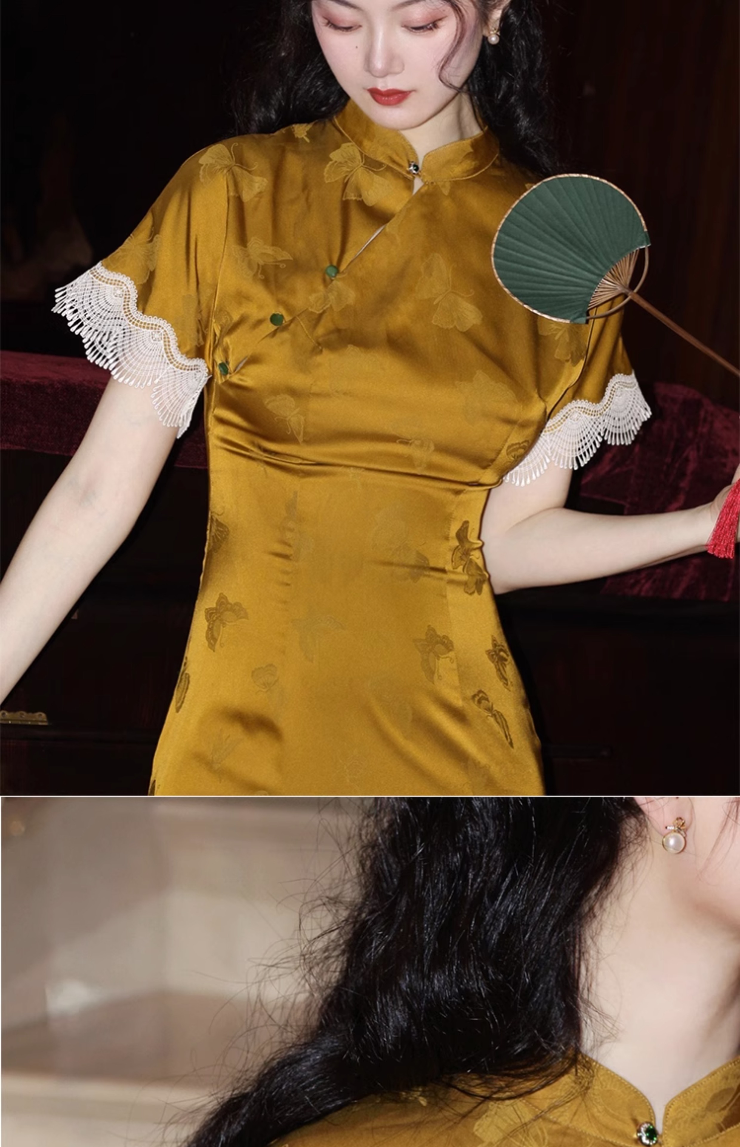 Asaya1238 -yellow long lace silk satin cheongsam morning gown